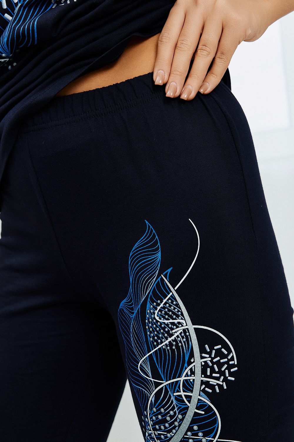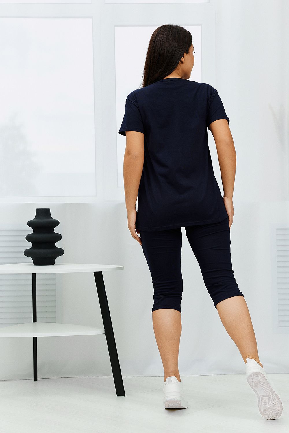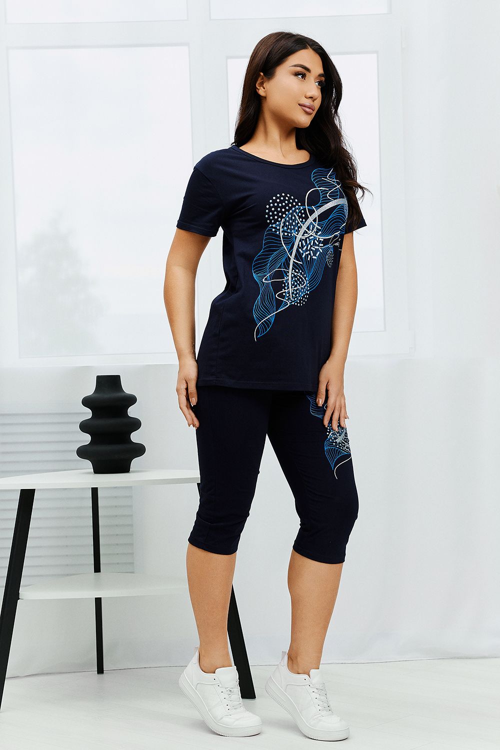 Костюм женский из кулирного полотна состоит из футболки и бриджей. Футболка прямой силуэт, горловина круглая, рукав короткий втачной, низ изделия обработан на плоскошовной машине, на полочке принт. Бриджи - прямые, верх на резинке, низ обработан на плоскошовной машине.