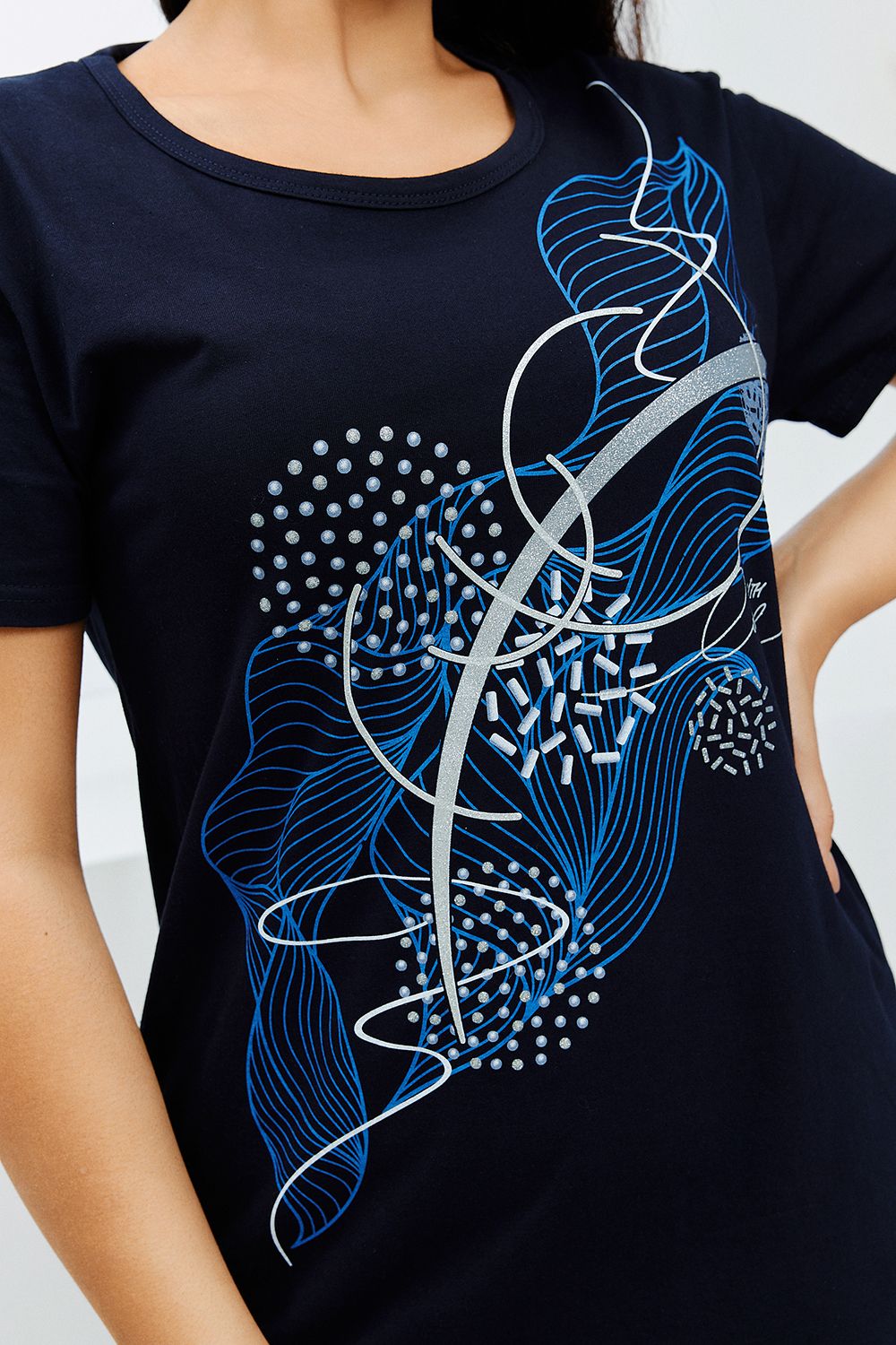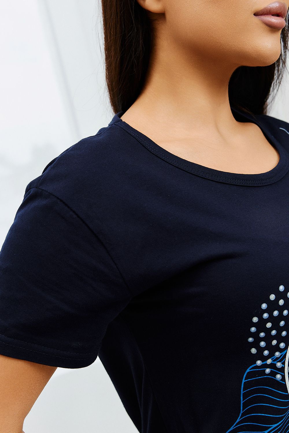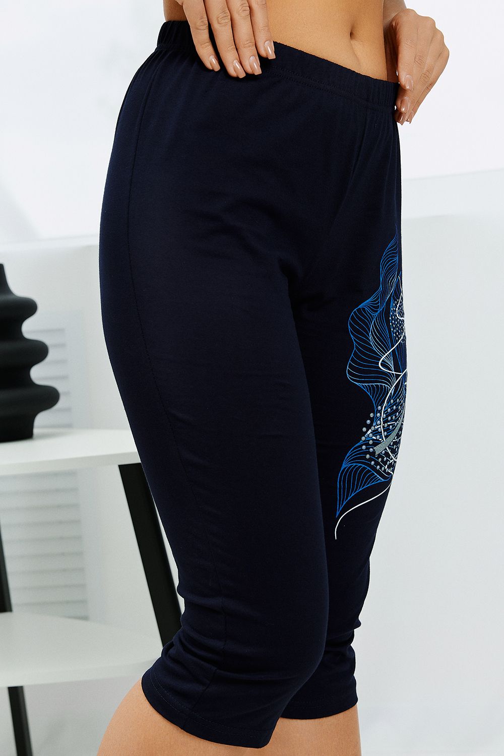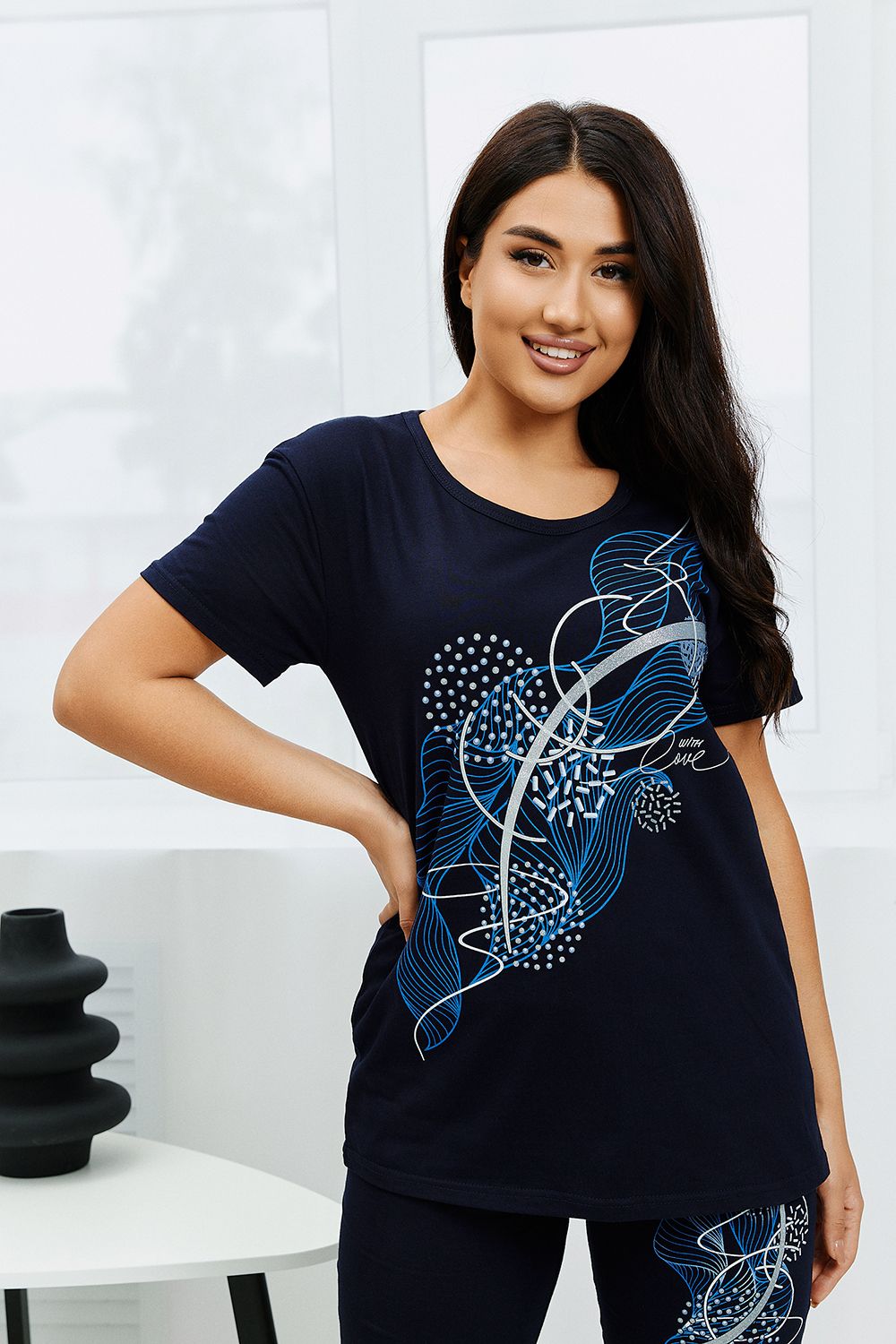 Костюм женский из кулирного полотна состоит из футболки и бриджей. Футболка прямой силуэт, горловина круглая, рукав короткий втачной, низ изделия обработан на плоскошовной машине, на полочке принт. Бриджи - прямые, верх на резинке, низ обработан на плоскошовной машине.