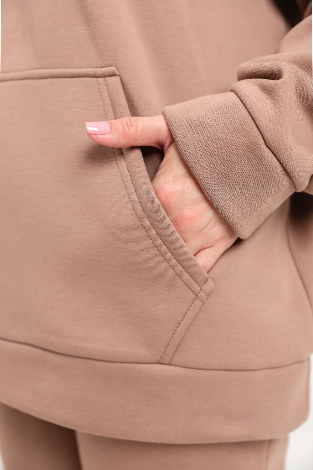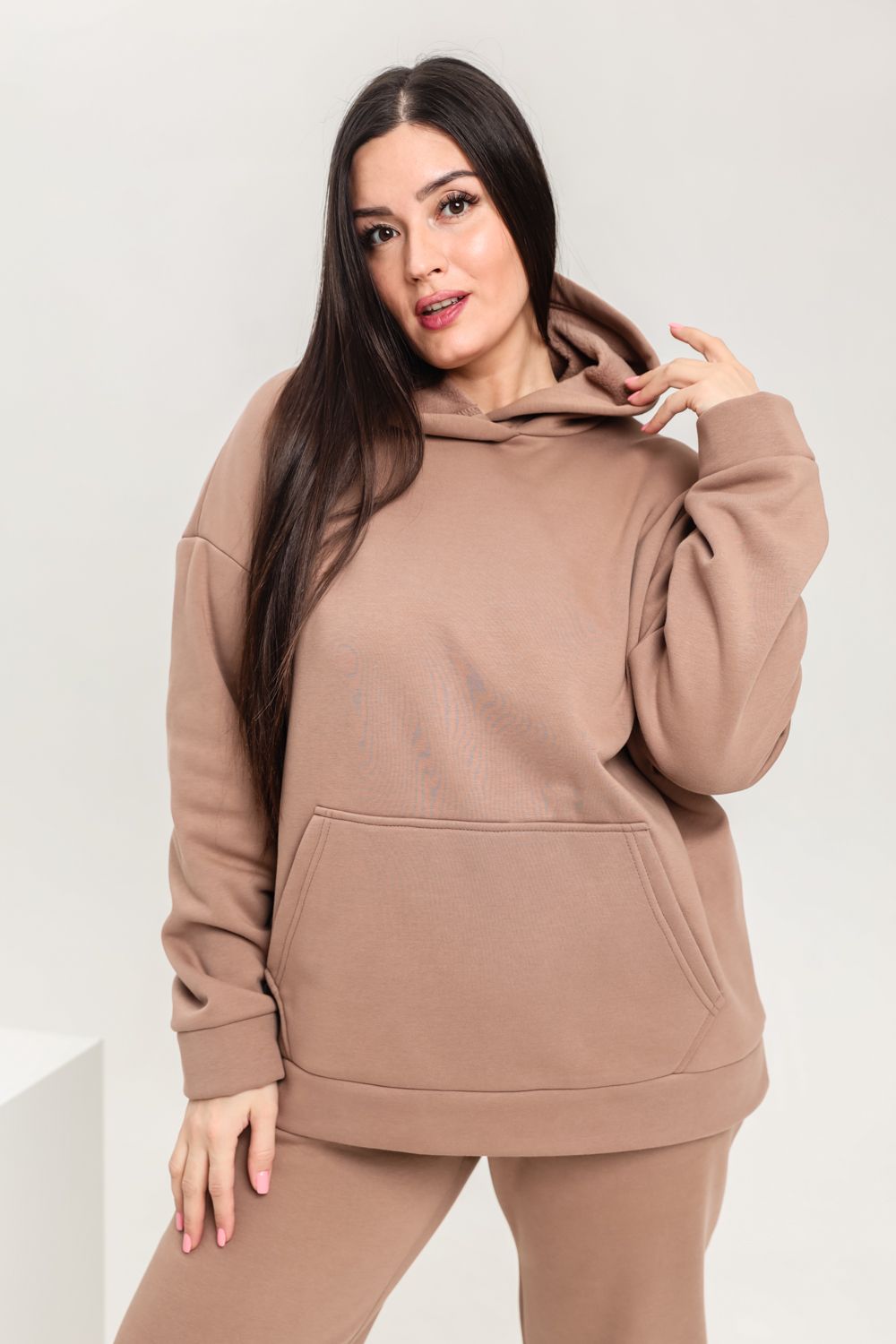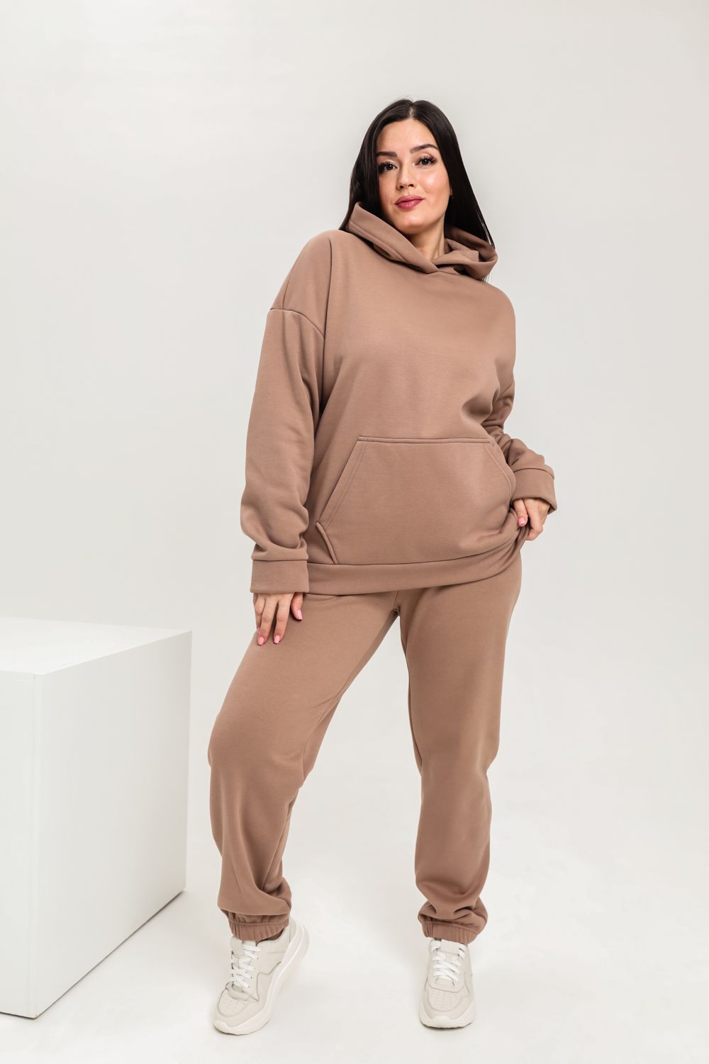 Костюм женский теплый из ткани интерсофт-начес. Толстовка костюма "OVERSIZE" с капюшоном и карманом кенгуру, брюки костюма с прорезными карманами и резинками внизу, резинка брюк прострочена на поясной пятиигольной машине. Идеальный вариант для холодной погоды.