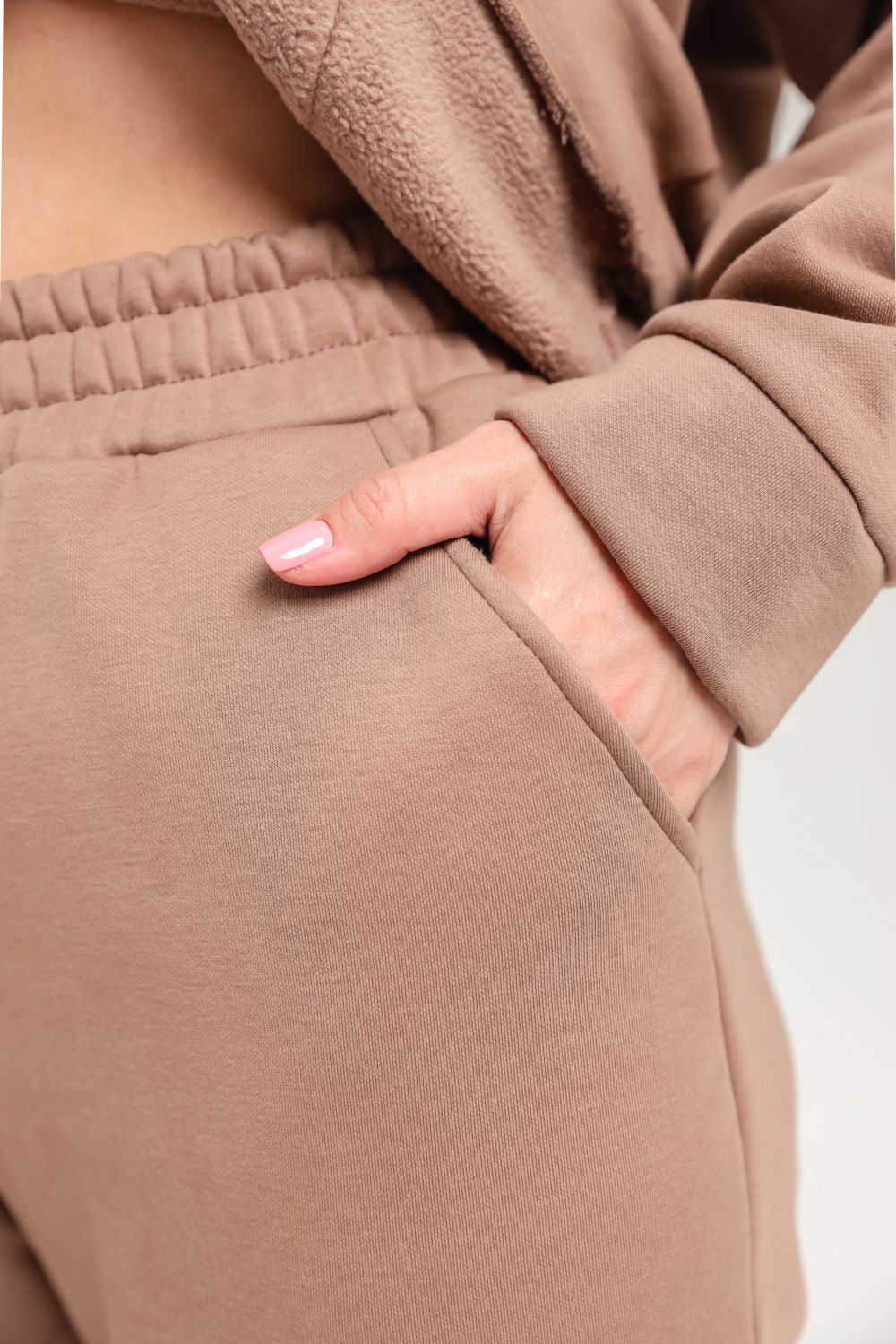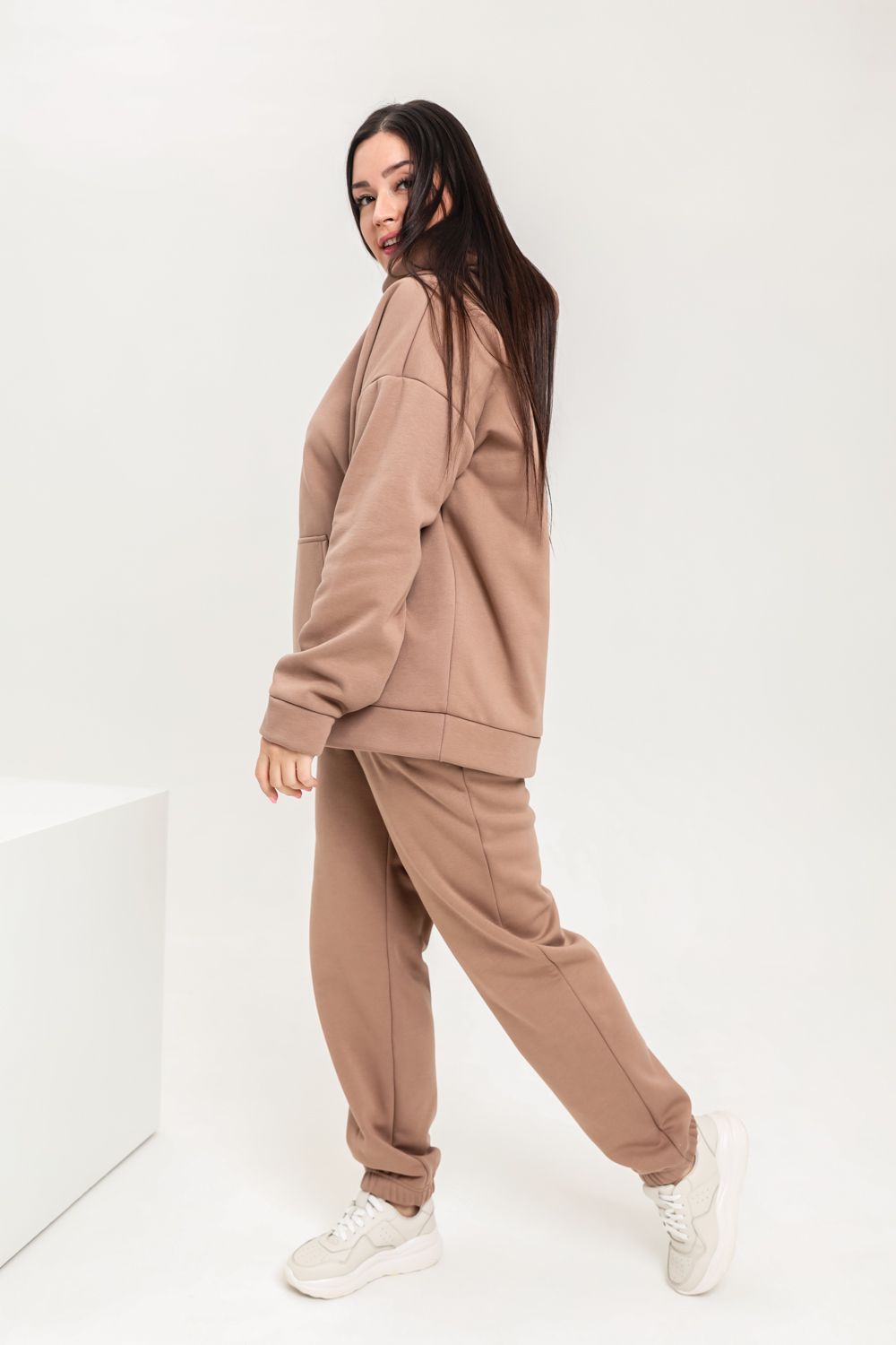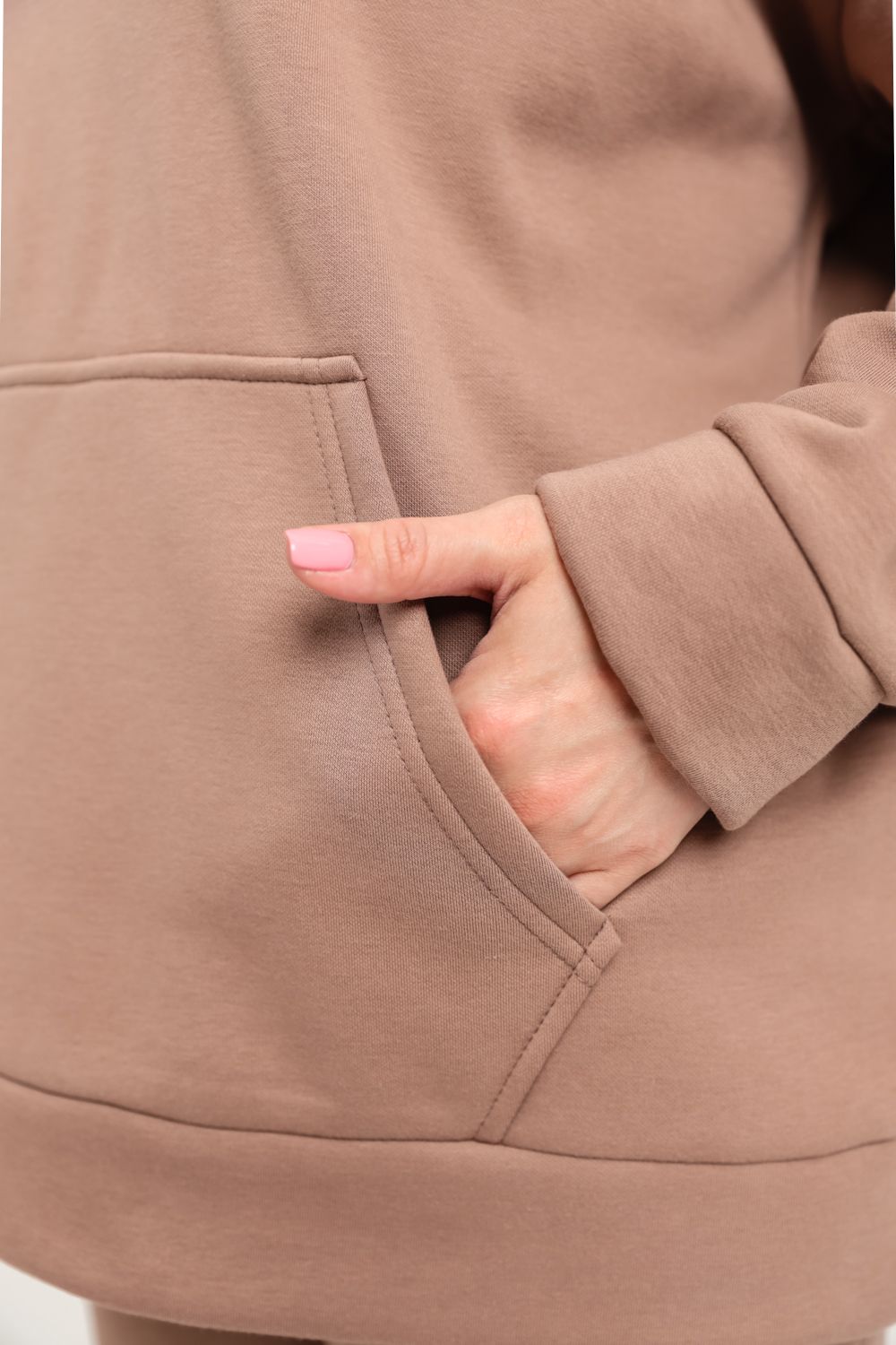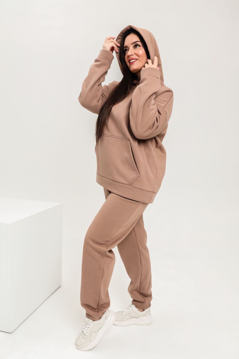 Костюм женский теплый из ткани интерсофт-начес. Толстовка костюма "OVERSIZE" с капюшоном и карманом кенгуру, брюки костюма с прорезными карманами и резинками внизу, резинка брюк прострочена на поясной пятиигольной машине. Идеальный вариант для холодной погоды.