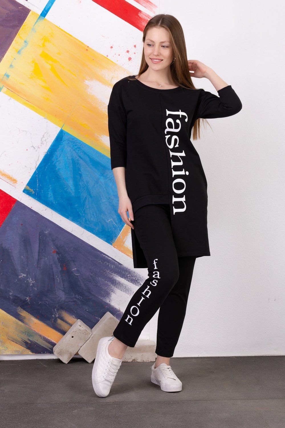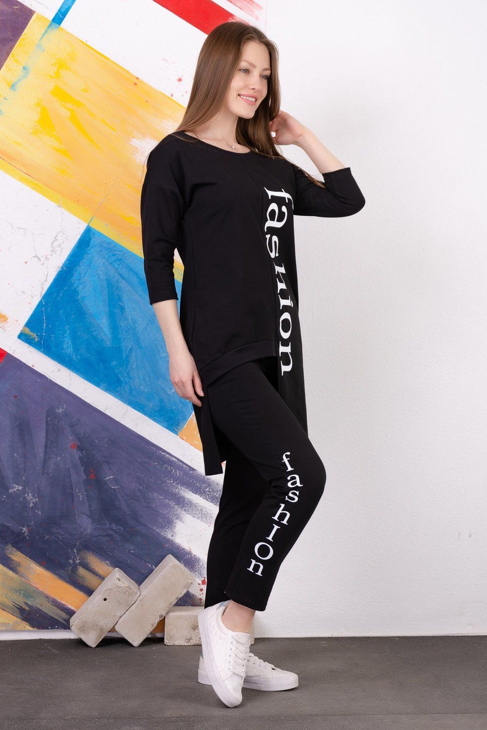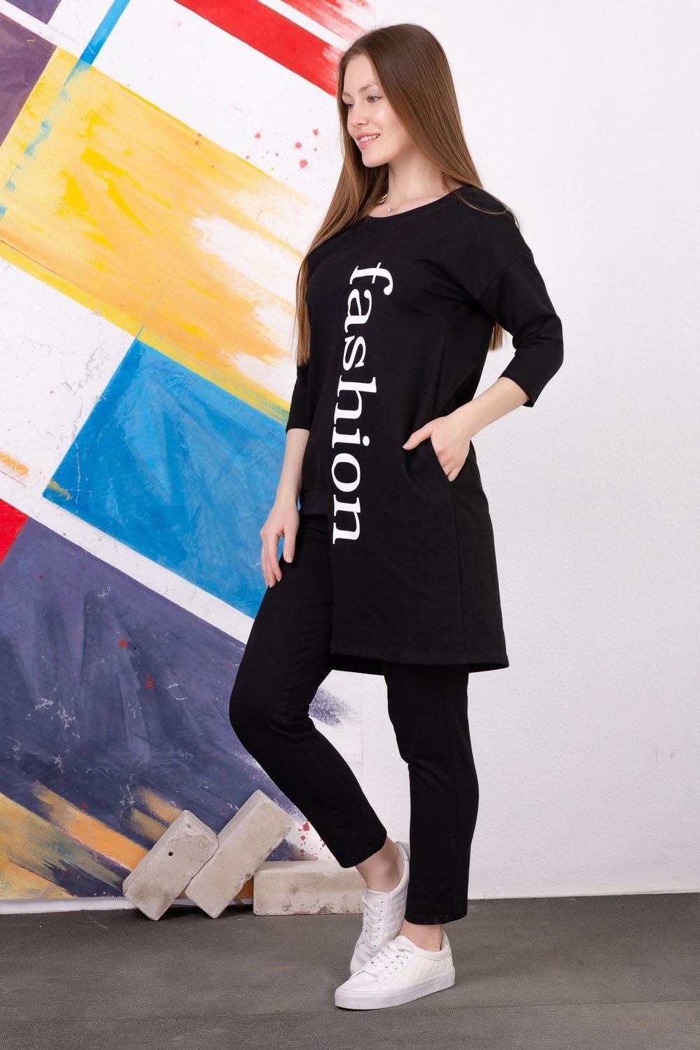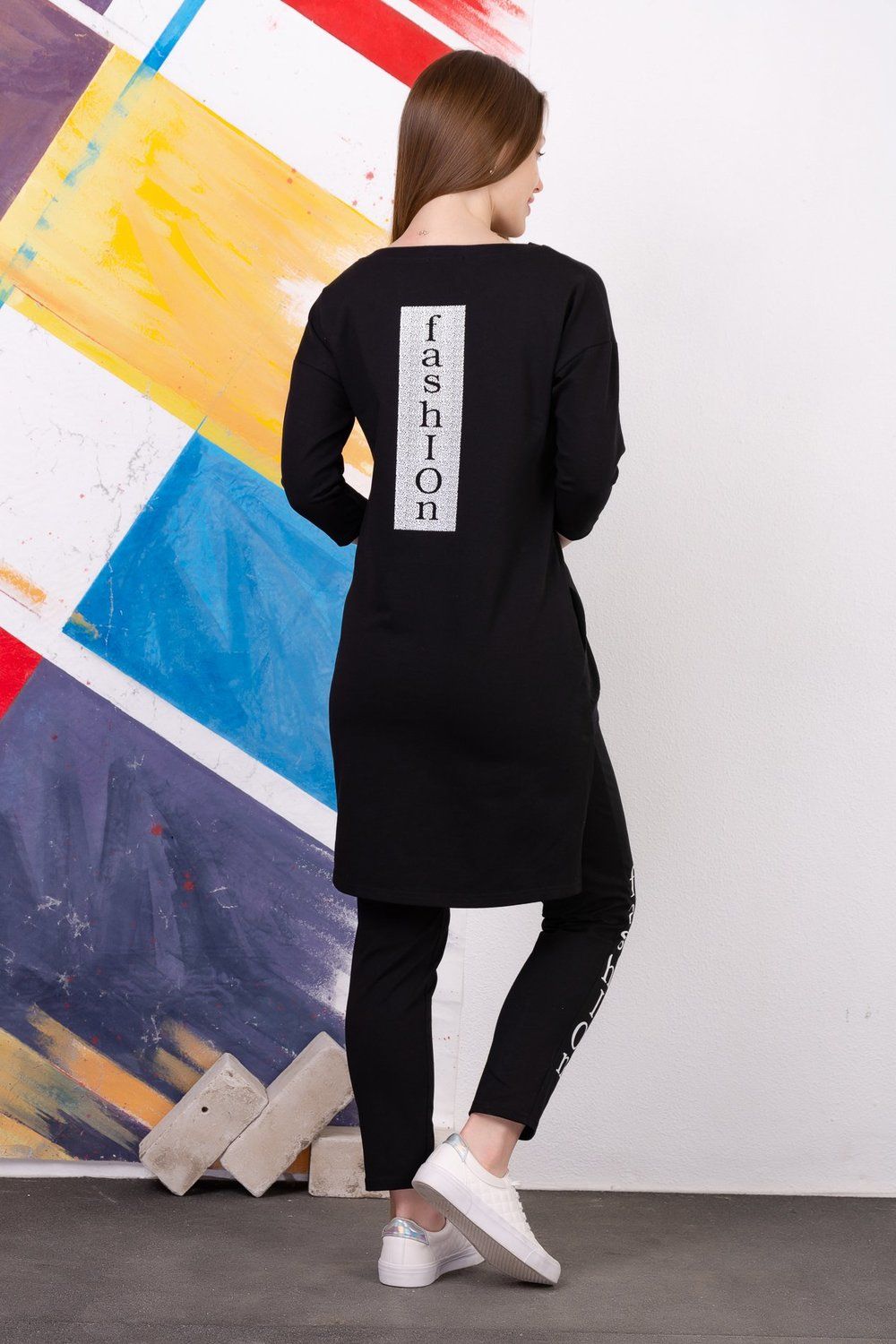 Стильный трикотажный костюм-двойка в стиле спорт шик. Удлиненная туника с потайными карманами, спереди на правой полочке косой срез до бедра. Горловина обработана рибаной. Рукава 3/4. Брючки укороченные, без карманов. Пояс на резинке.