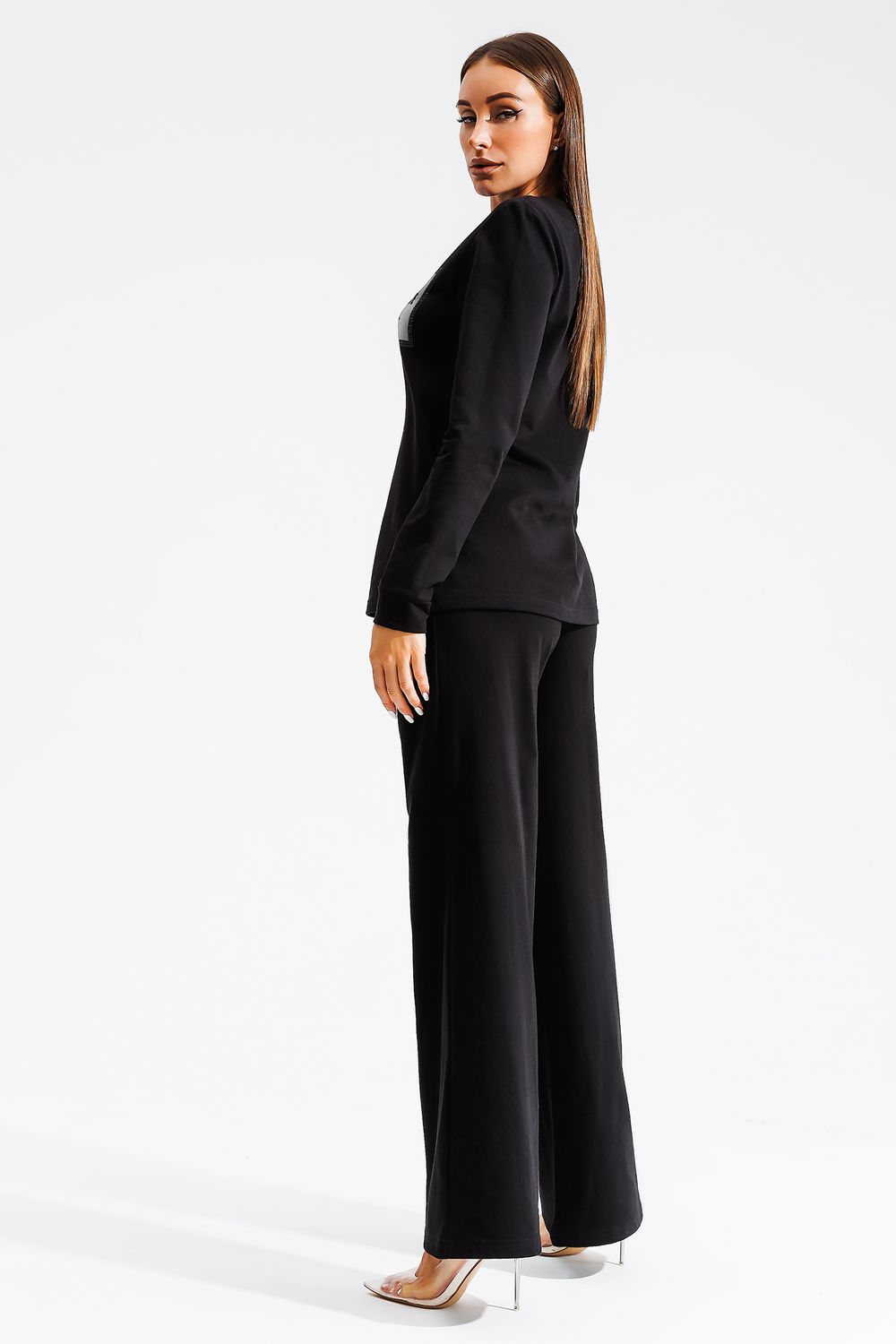 Костюм женский из футера 2 нитки, состоит из туники и брюк. Туника полуприлегающего силуэта, длиной до бедер, рукав втачной, длинный, с манжетой по низу. Горловина округлой формы с обтачкой. По переду нанесен дизайнерский принт. Брюки прямые, свободные, длинные. Притачной пояс на резинке, внутренние боковые карманы с наклонным входом.