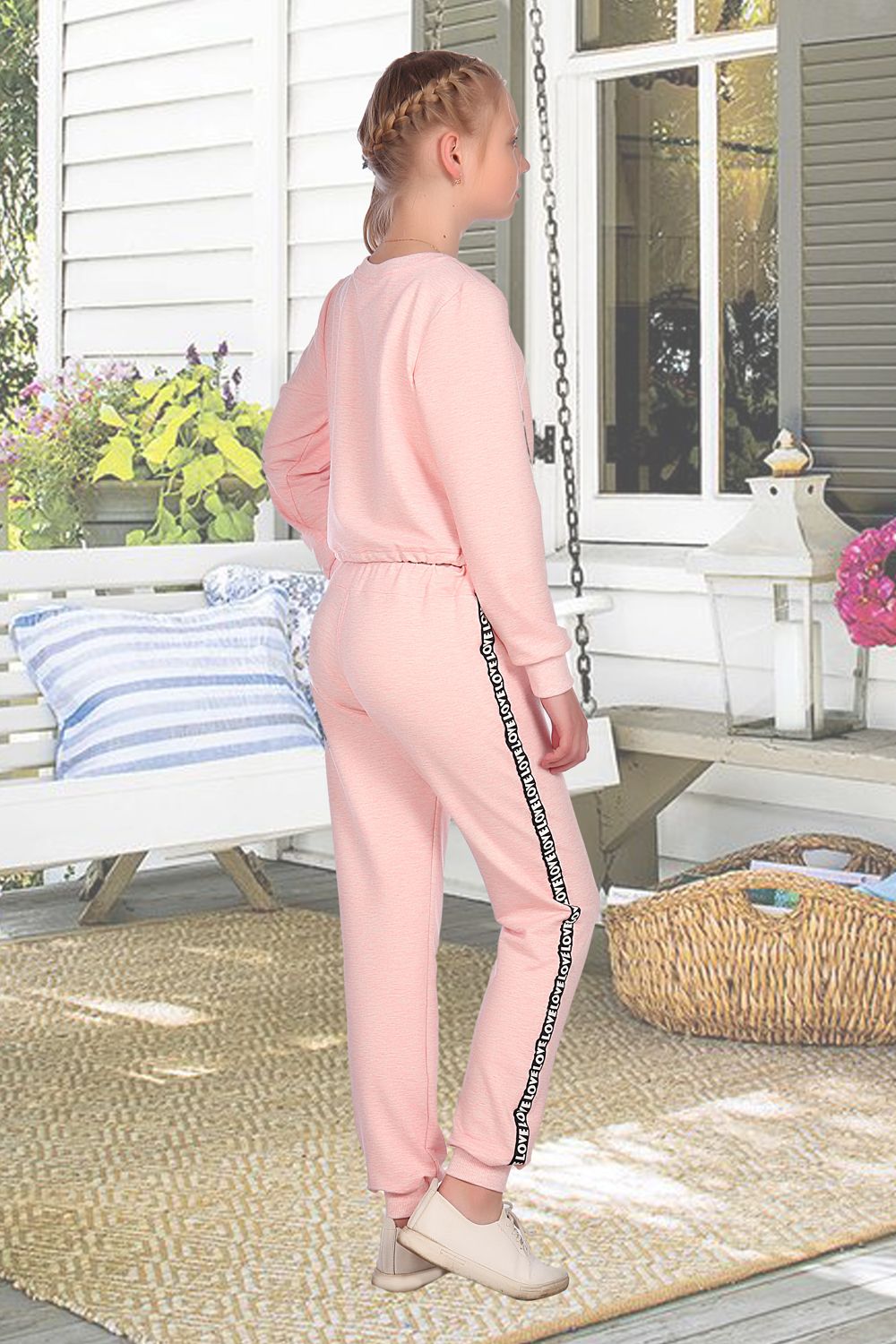 Молодежный костюм из футера. Брюки прилегающего силуэта на манжете. Кофта укороченная с декором в виде кармана. Низ регулируется шнурком. Для отделки использована лента с надписью.