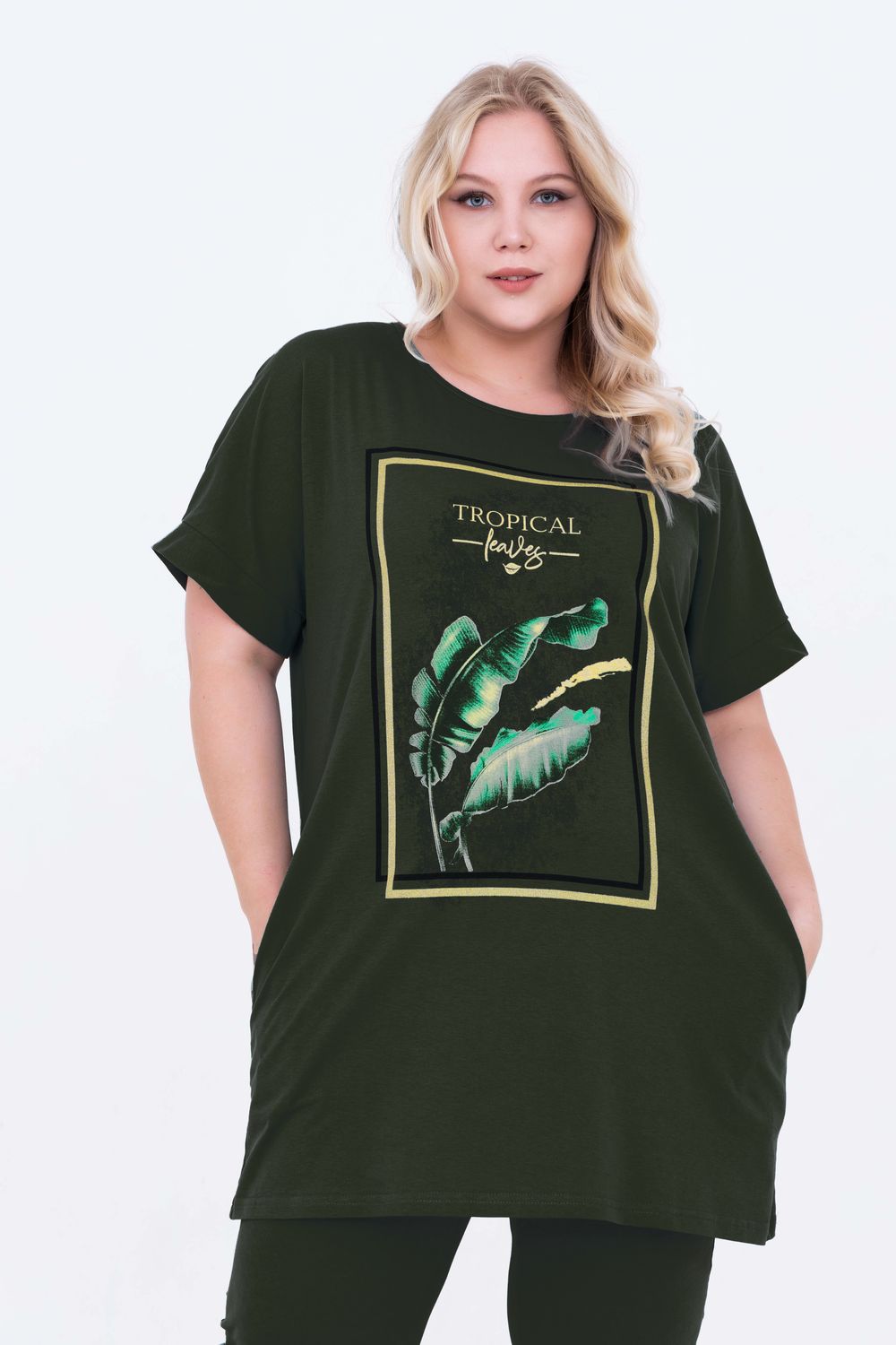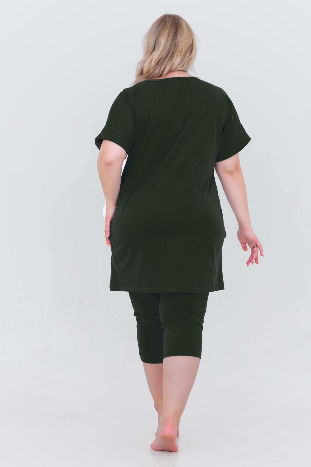 Домашний костюм женский изготовлен из ткани кулирка - мягкого и гладкого трикотажного полотна из хлопка. Костюм женский для дома и отдыха состоит из удлиненной футболки и бридж. Футболка прямого кроя, горловина круглая, обработана окантовкой, по бокам карманы. Рукав короткий. На полочке выполнен принт. За счет свободного кроя, брюки очень удобны и комфортны в эксплуатации.