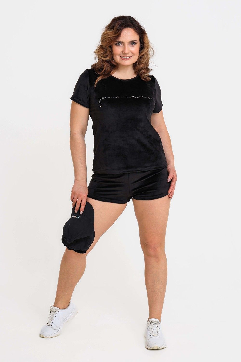 Костюм женский из велюра. В комплект входят: футболка с коротким рукавом с округлым вырезом горловины и шорты прямого покроя с широким поясом на резинке. Мягкий трикотажный комплект для женщин Российского производства. Стильный костюм из стрейч - велюра для женщин представлен в широкой размерной сетке: от маленького 42 размера до 52 размера. Удобный домашний велюровый комплект не сковывает движений, что делает его универсальной одеждой, которая подойдет на любую фигуру как для худеньких, стройных, так и для пышных девушек и женщин. Костюм двойка женский подходит на любой рост: для высоких и для невысоких. Однотонный костюм с шортами выполнен в спокойных и практичных темных тонах. Бархатный комплект из трикотажной ткани не сковывает движения, скрывает недостатки и подчеркивает достоинства фигуры. Классические прямые шорты без манжета, имеют комфортную посадку. Эластичная резинка на шортах не давит, не перетягивает талию, не скручивается. Текстильный костюм из велюра не мнется, не дает усадку после стирок, не теряет цвет, сохраняет форму и внешний вид. Молодежный комплект подходит для девочек, подростков, молодых женщин, а также для женщин любого возраста, желающих модно выглядеть в домашней обстановке. Легкий летний спортивный костюм позволяет коже дышать за счет хорошей воздухопроницаемости, а гипоаллергенная ткань высокого качества долго не потеряет своих характеристик. Шорты и футболку по Вашему желанию по отдельности можно комбинировать с другими предметами одежды. Костюм отлично зарекомендовал себя в эксплуатации, он будет долго радовать Вас при условии соблюдения рекомендаций по уходу за изделием. Тонкий повседневный набор дополнит Ваш домашний гардероб и будет комфортной альтернативой домашнему платью, халату, туники. Размер на модели 48, параметры 105-86-98/169.