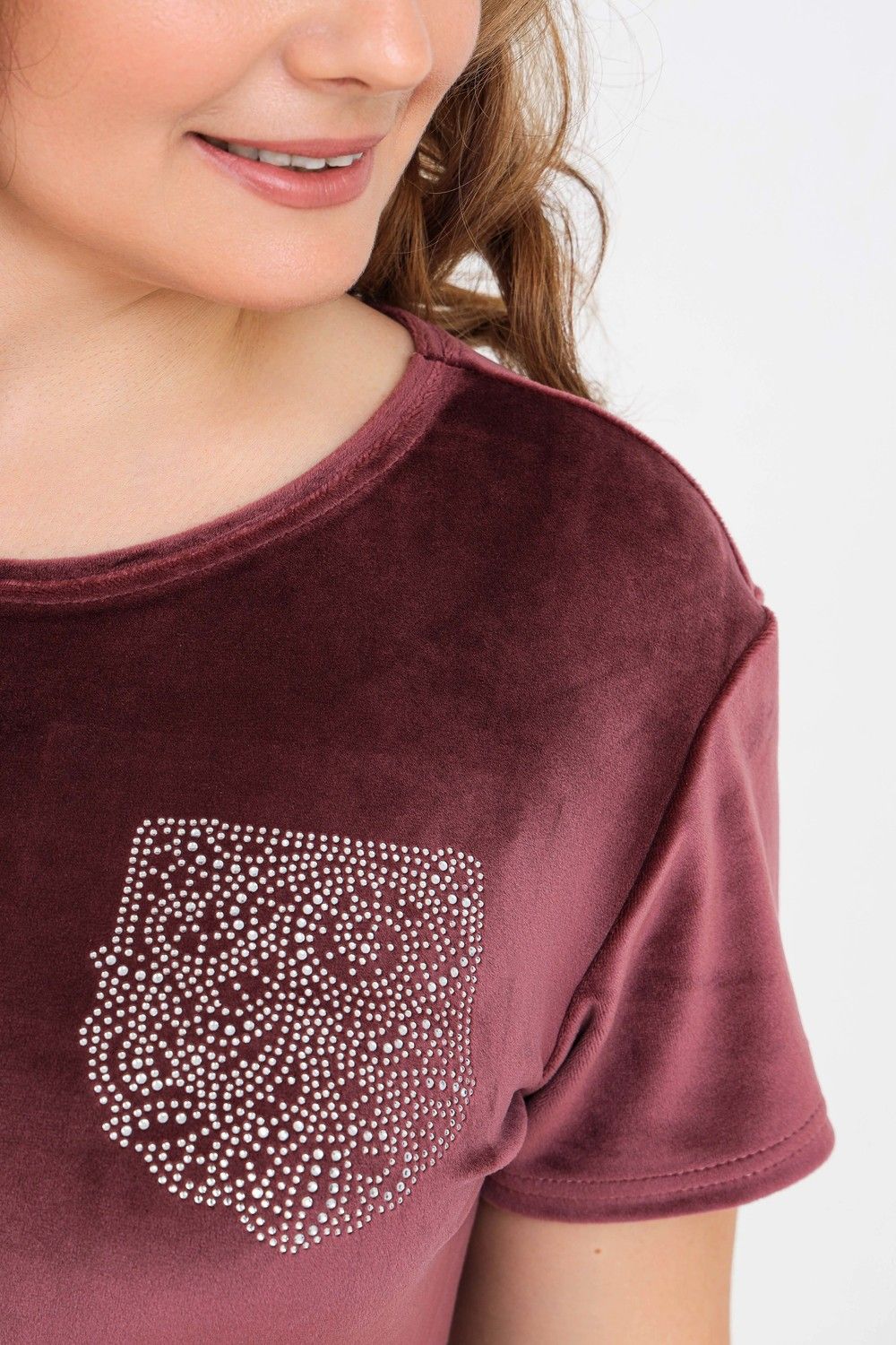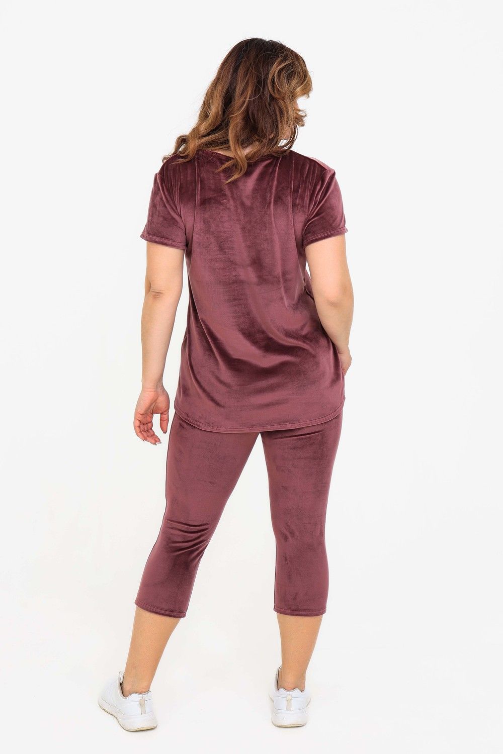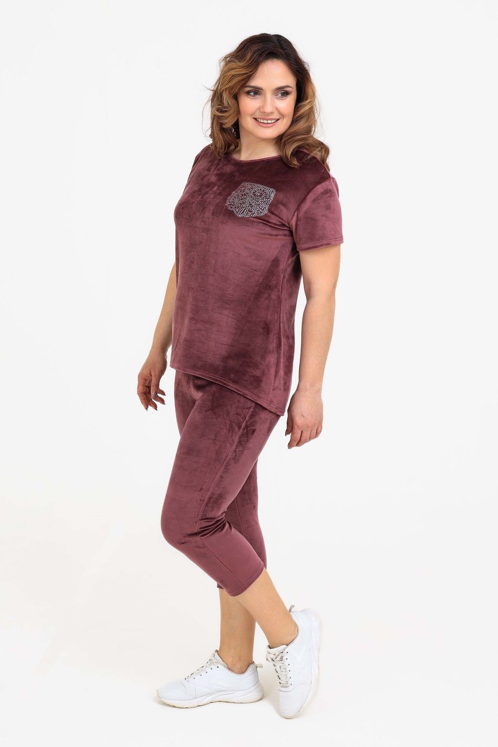 Костюм женский из велюра. В комплект входят:- футболка с коротким рукавом с округлым вырезом горловины и леггинсы. Мягкий трикотажный комплект для женщин Российского производства. Стильный костюм из стрейч - велюра для женщин представлен в широкой размерной сетке: от маленького 42 размера до 52 размера. Удобный домашний велюровый комплект не сковывает движений, что делает его универсальной одеждой, которая подойдет на любую фигуру как для худеньких, стройных, так и для пышных девушек и женщин. Костюм двойка женский подходит на любой рост: для высоких и для невысоких. Однотонный костюм с шортами выполнен в спокойных и практичных темных тонах. Бархатный комплект из трикотажной ткани не сковывает движения, скрывает недостатки и подчеркивает достоинства фигуры. Костюм из велюра не мнется, не дает усадку после стирок, не теряет цвет, сохраняет форму и внешний вид. Молодежный комплект подходит для девочек, подростков, молодых женщин, а также для женщин любого возраста, желающих модно выглядеть в домашней обстановке. Легкий летний спортивный костюм позволяет коже дышать за счет хорошей воздухопроницаемости, а гипоаллергенная ткань высокого качества долго не потеряет своих характеристик. Леггинсы и футболку по Вашему желанию по отдельности можно комбинировать с другими предметами одежды. Костюм отлично зарекомендовал себя в эксплуатации, он будет долго радовать Вас при условии соблюдения рекомендаций по уходу за изделием. Размер на модели 48, параметры 105-86-98/169.