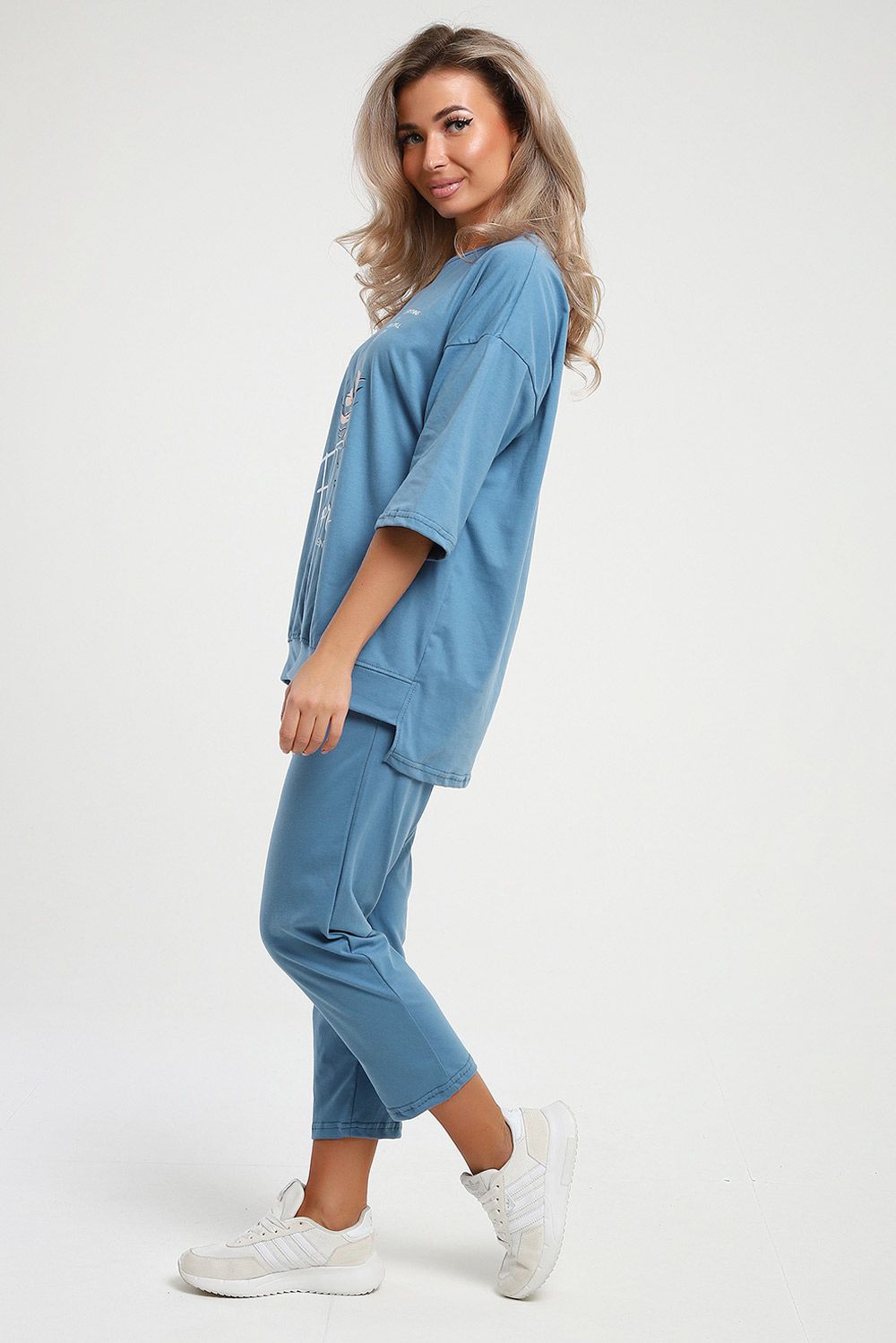 Костюм футболка с капри. Покрой оверсайз. Футболка с удлиненной спинкой. На полочке красивый принт. Капри удлиненные с карманами.