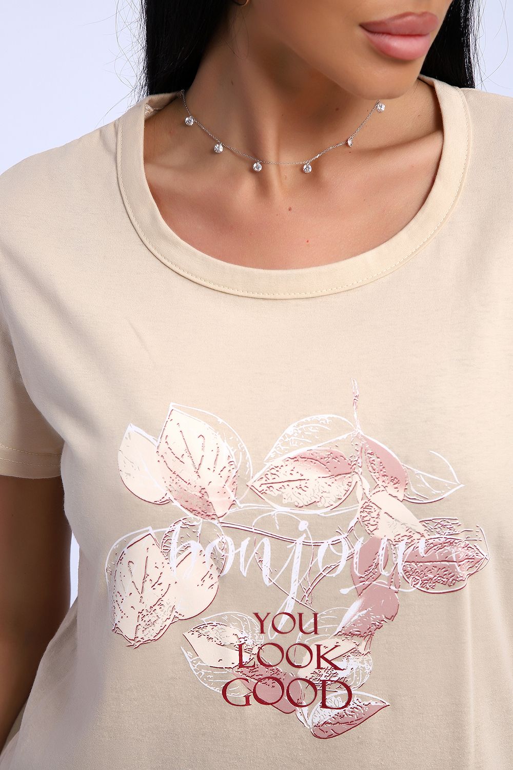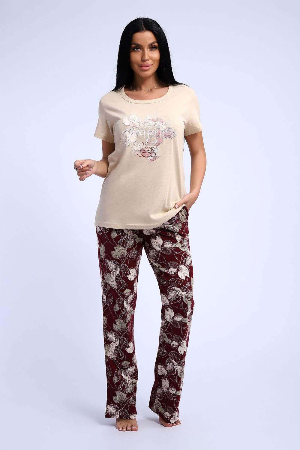 Комплект трикотажный футболка и брюки из натурального хлопка высокого качества. Размерный ряд с 48 до 66 размера. Футболка нежно-песочного цвета, брюки бордово-винного цвета с растительным рисунком, есть боковые карманы.