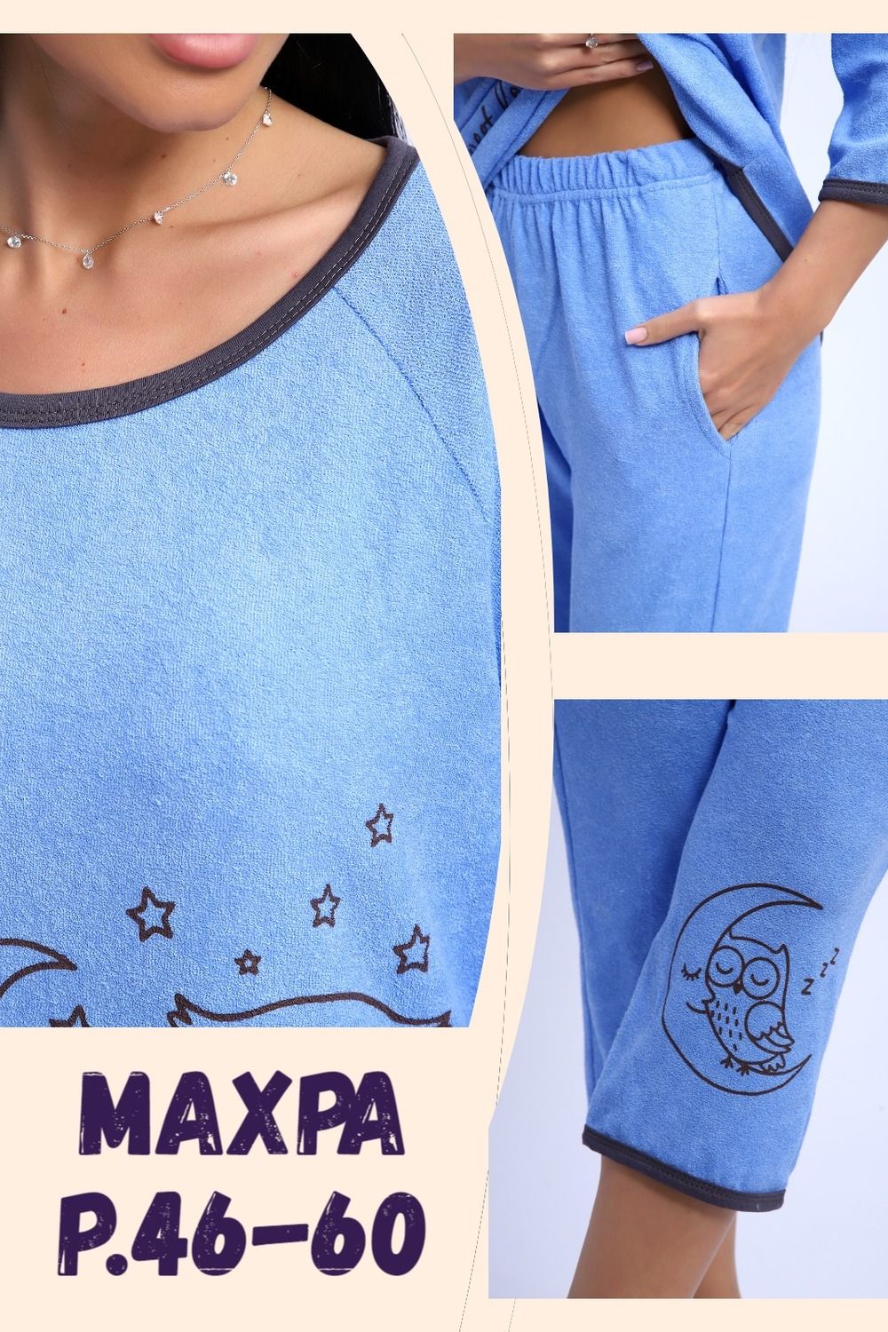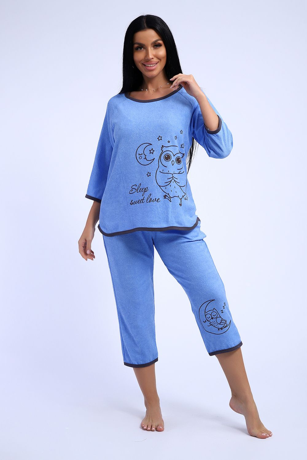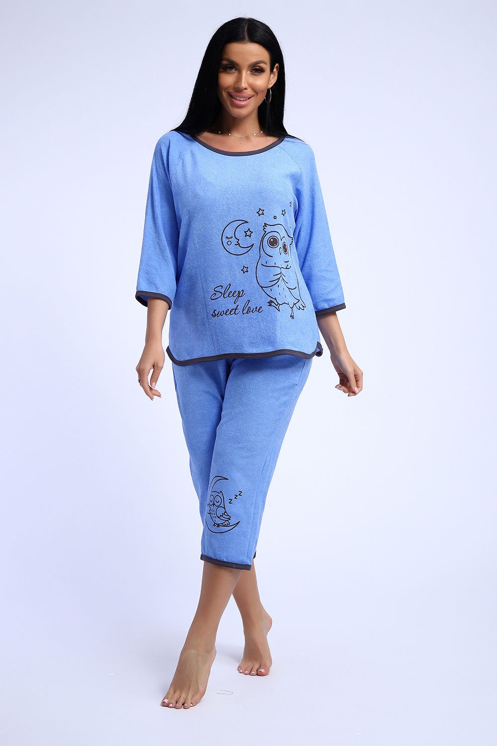 Симпатичный махровый костюм из футболки и бриджей. Футболка с рукавом-реглан длиной 3/4, на полочке изображение совы на фоне луны и звезд. Бриджи свободные, на резинке, с боковыми кармашками, на одной половинке - изображение маленькой совы.