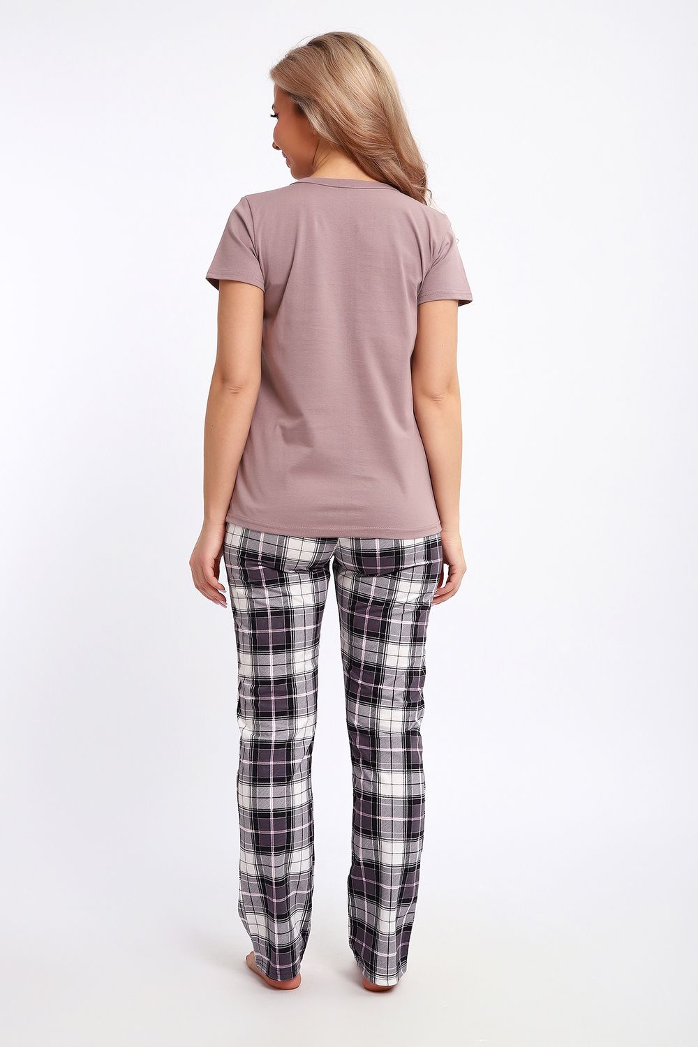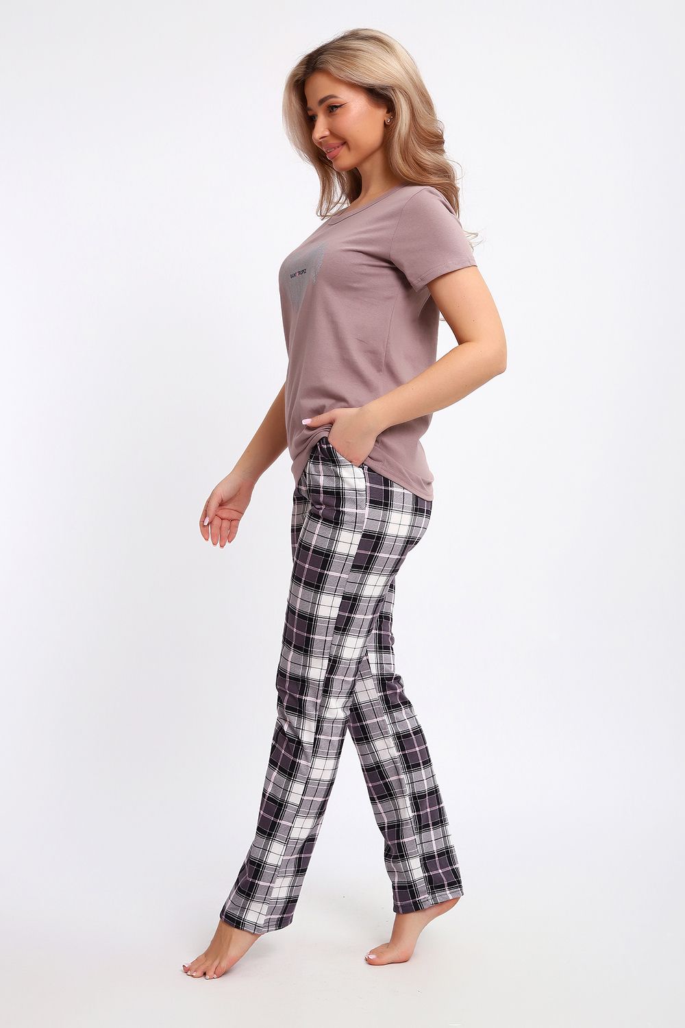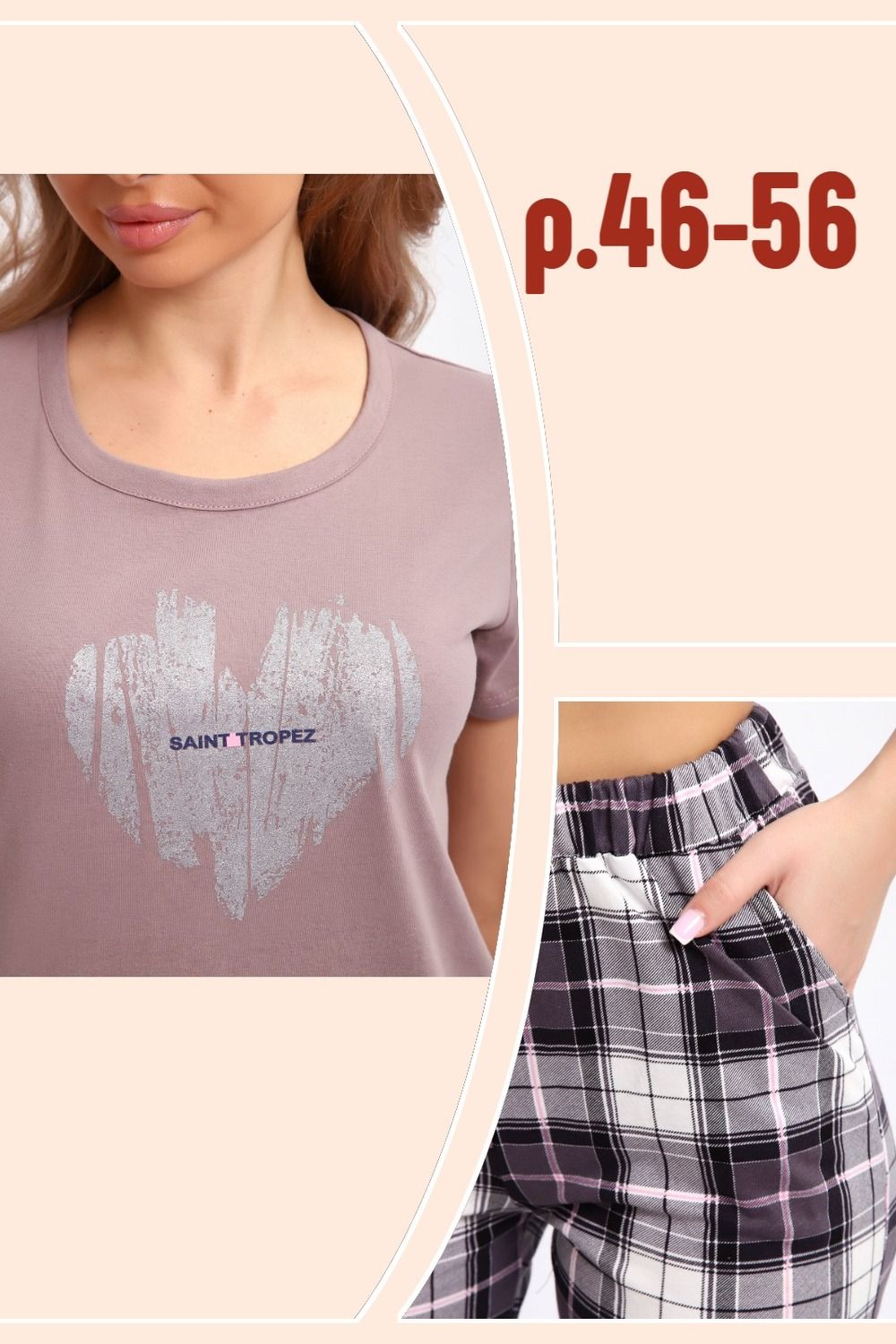 Комплект футболка + брюки из хлопкового полотна кулирка. Футболка цвета кофе с молоком, на полочке серебристый принт в виде стилизованного сердечка, брюки в клетку, с карманами, пояс на резинке.