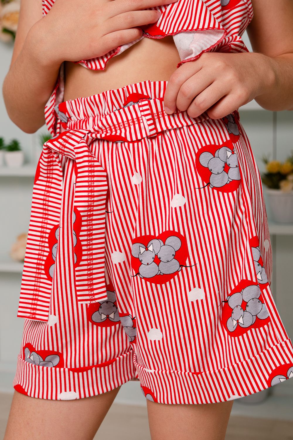 Костюм детский летний. Коротенький топ с шортами. Топ короткий, расклешенный с завышенной линией талии по переду, на широких бретельках из основной ткани, собранных в сборку на резинку. Низ топа обработан декоративной краеобметочной строчкой. Шорты с завышеной линией талии, на широкой резинке, шорты оформлены декоративным поясом со шлевками. Низ обработан притачными манжетами с отворотом.