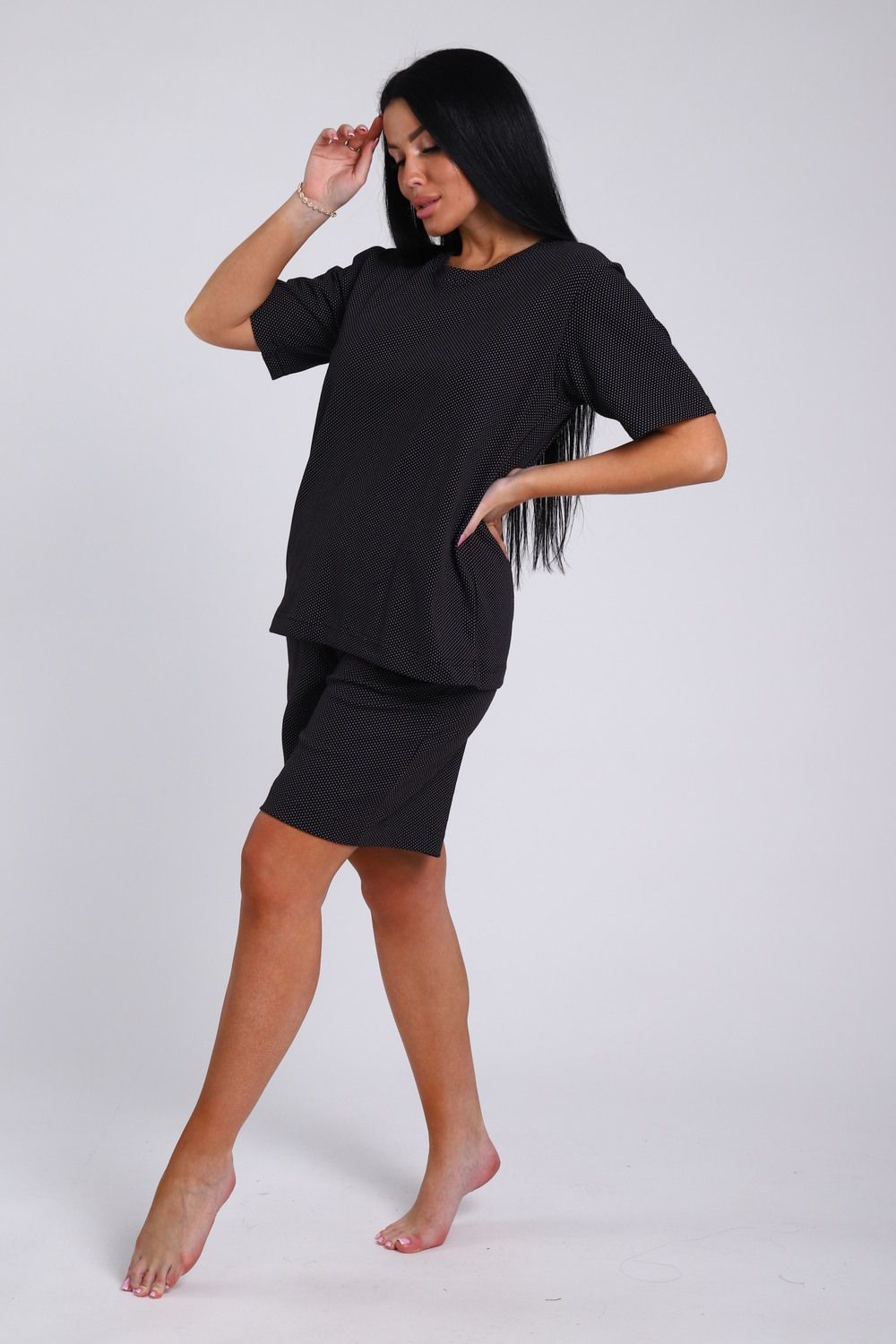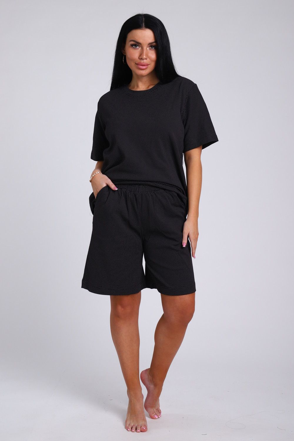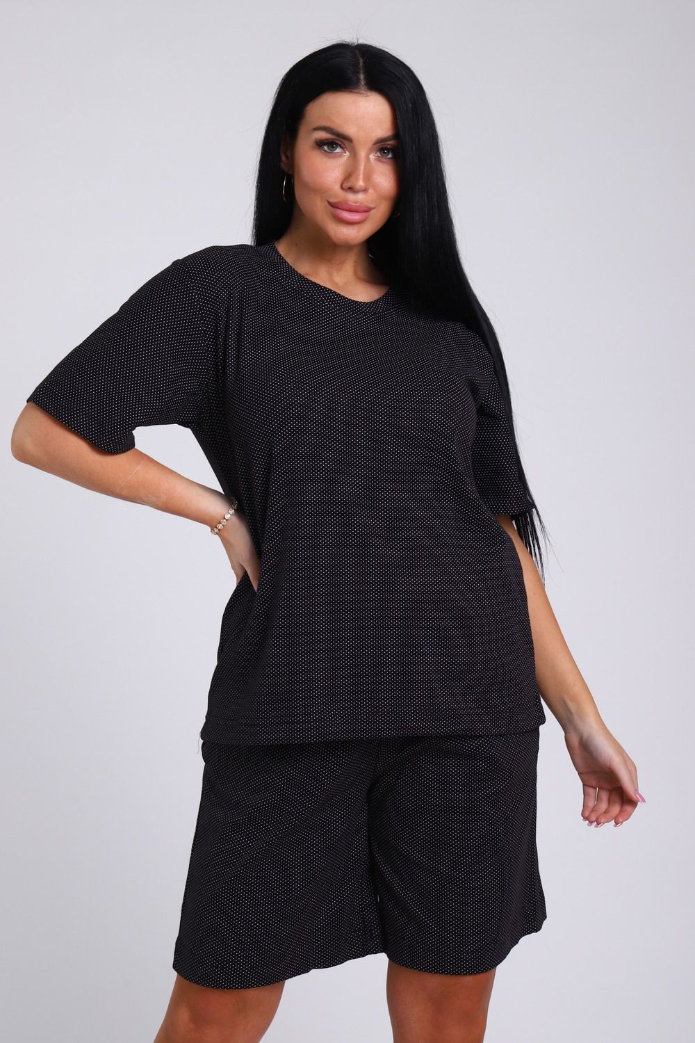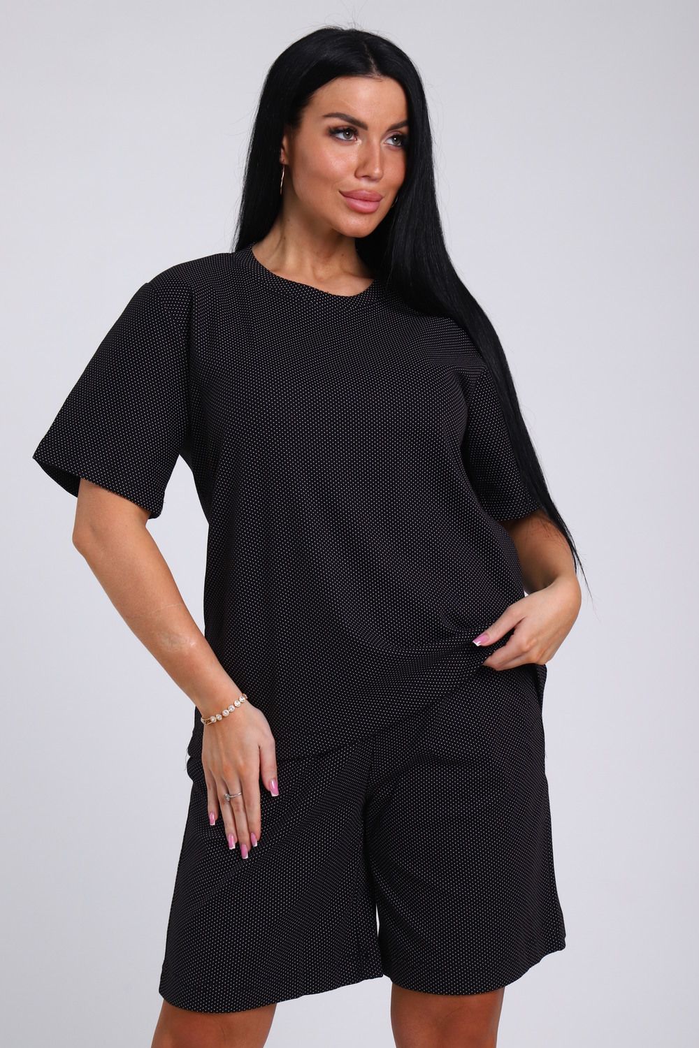Женский костюм с удлиненными шортами - идеальный выбор для тех, кто ценит комфорт и стиль. Домашний комплект состоит из базовой oversize футболки и широких шорт с карманами. Изготовлен из мягкого футера двунитки без начеса, который обеспечивает отличную воздухопроницаемость и комфорт в жаркую погоду. Хлопок в составе ткани гарантирует ее прочность и долговечность, а лайкра обеспечивает эластичность и удобство при движении. Большие размеры от 46 до 56 позволяют выбрать идеальный вариант для любого типа фигуры. Благодаря широкой резинке оверсайз шорт и свободному крою футболки этот комплект домашней одежды может стать прекрасным выбором для беременных женщин, так как не сковывает движения, а мягкий трикотаж не вызывает дискомфорта. Летний дачный комплект двойка из футболки и шорт oversize - идеальный вариант для прогулок, спорта и отдыха. Спортивный костюм также подойдет для дома, сна и путешествий. Повседневный домашний костюм с ярким принтом в стиле спорт шик станет универсальным подарком на любой праздник маме, бабушке или девушке.
