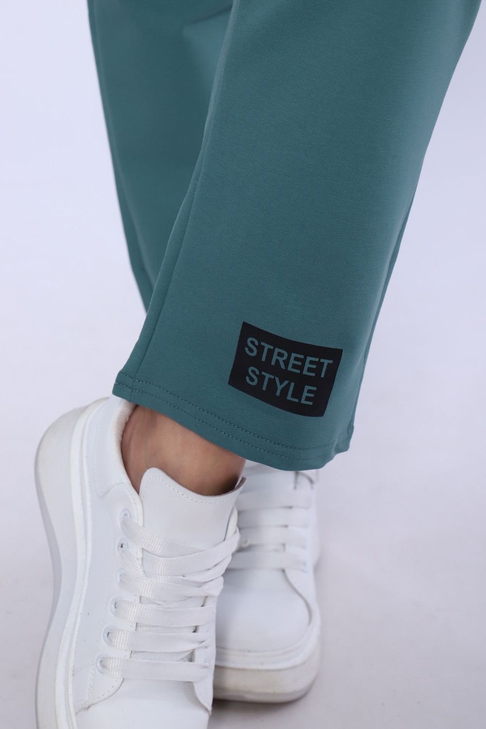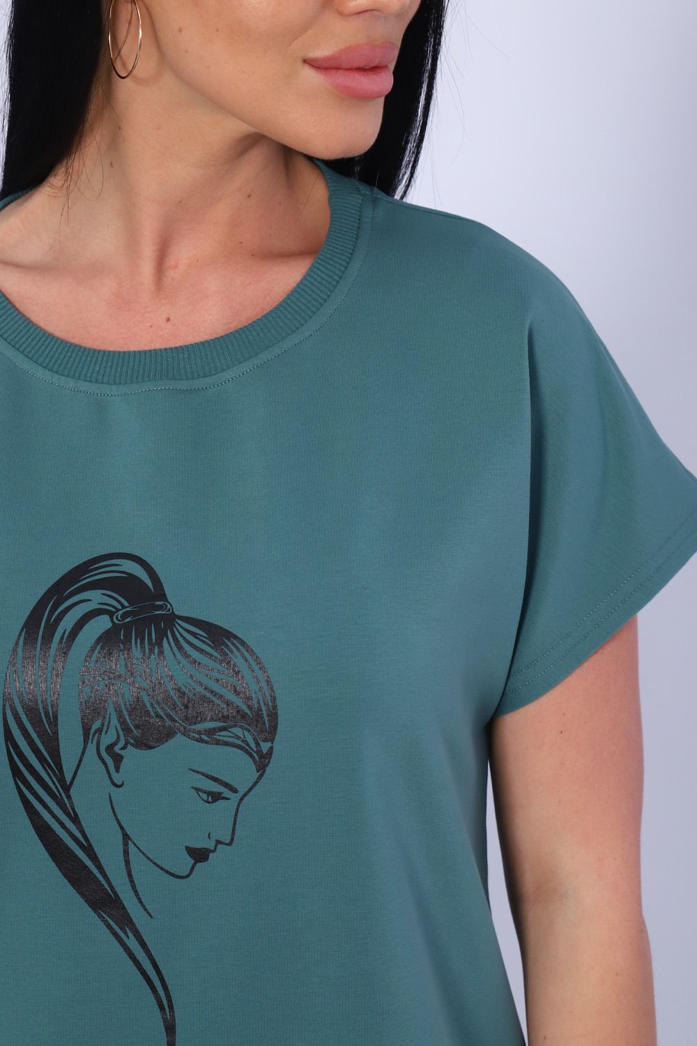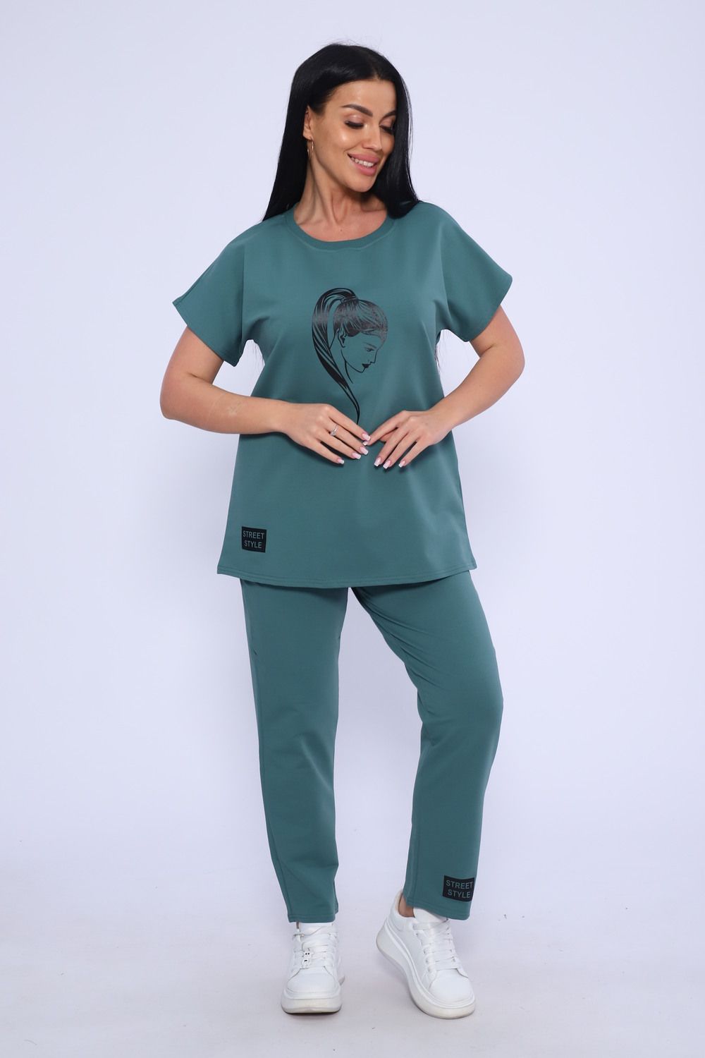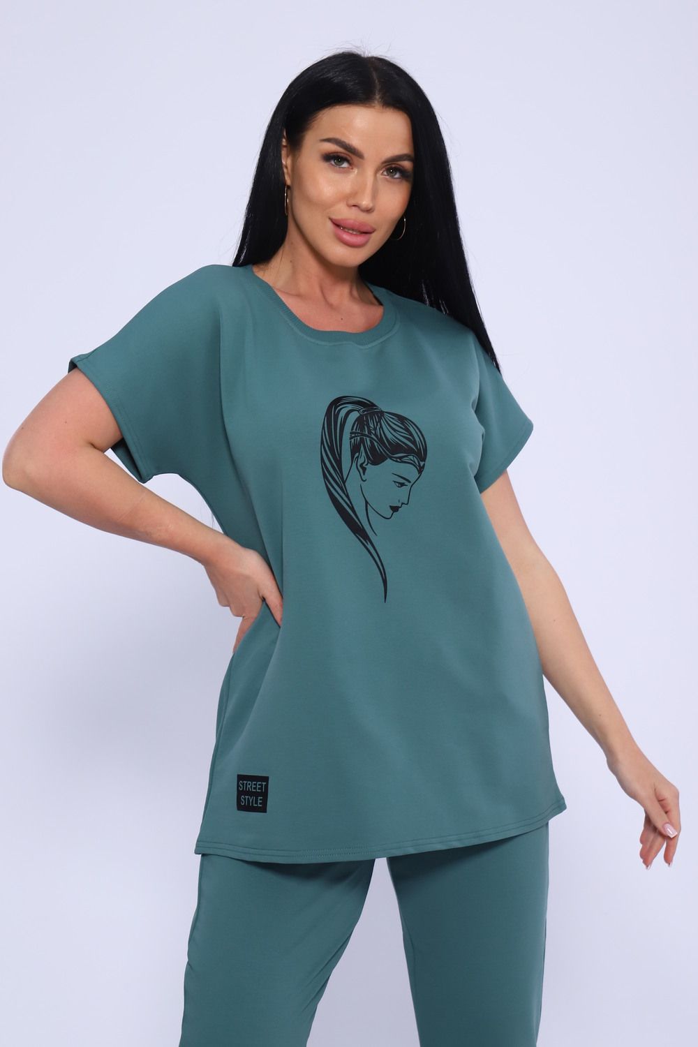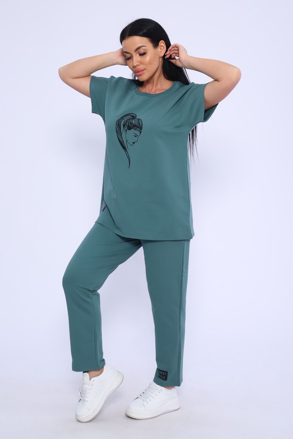 Легкий женский костюм прямого силуэта. Верх двойки - футболка с коротким рукавом и округлой горловиной. Футболка свободная с принтом. Низ - прямые брюки без карманов, пояс на резинке. Данная модель подойдет как и для повседневной носки, так и для дома. Удобный и приятный костюм. Рост модели на фото 165, размер 48.