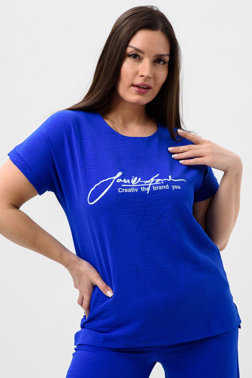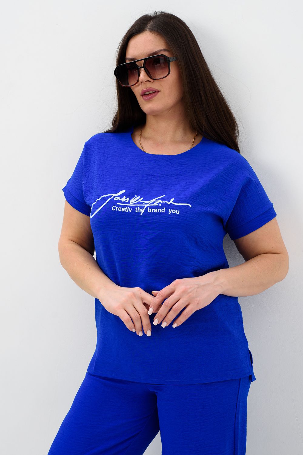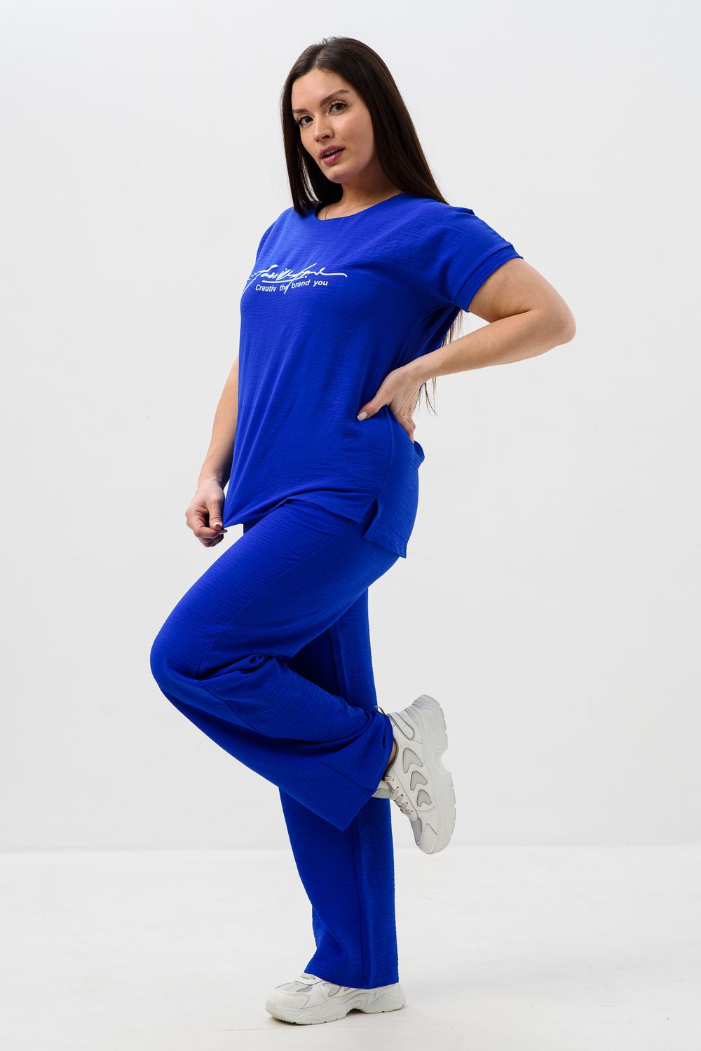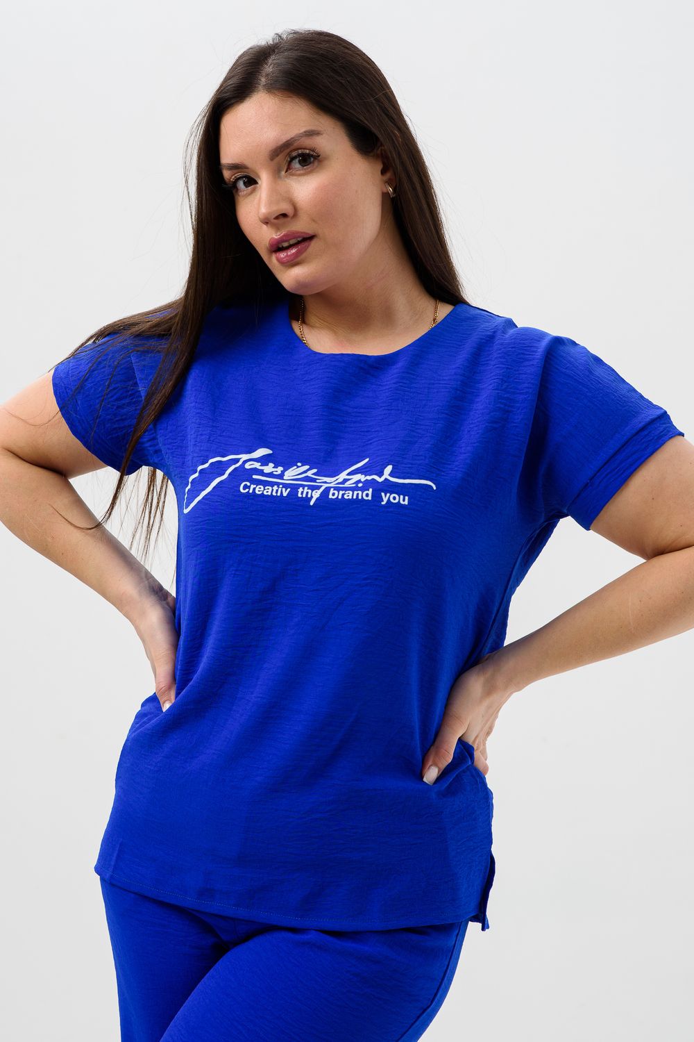 Женская двойка прямого кроя. Футболка костюма с коротким цельнокроеным рукавом, округлой горловиной и принтом на передней полочке, брюки с поясом на резинке (4 см) и карманами. Комплект достаточно свободный, поэтому подойдет для повседневной носки, как и для дома, так и на прогулку. Костюм представлен в двух приятных расцветках, выполнен из легкой ткани - сингапур, что идеально подойдет для жаркой погоды, красивый, но при этом простой и удобный.