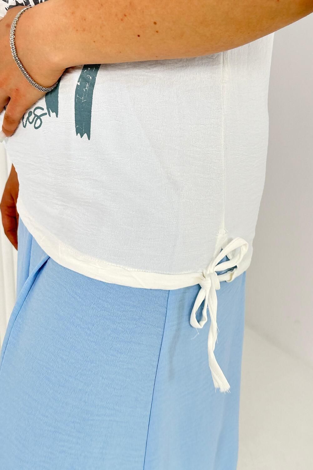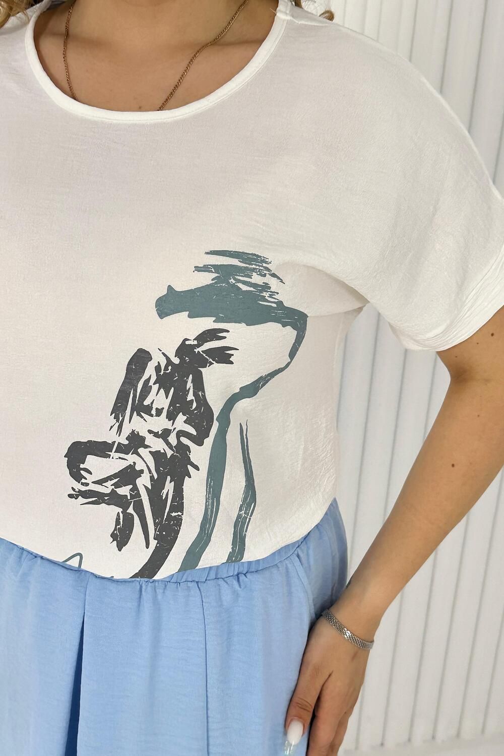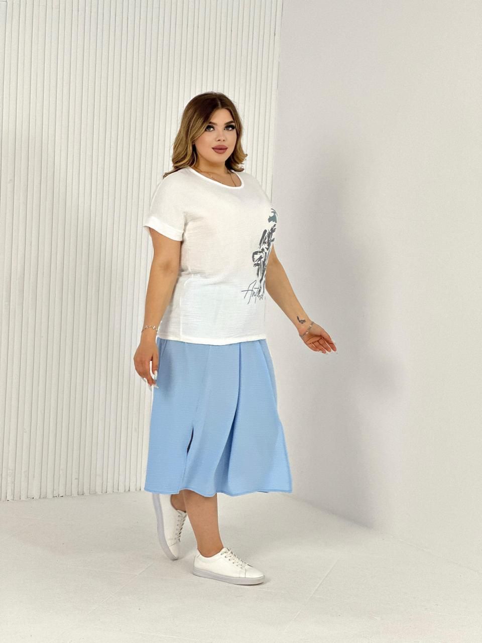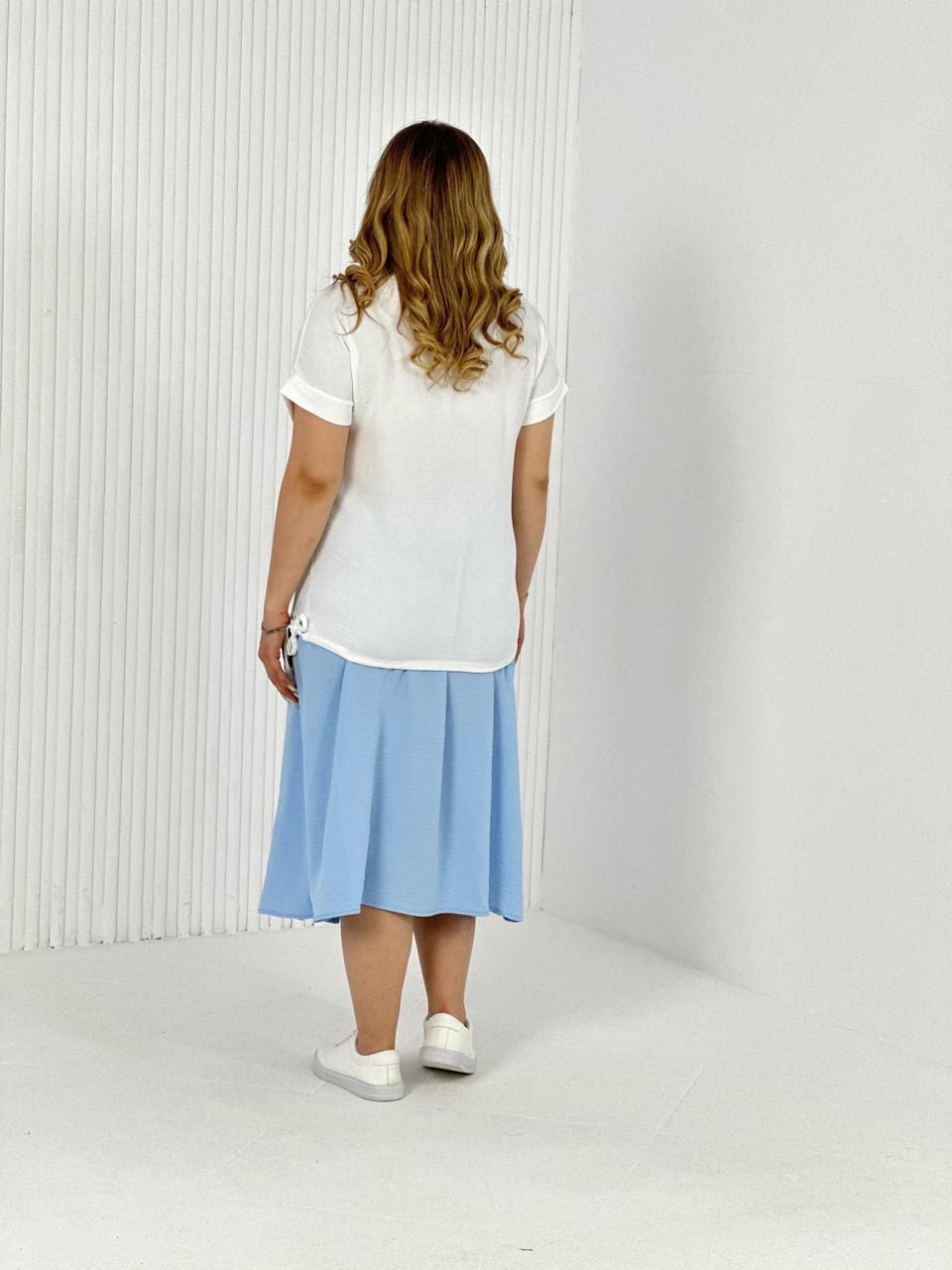 Женская двойка прямого силуэта. Верх комплекта в белом цвете с цветным принтом, короткий цельнокроеный рукав, низ футболки имеет свойство затягиваться, поэтому ее можно носить спущенную на юбку, а можно затянуть и оставить над ней, что подчеркнет вашу талию. Низ - свободная юбка двух цветов, с двумя разрезами снизу. Костюм повседневный и удобный, из легкой ткани сингапур, что хорошо для жаркого лета.
