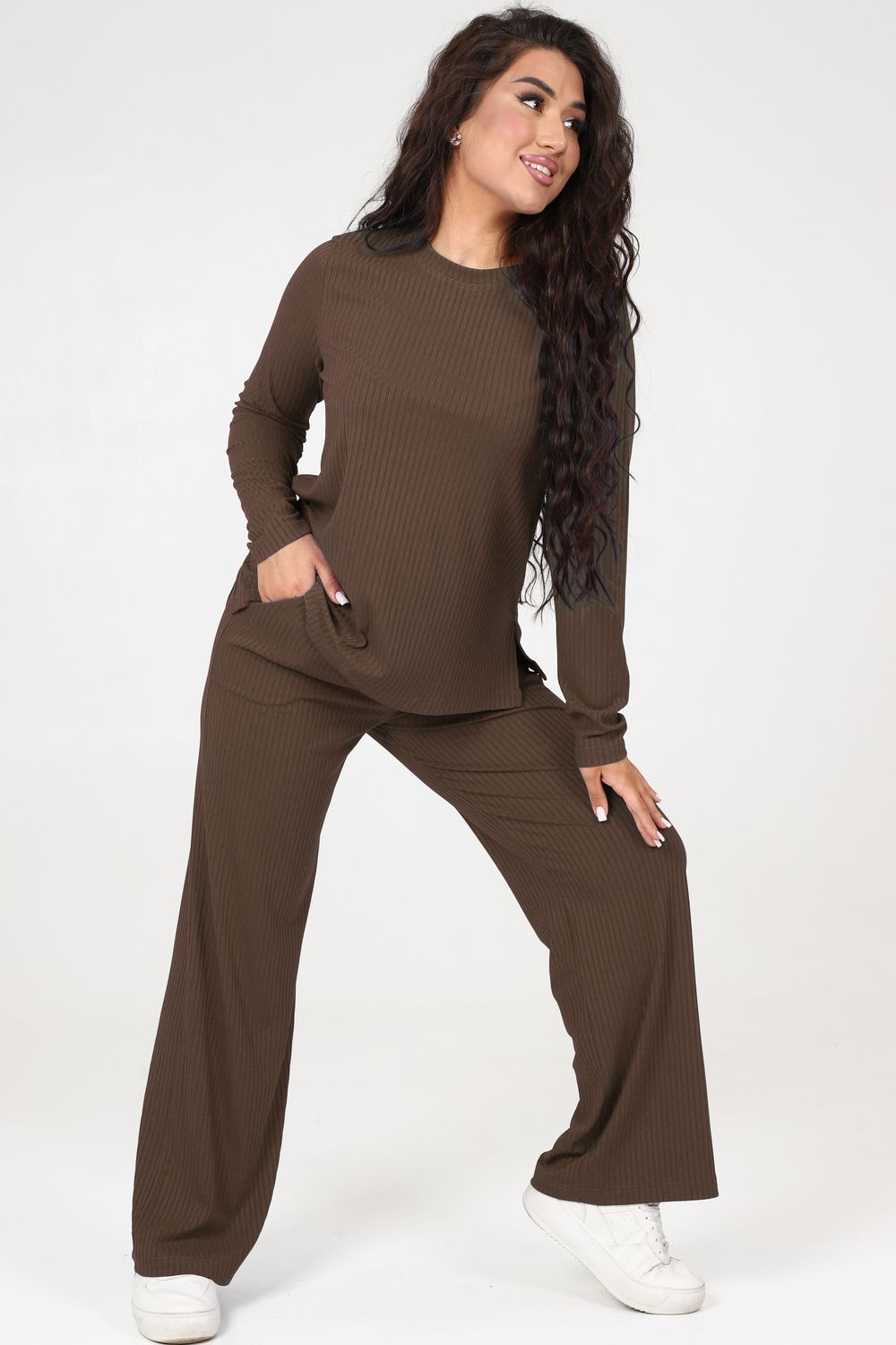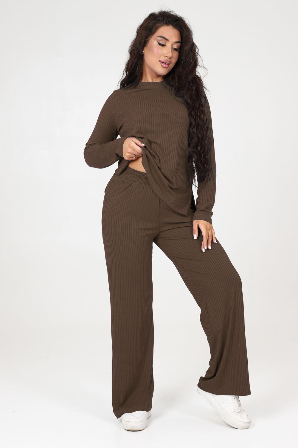 Стильный женский трикотажный костюм из ткани лапши. Комплект состоит из кофты с длинным рукавом и разрезами снизу по бокам и брюк широкого кроя с поясом на резинке и карманами по бокам. Модель подойдет для вечернего и повседневного образа, отлично сочетается как с кроссовками, так и с туфлями. Костюм отлично подходит для прогулки, выезда на природу или похода в ресторан. Удобный свободный вверх отличный вариант на лето, приятные к телу штаты удобны и практичны.