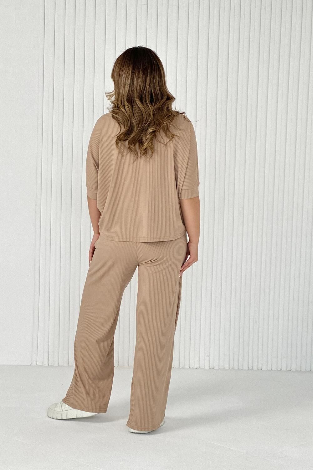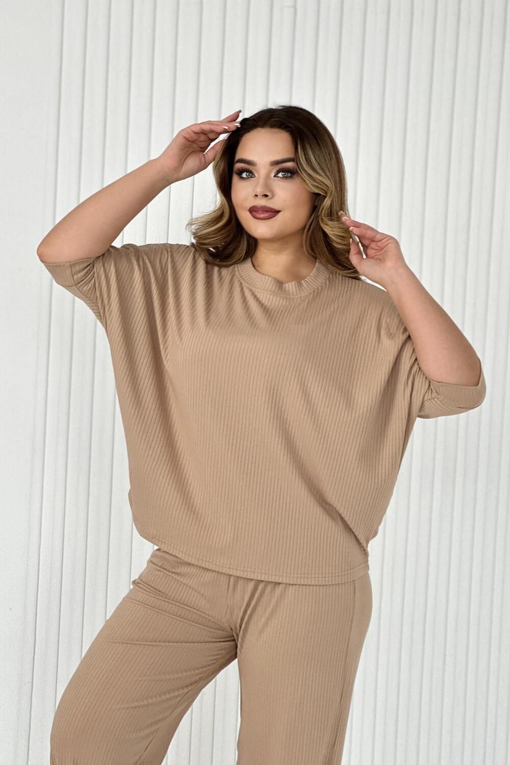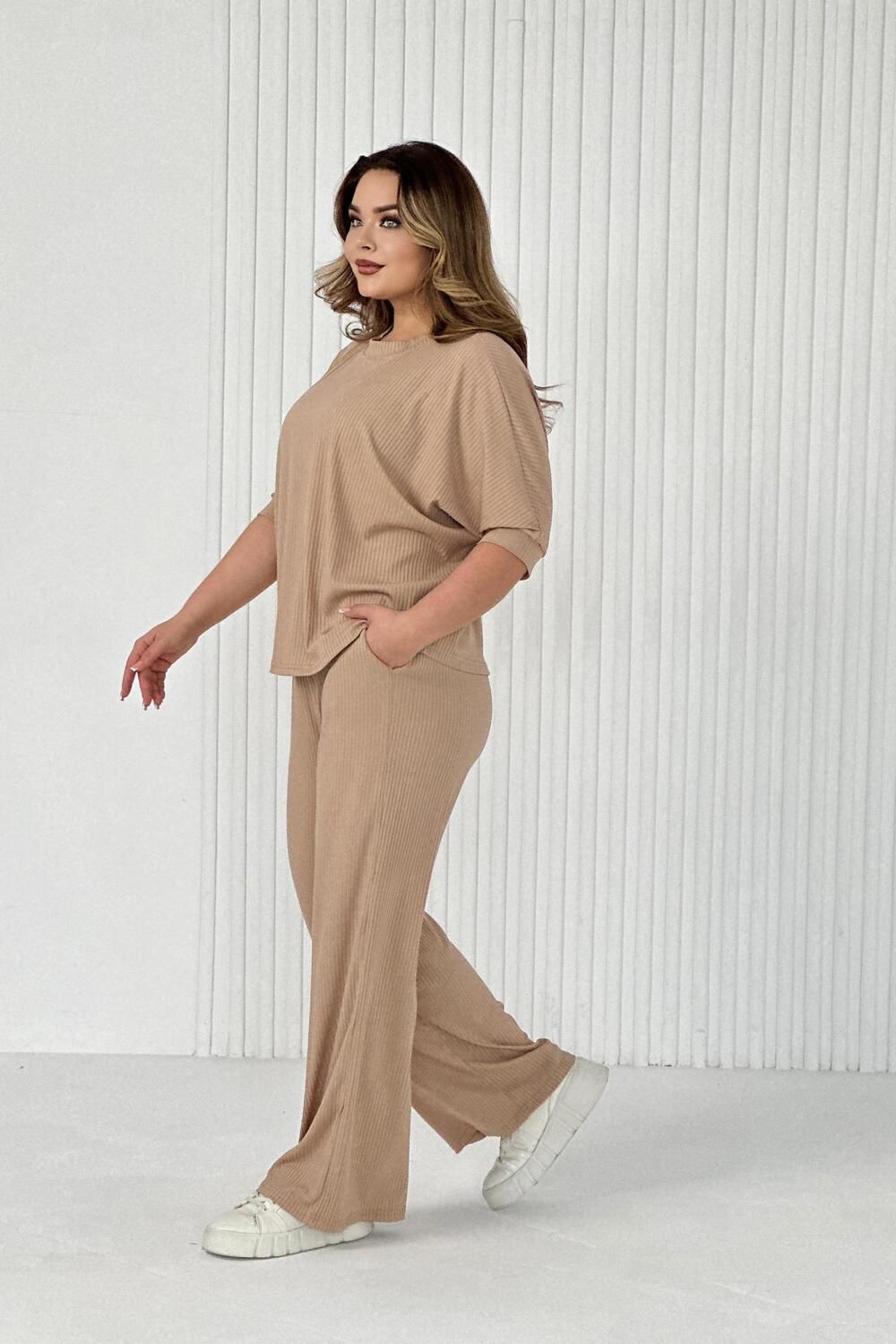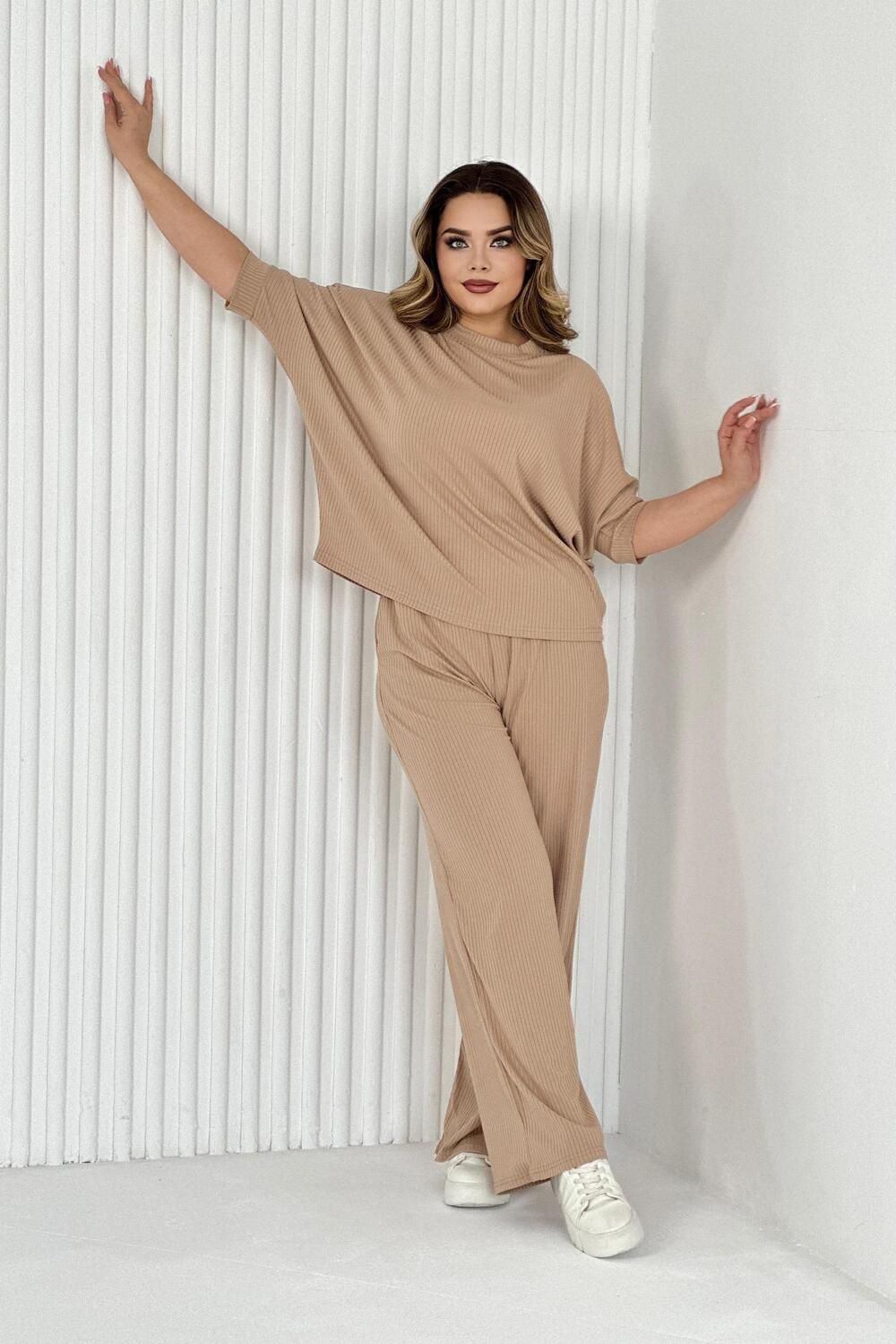Стильный женский трикотажный костюм из ткани лапши. Комплект состоит из футболки - летучая мышь и брюк широкого кроя с поясом на резинке и карманами по бокам. Модель подойдет для вечернего и повседневного образа, отлично сочетается как с кроссовками, так и с туфлями. Костюм отлично подходит для прогулки, выезда на природу или похода в ресторан. Удобный свободный вверх отличный вариант на лето, приятные к телу штаты удобны и практичны. Длина рукава указана от горловины, а футболка костюма достаточно свободная, поэтому подойдет на любую фигуру. Важно! Подбирая для себя нужный размер, смотрите на замеры брюк.​