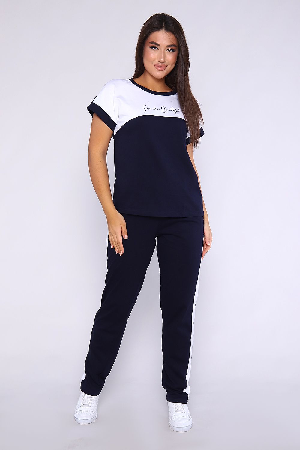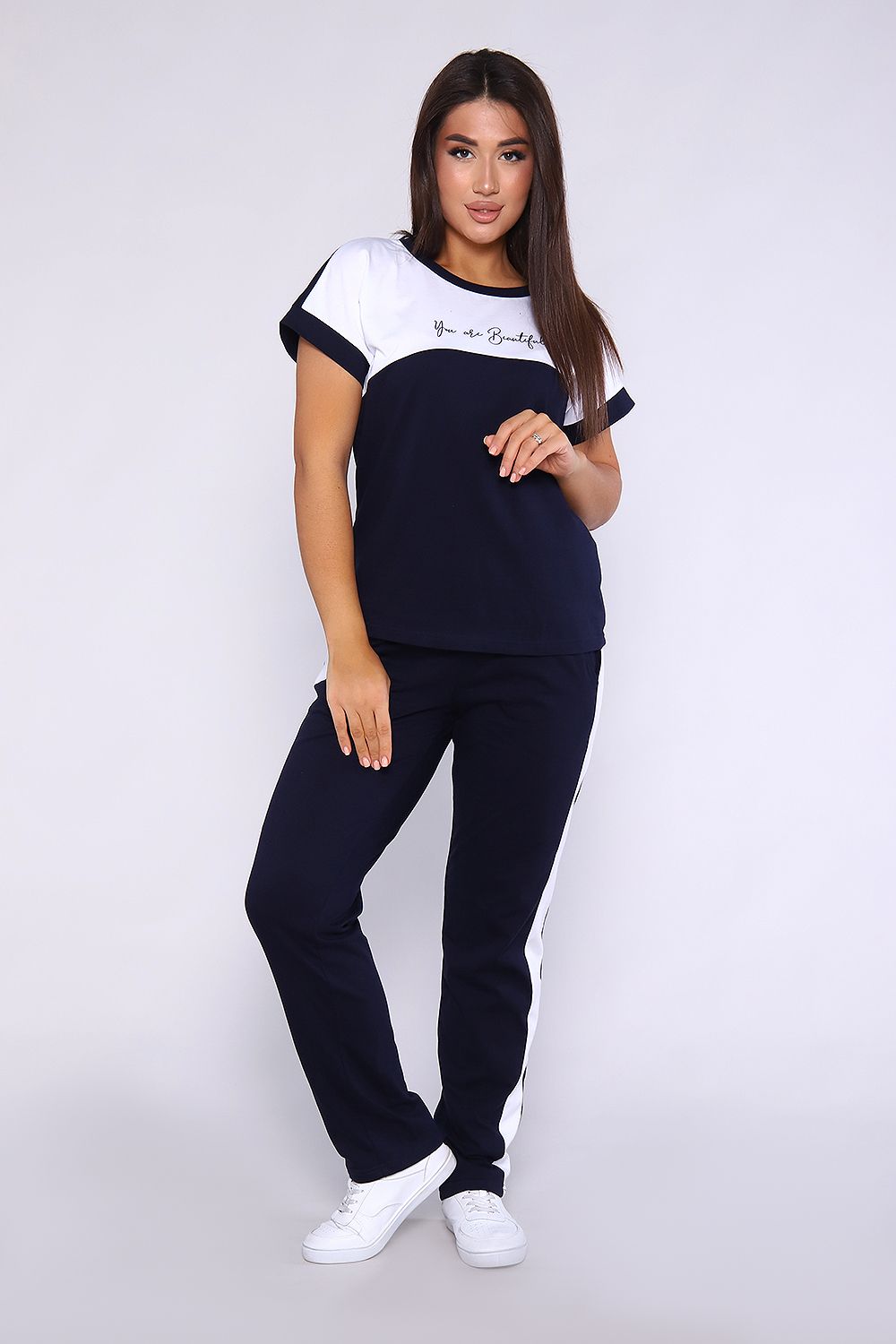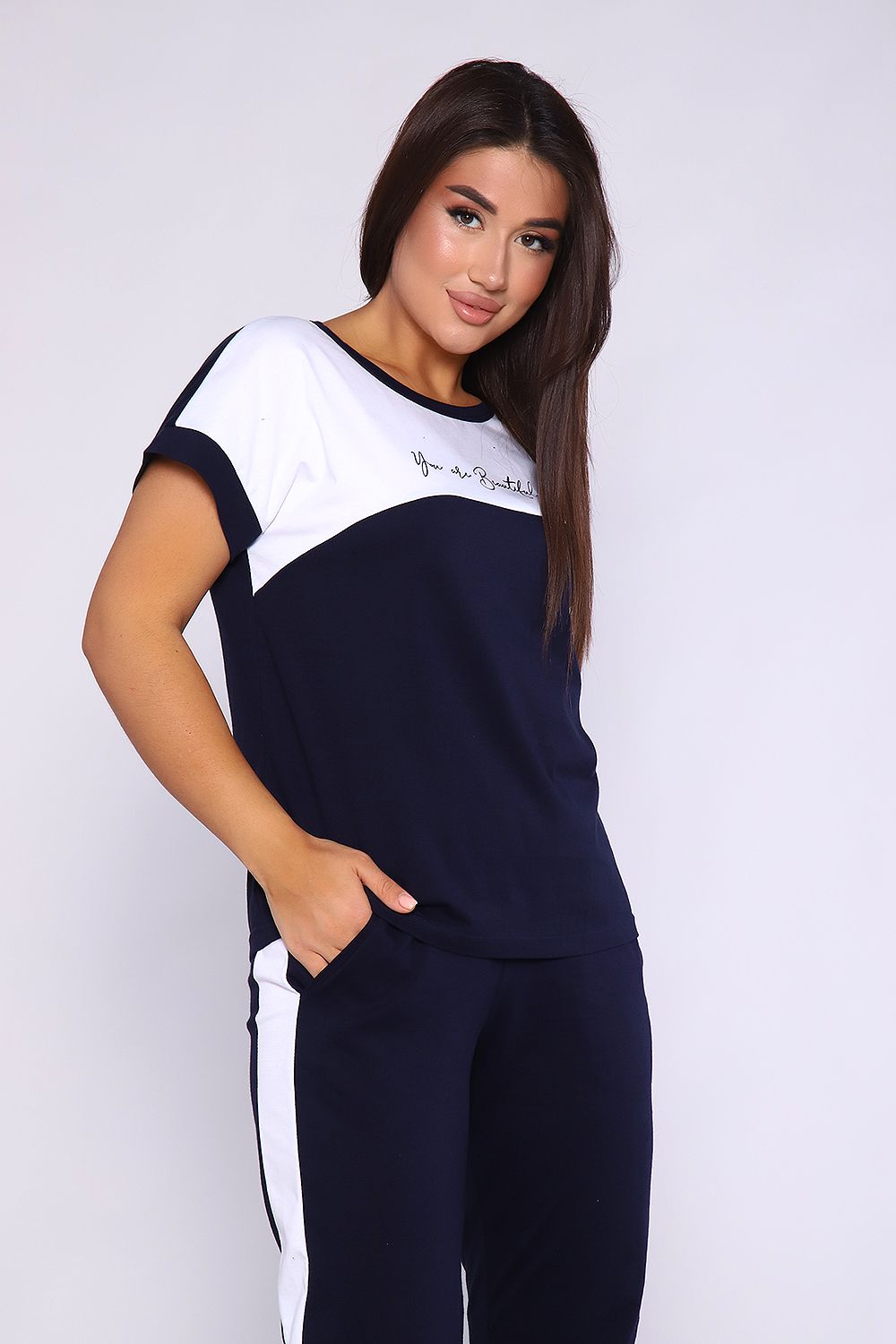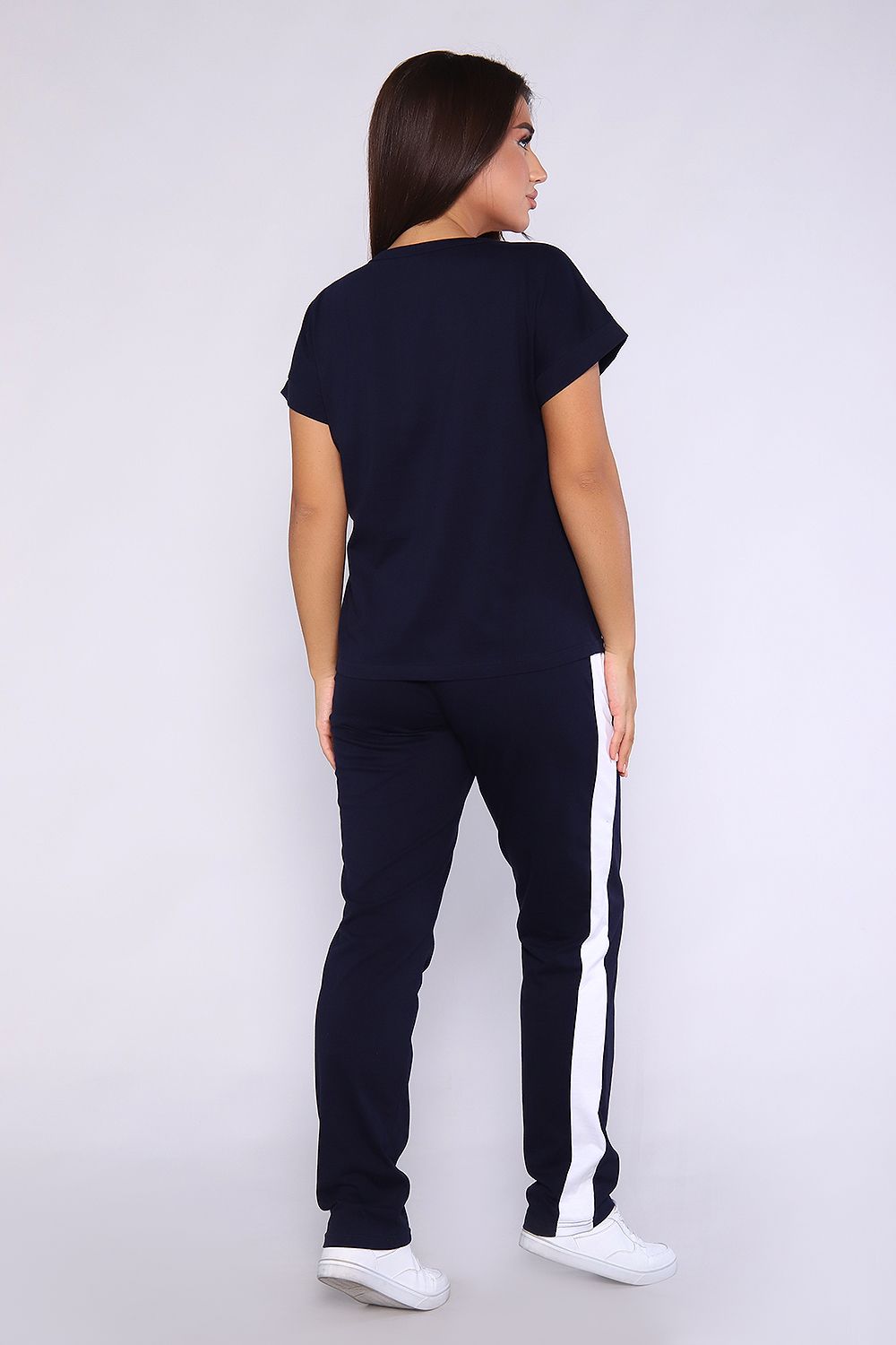 Женский костюм, футболка с брюками, выполнен из качественного полотна (100% хлопок). Брюки прямые с лампасами, есть карманы, на поясе. Футболка с округлой горловиной, обработанной кантом, спущенный рукав.