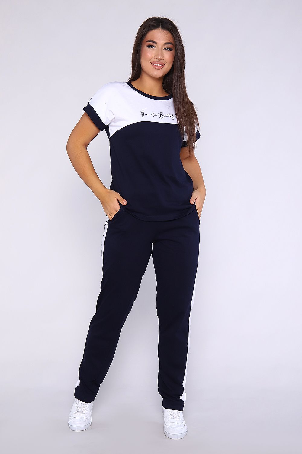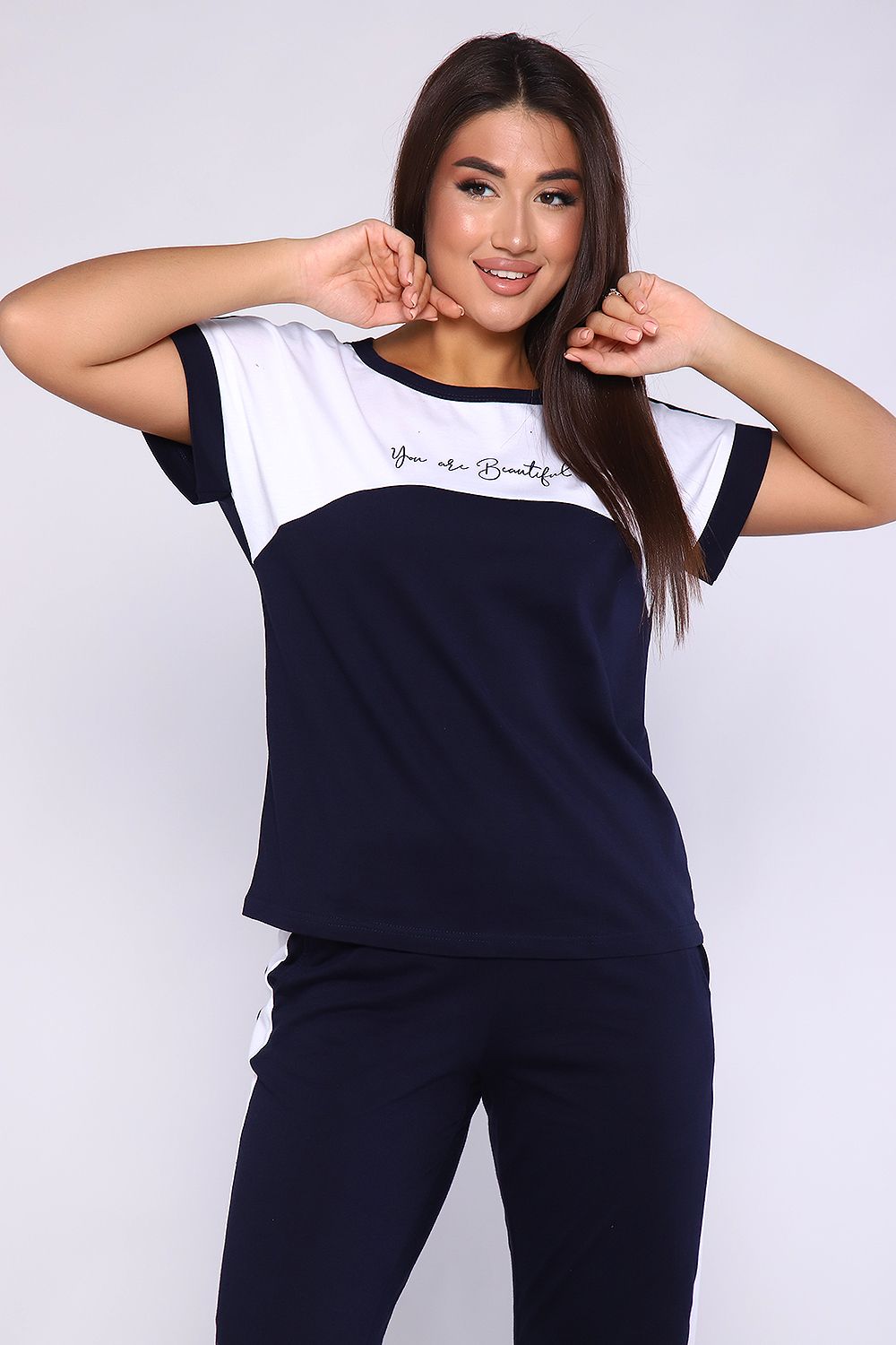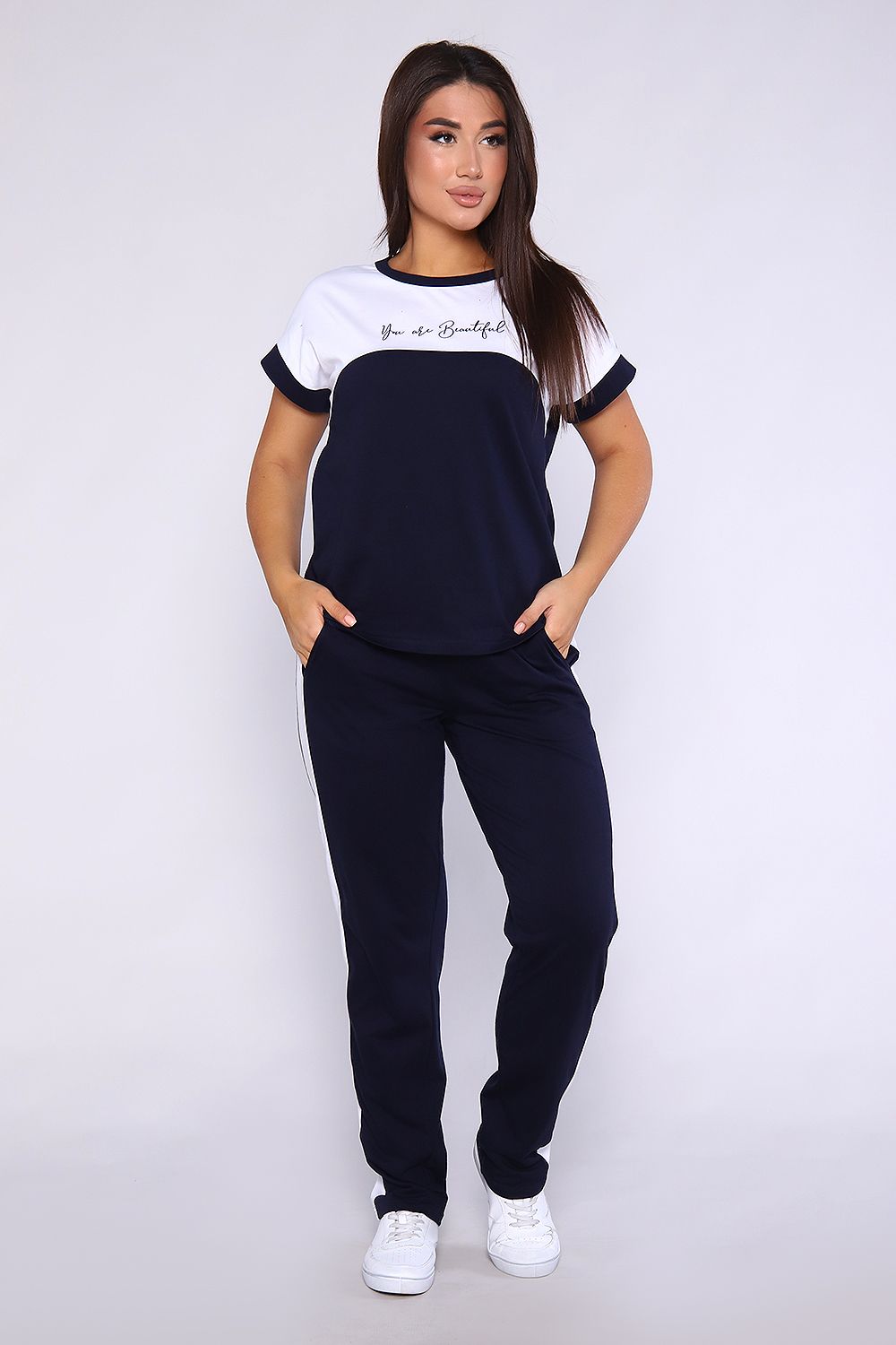 Женский костюм, футболка с брюками, выполнен из качественного полотна (100% хлопок). Брюки прямые с лампасами, есть карманы, на поясе. Футболка с округлой горловиной, обработанной кантом, спущенный рукав.