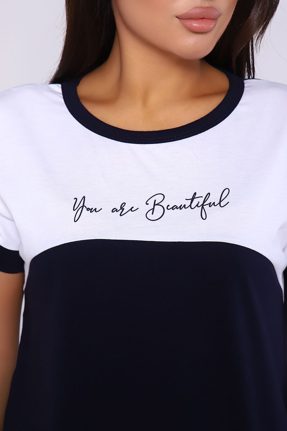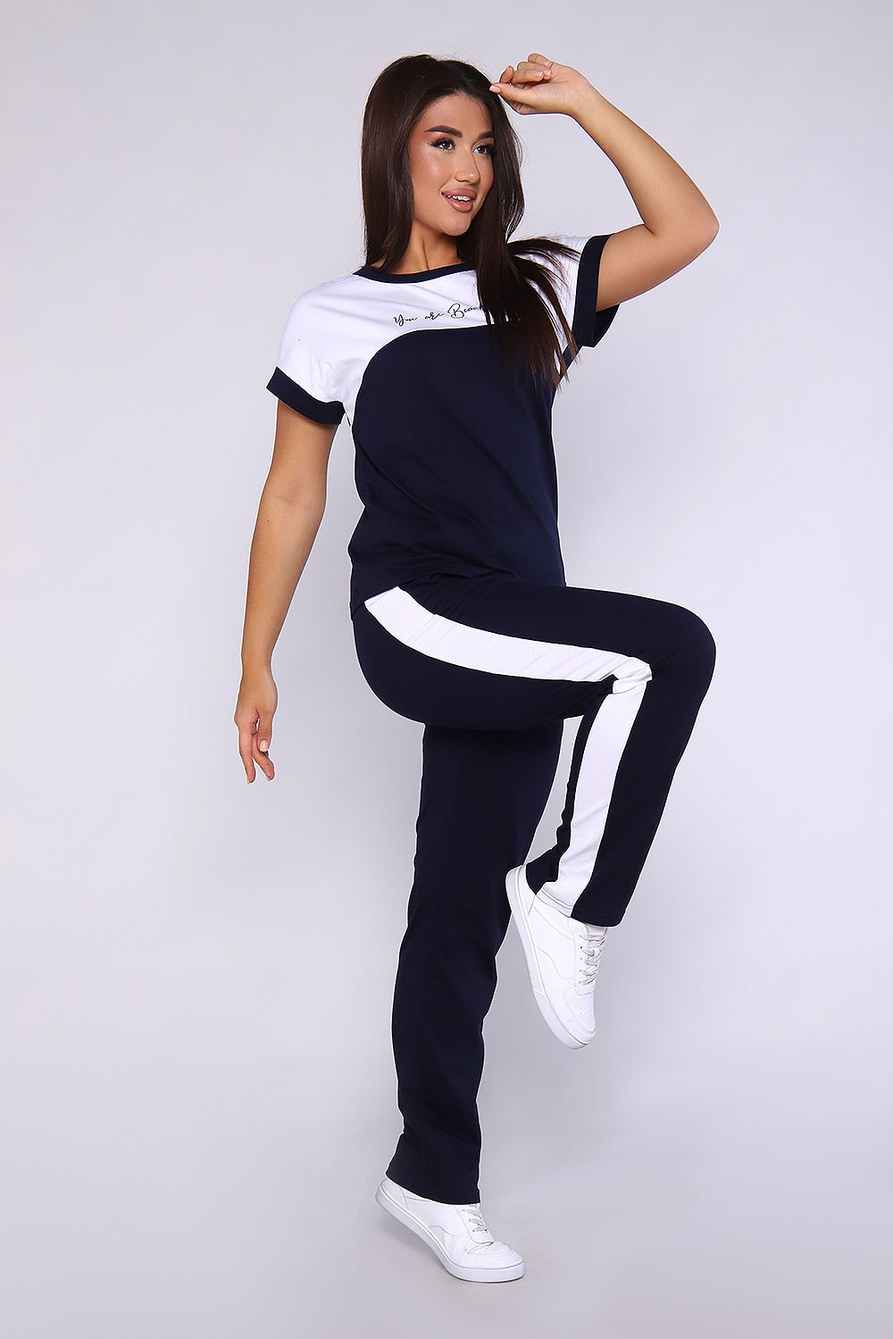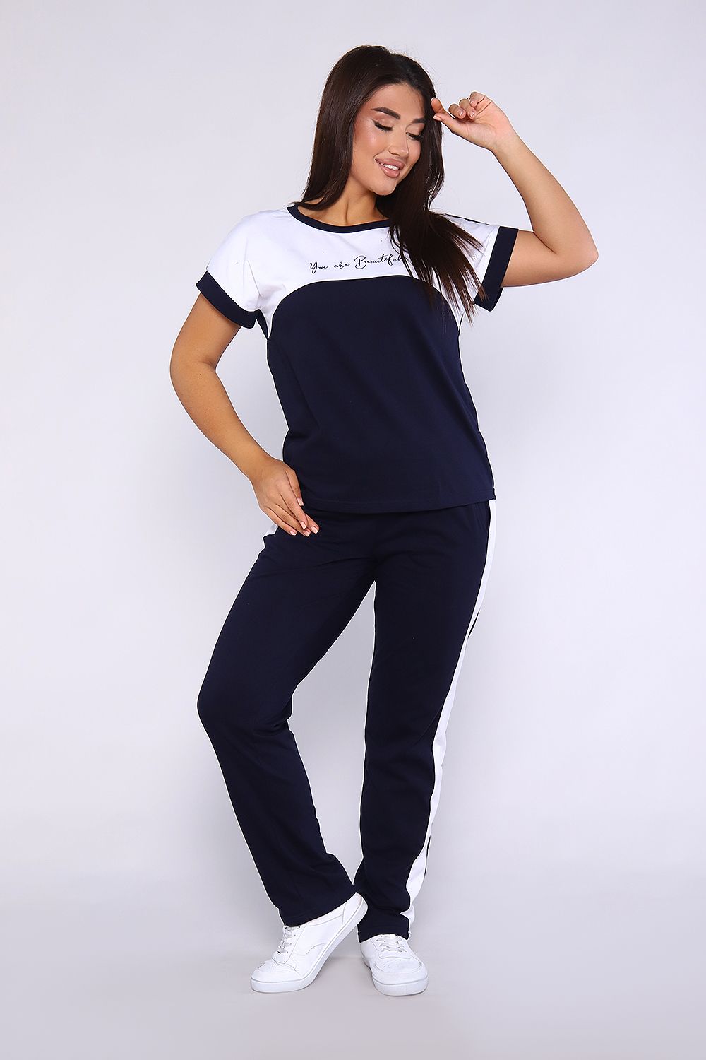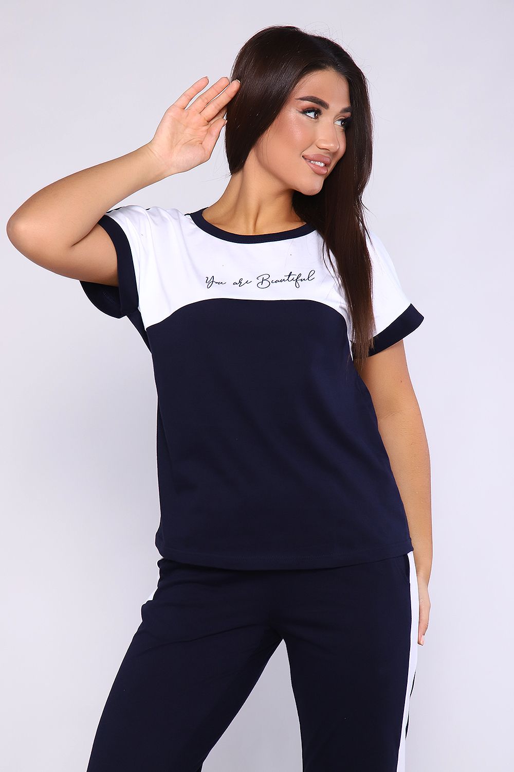 Женский костюм, футболка с брюками, выполнен из качественного полотна (100% хлопок). Брюки прямые с лампасами, есть карманы, на поясе. Футболка с округлой горловиной, обработанной кантом, спущенный рукав.