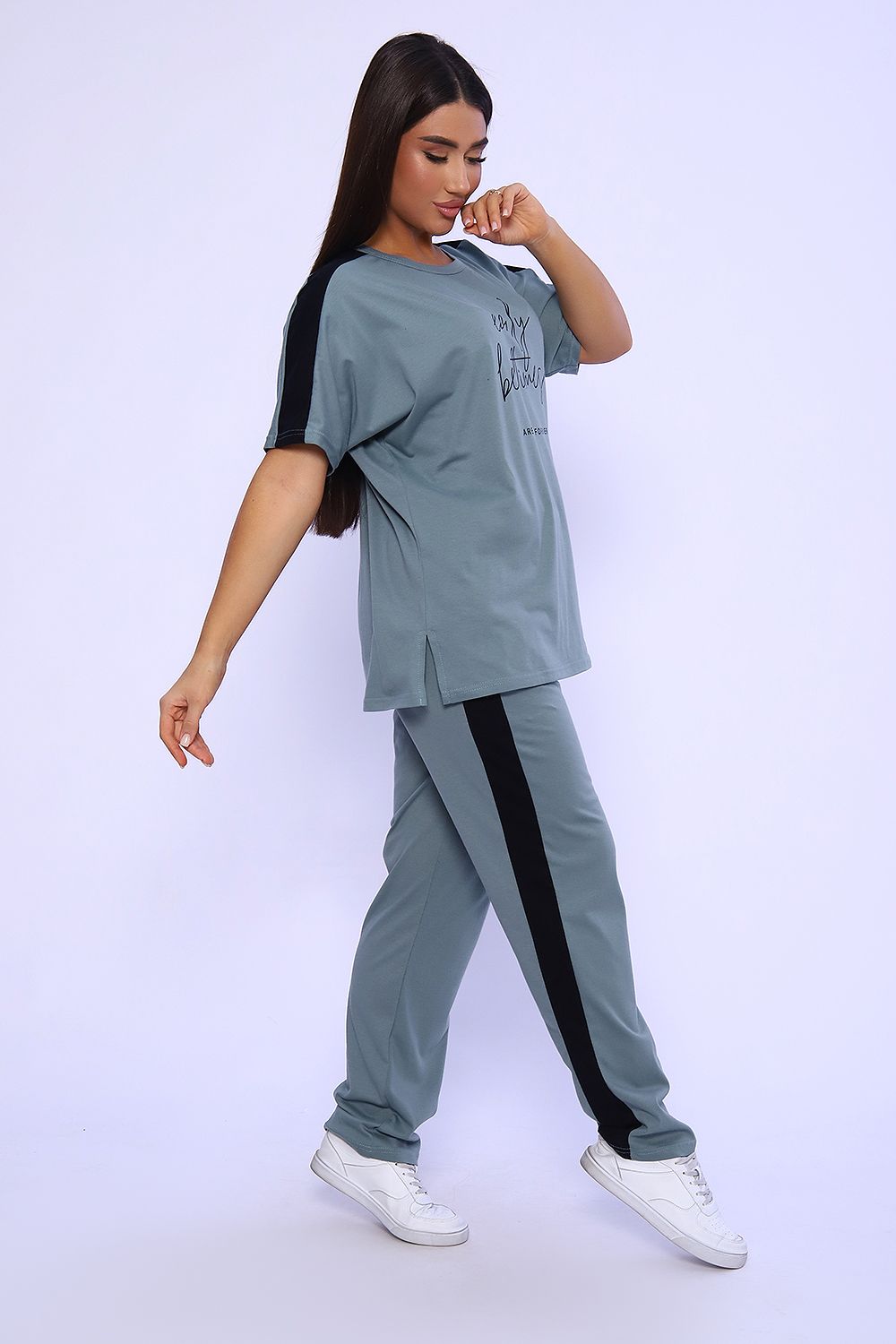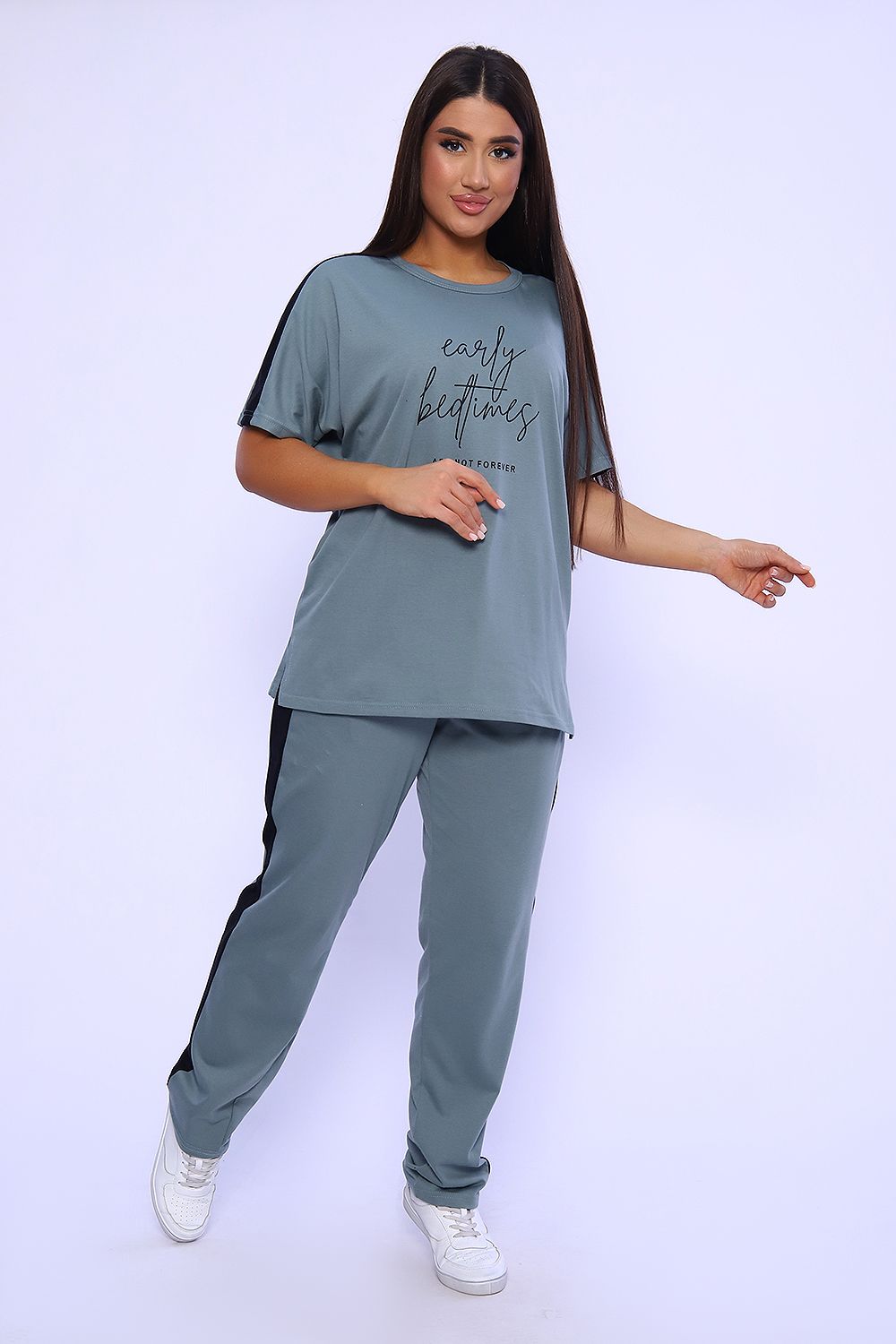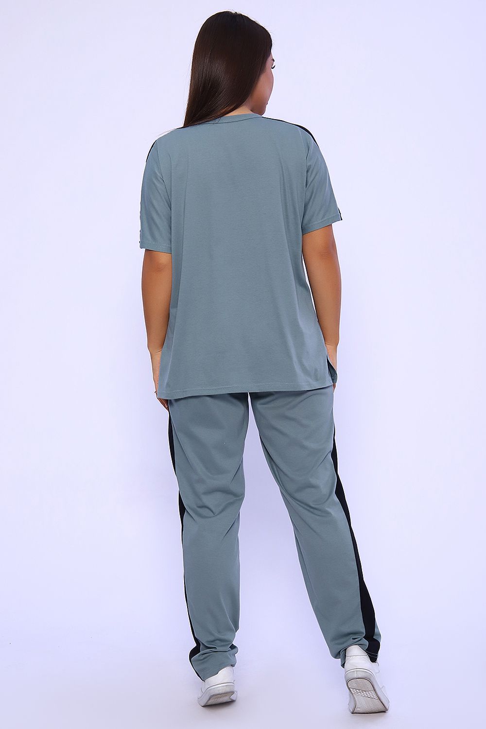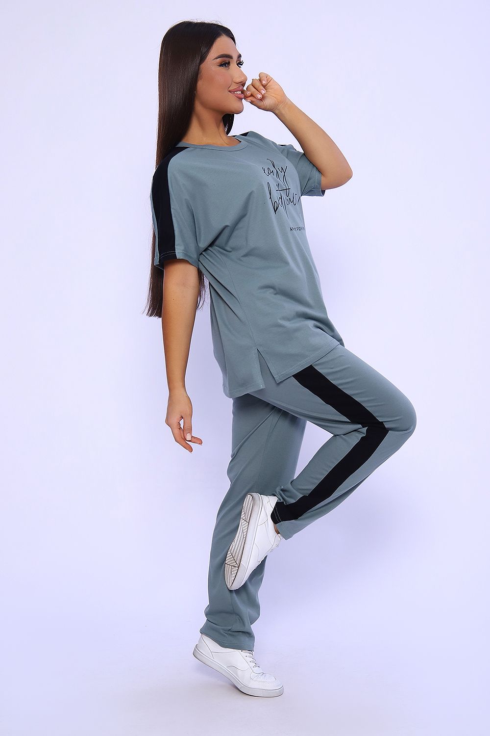 Женский костюм изготовлен из мягкого кулирного полотна, средней плотности. Костюм состоит из футболки и брюк. Футболка с округлой горловиной, обработанной окантовкой, по плечам есть лампасы, по бокам небольшие разрезы. Брюки прямые с лампасами, поясом есть карманы.