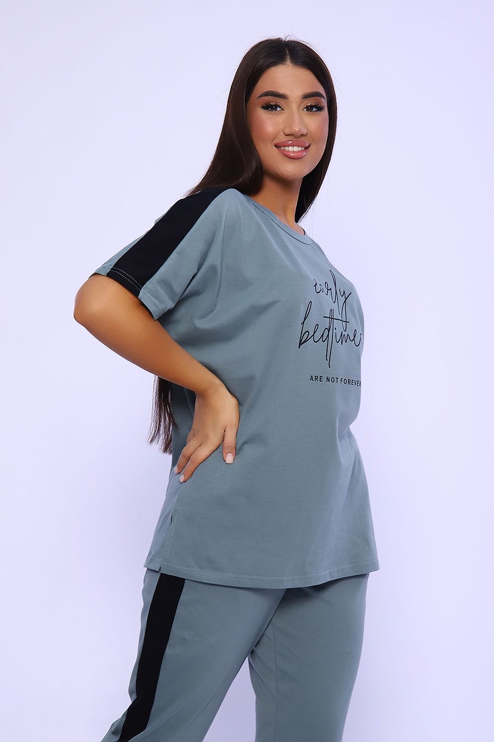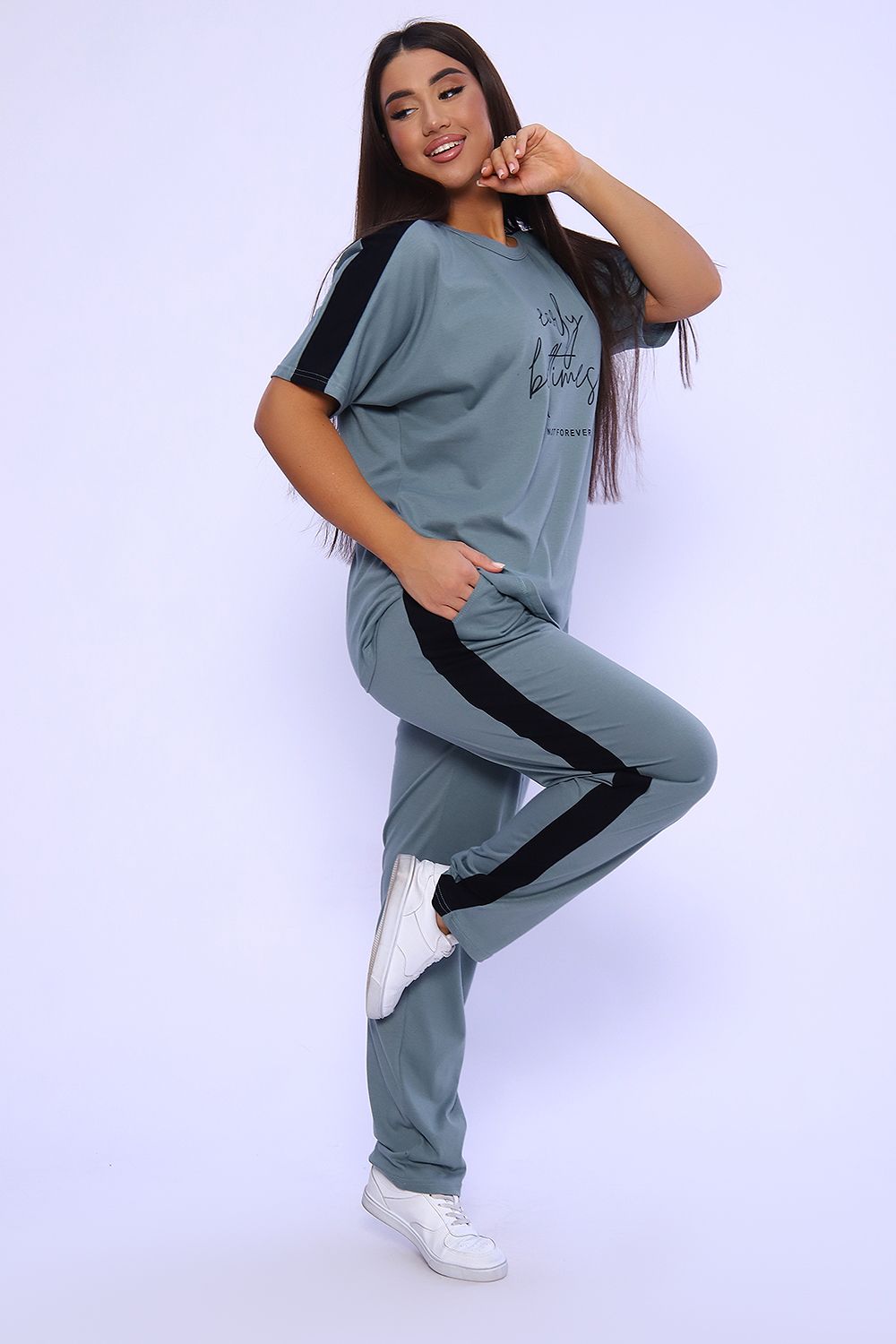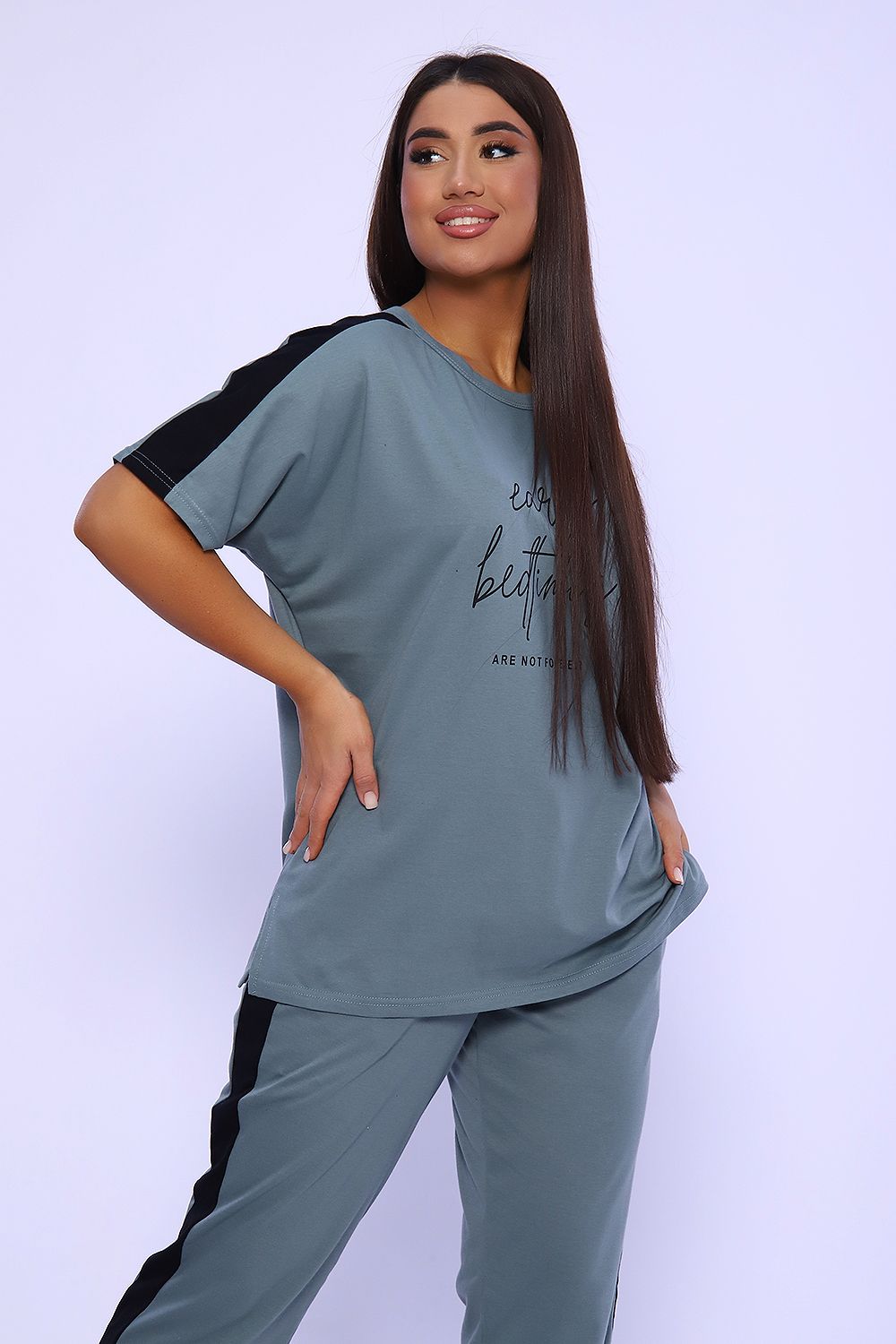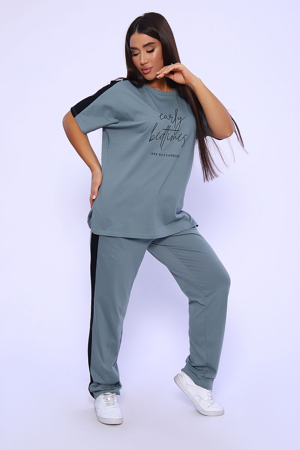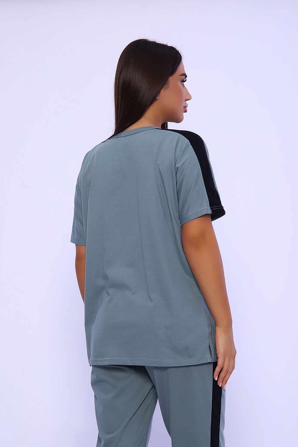 Женский костюм изготовлен из мягкого кулирного полотна, средней плотности. Костюм состоит из футболки и брюк. Футболка с округлой горловиной, обработанной окантовкой, по плечам есть лампасы, по бокам небольшие разрезы. Брюки прямые с лампасами, поясом есть карманы.
