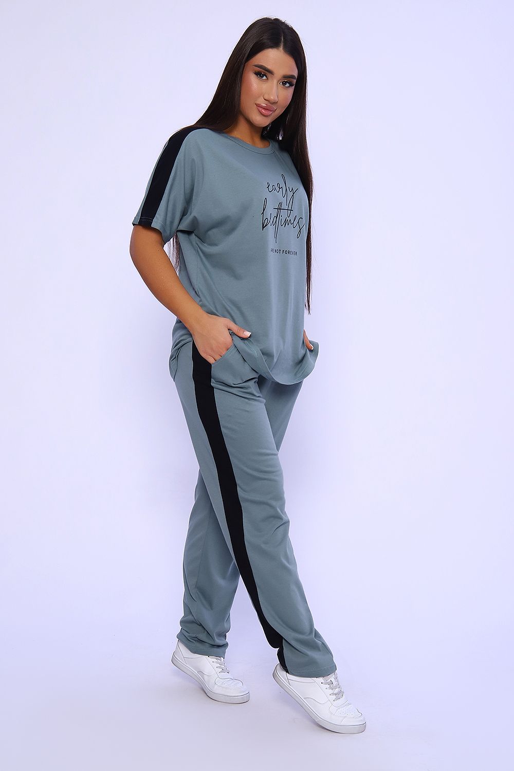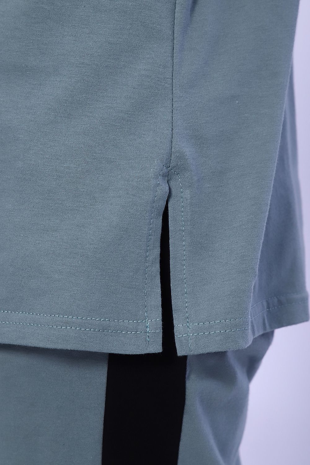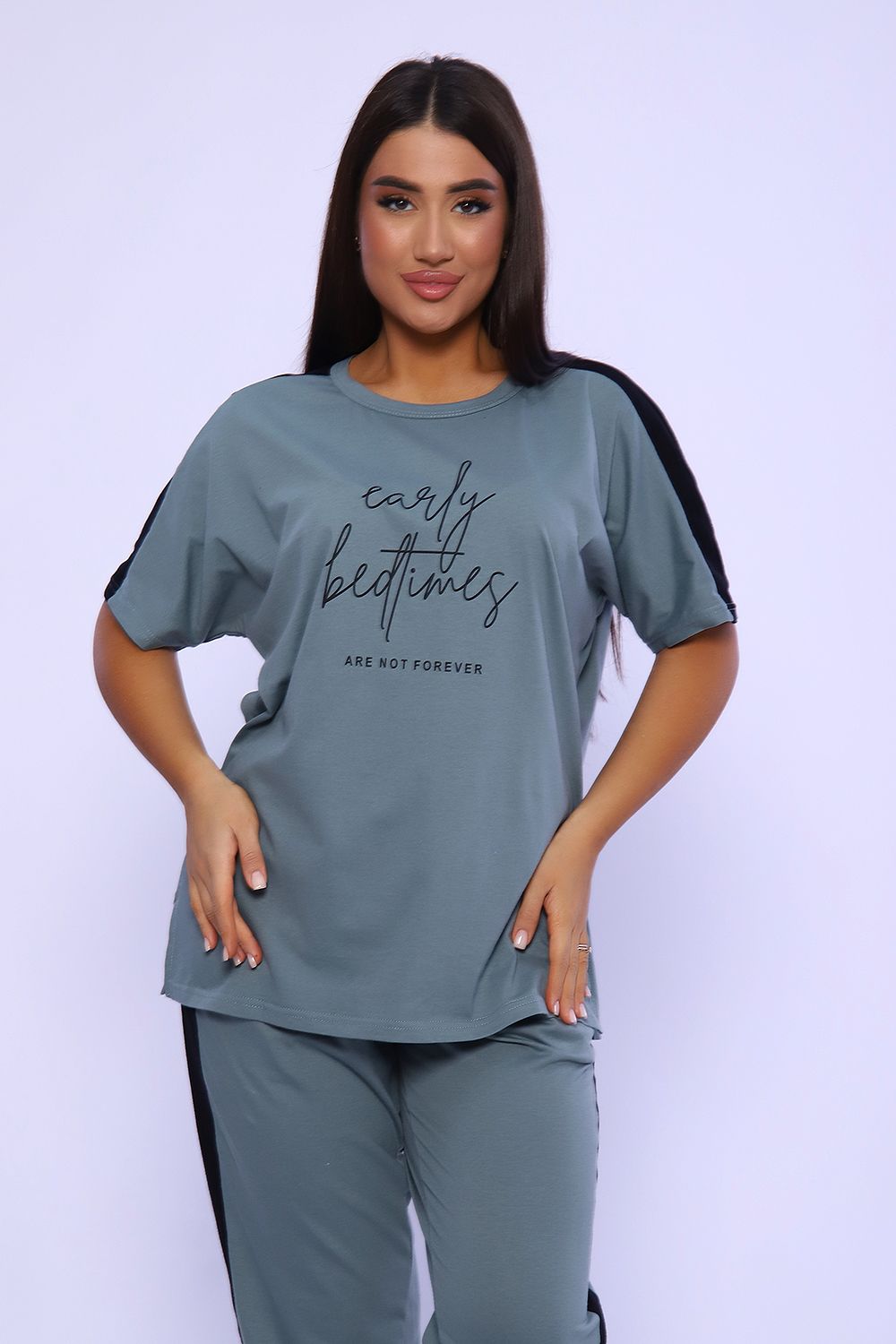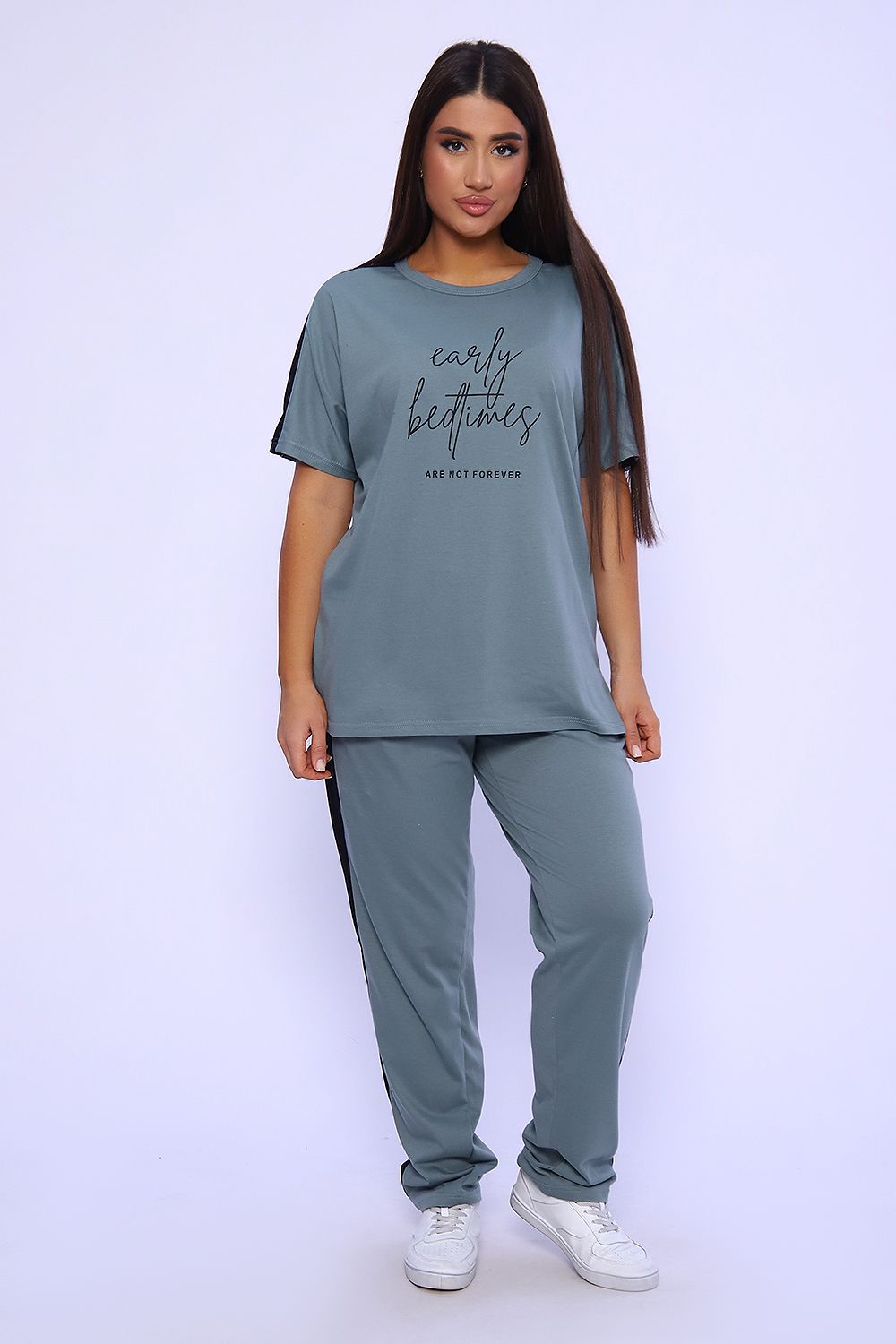 Женский костюм изготовлен из мягкого кулирного полотна, средней плотности. Костюм состоит из футболки и брюк. Футболка с округлой горловиной, обработанной окантовкой, по плечам есть лампасы, по бокам небольшие разрезы. Брюки прямые с лампасами, поясом есть карманы.