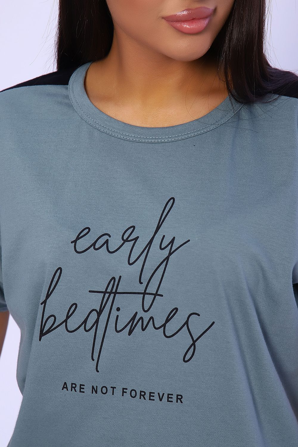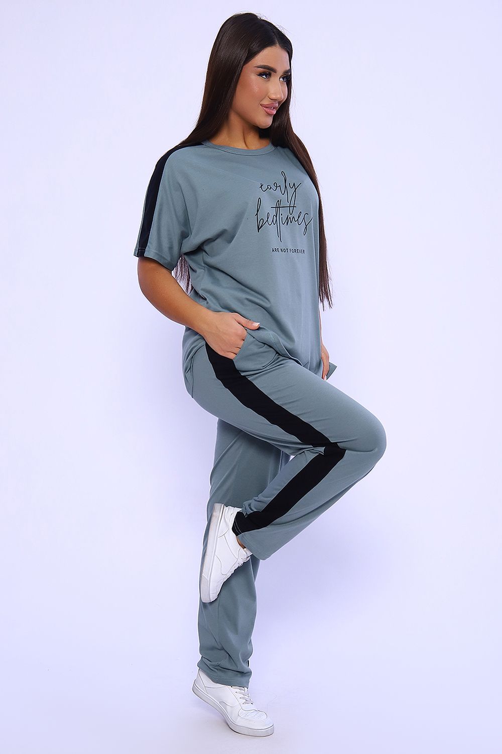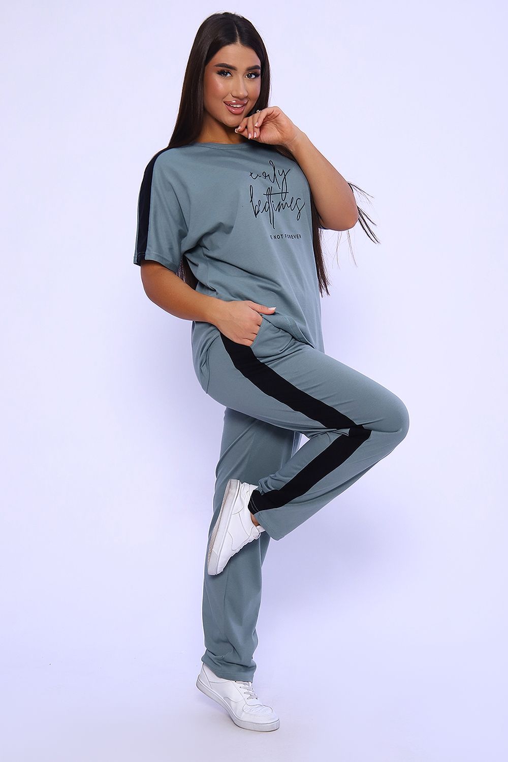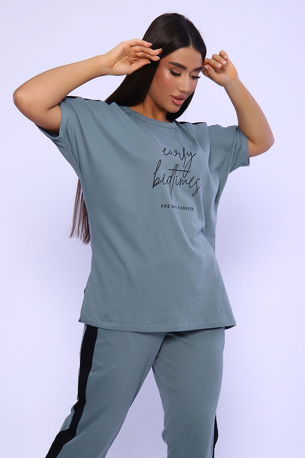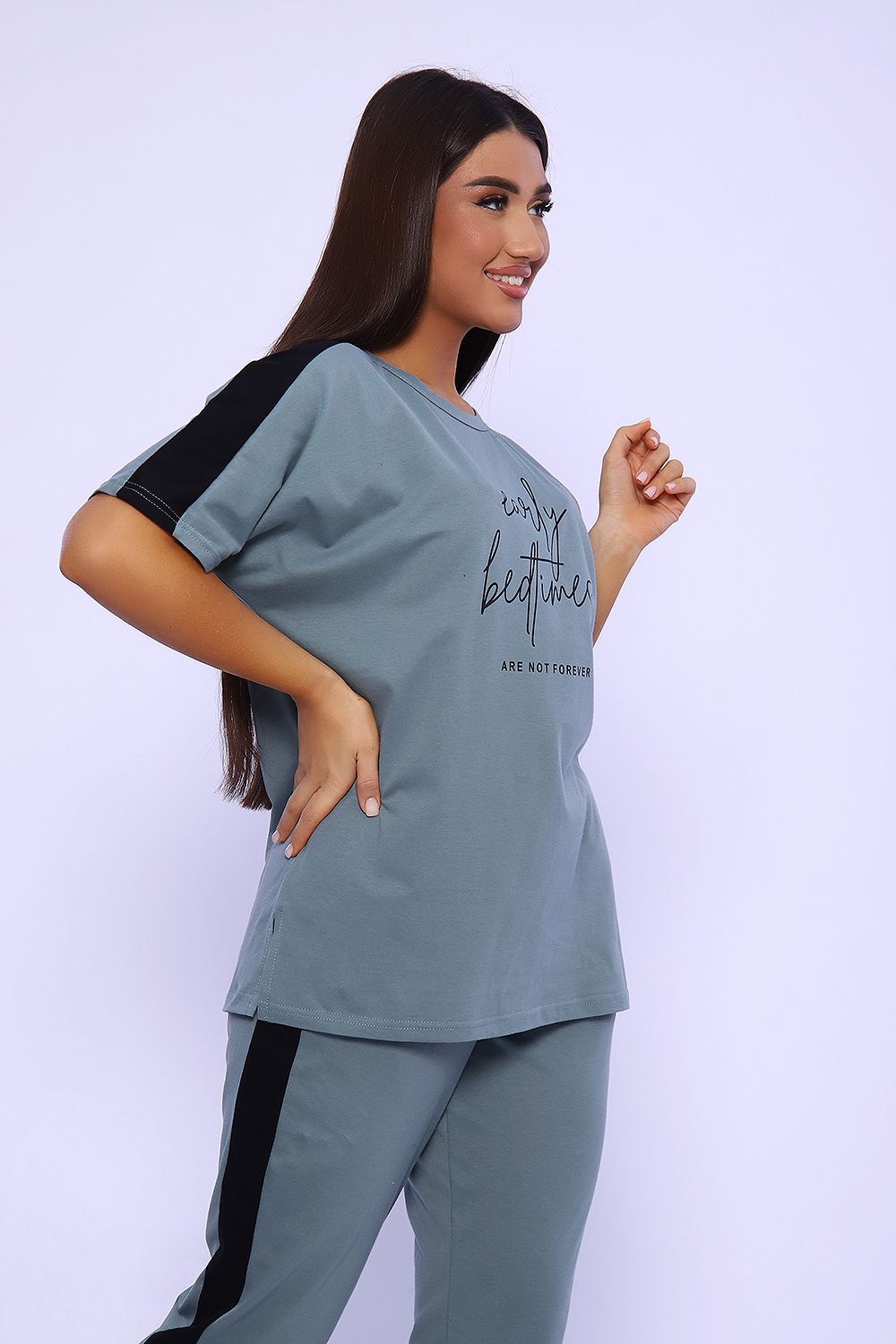 Женский костюм изготовлен из мягкого кулирного полотна, средней плотности. Костюм состоит из футболки и брюк. Футболка с округлой горловиной, обработанной окантовкой, по плечам есть лампасы, по бокам небольшие разрезы. Брюки прямые с лампасами, поясом есть карманы.