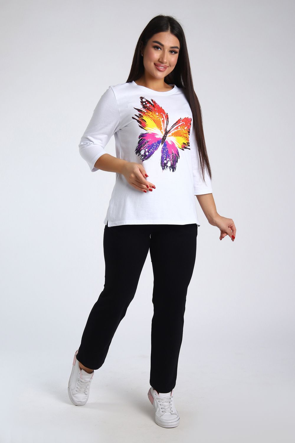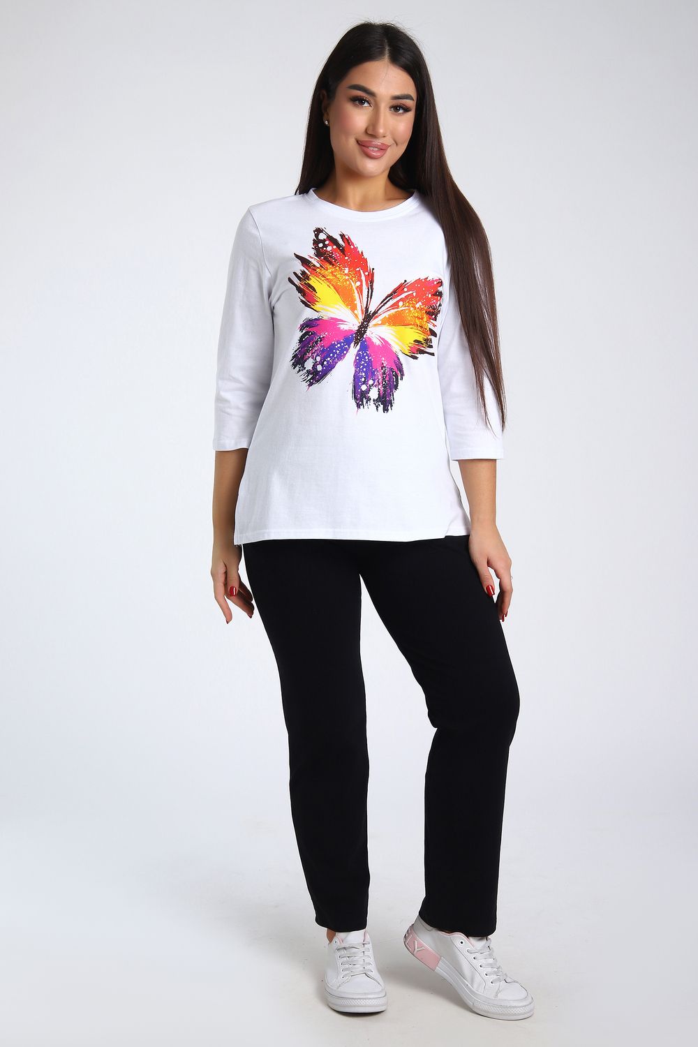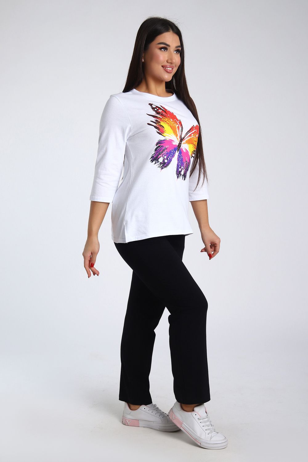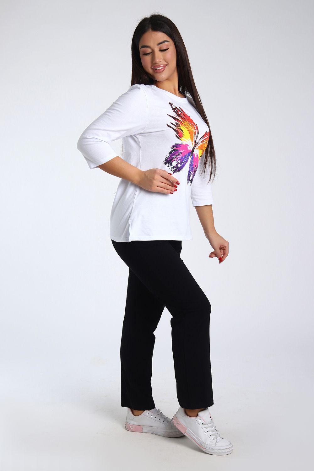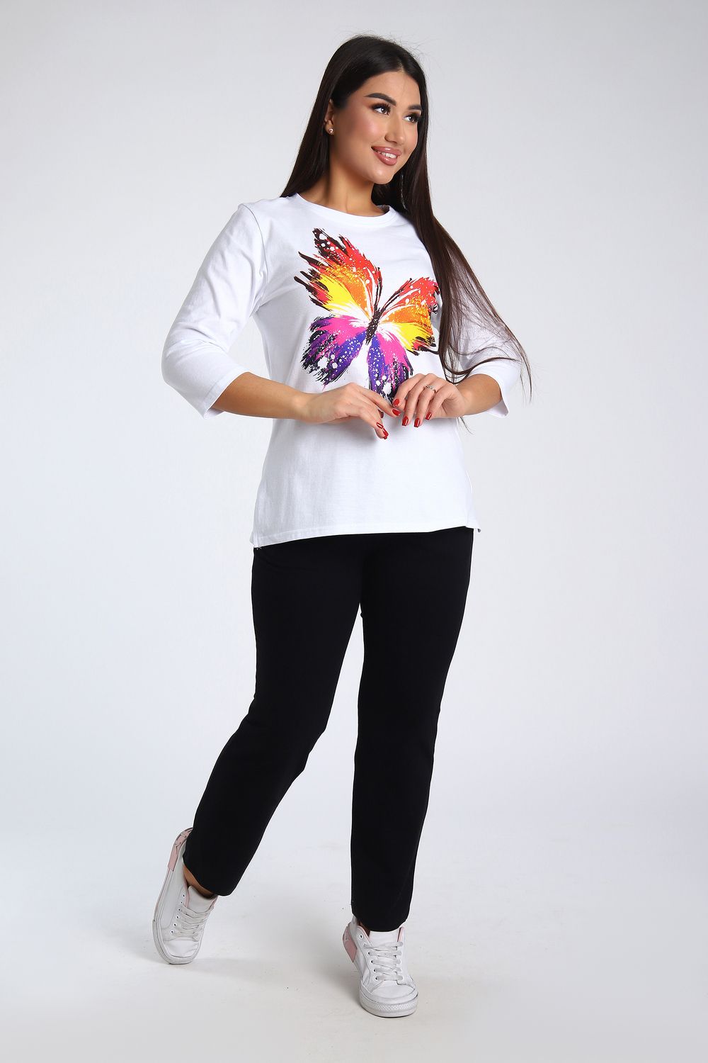 Женский костюм из двух видов ткани (хлопок-верх, с добавлением лайкры-низ). Комплект состоит из футболки с принтом и классических брюк с карманами. Подходит для повседневного использования.