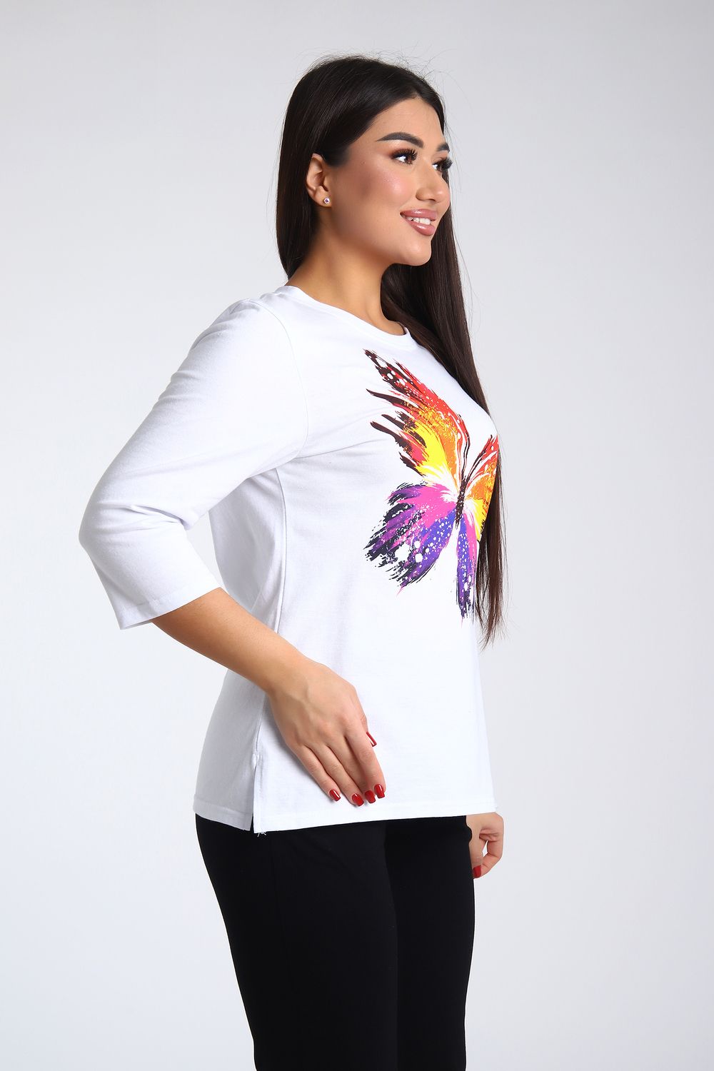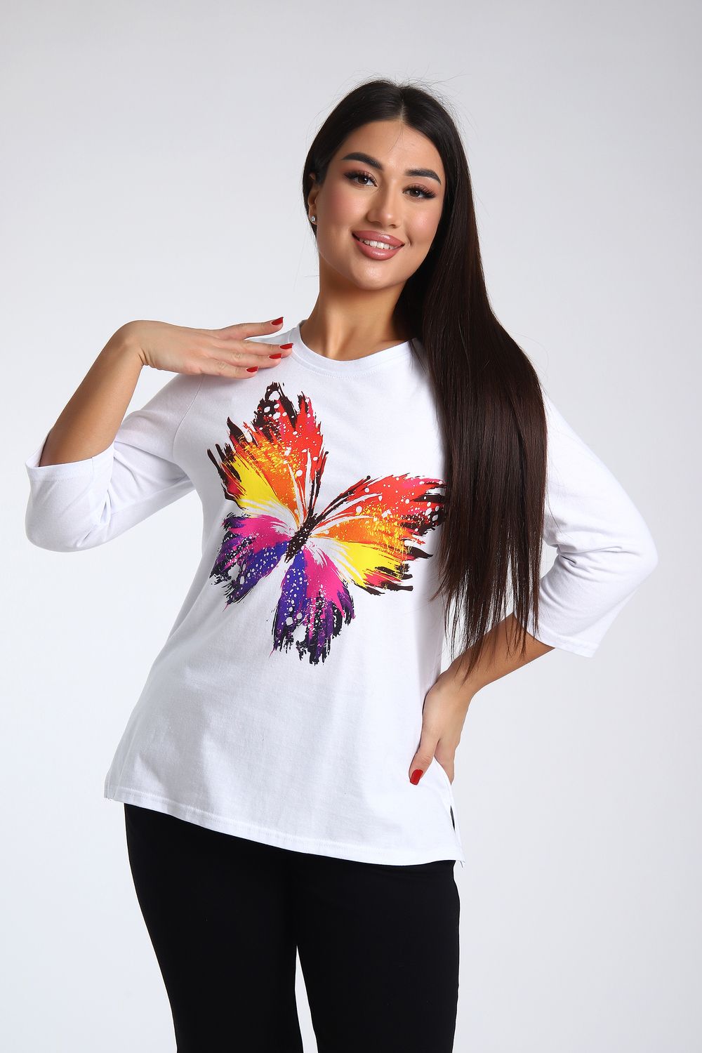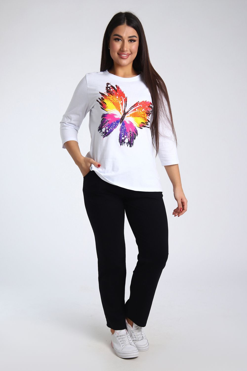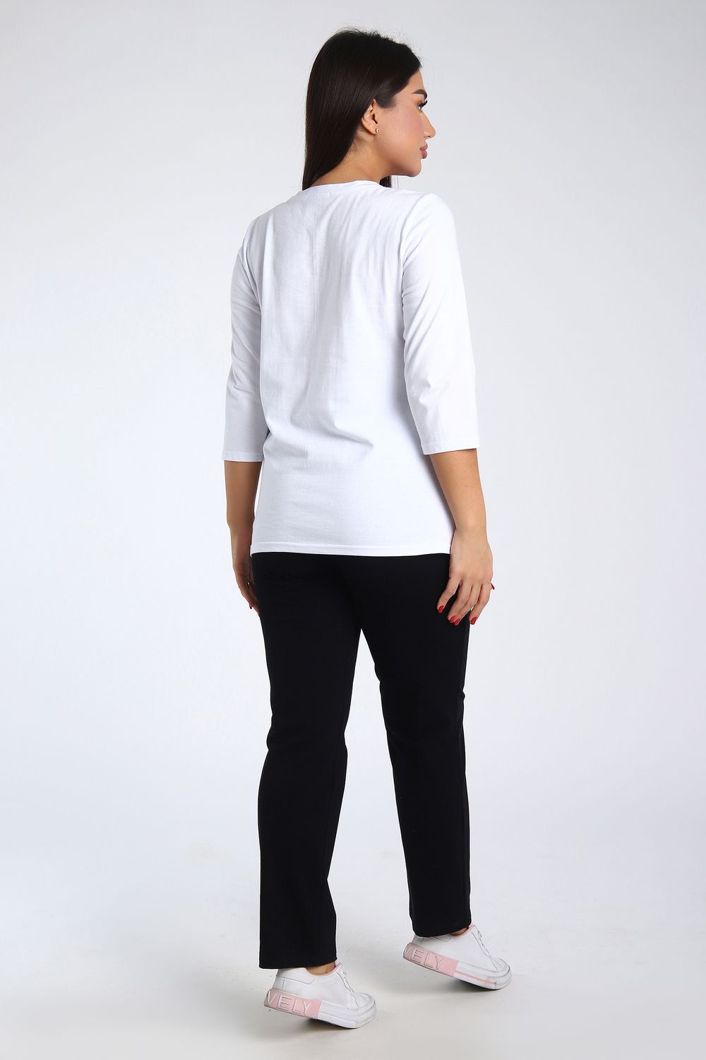 Женский костюм из двух видов ткани (хлопок-верх, с добавлением лайкры-низ). Комплект состоит из футболки с принтом и классических брюк с карманами. Подходит для повседневного использования.