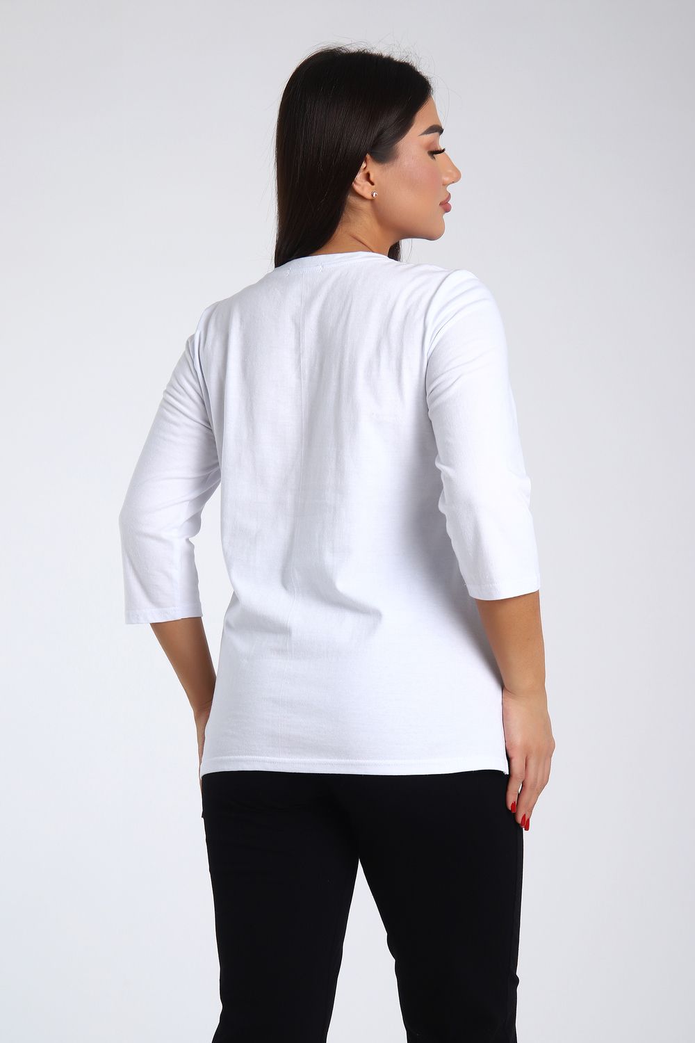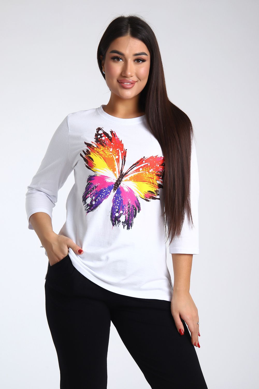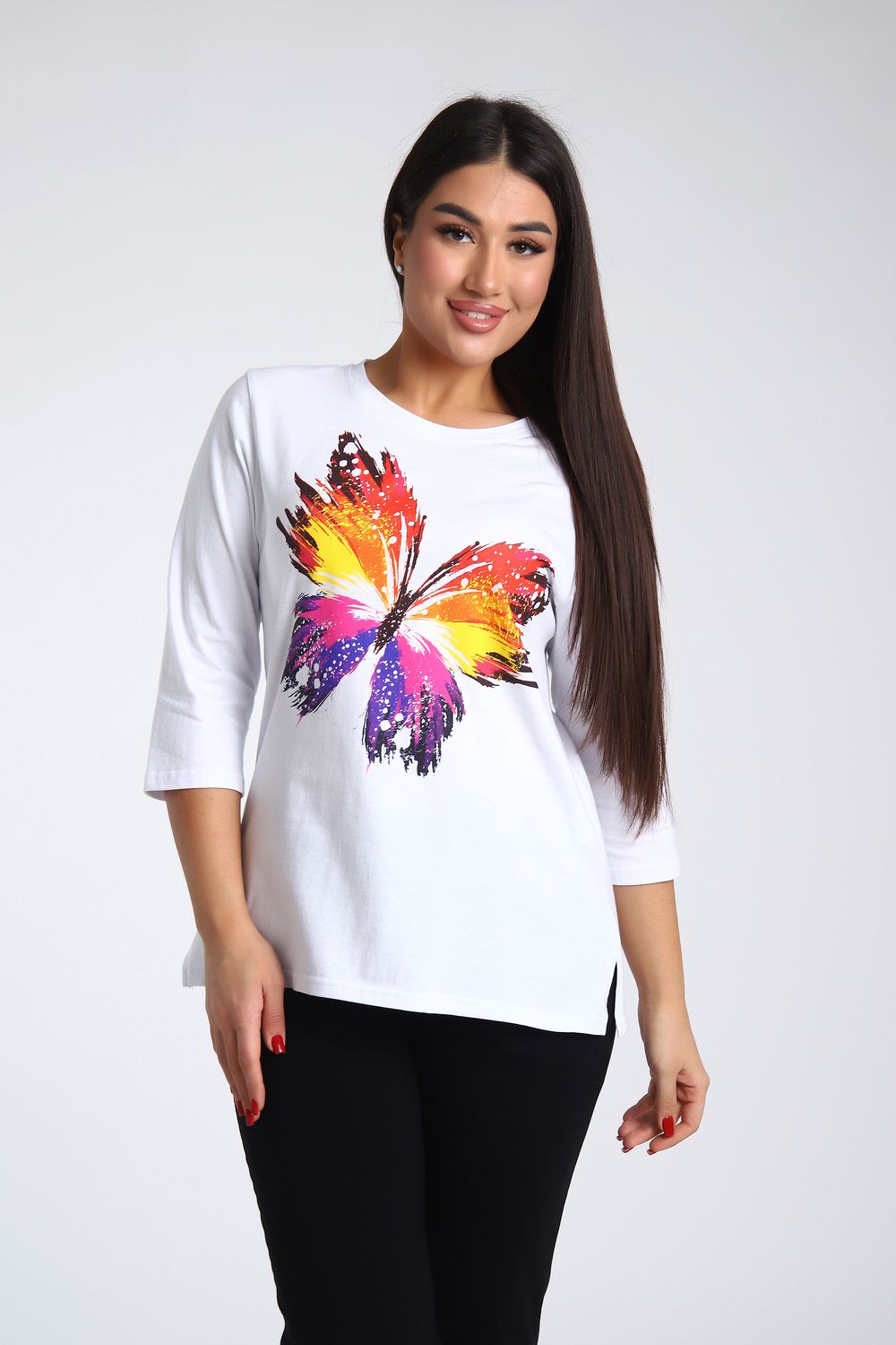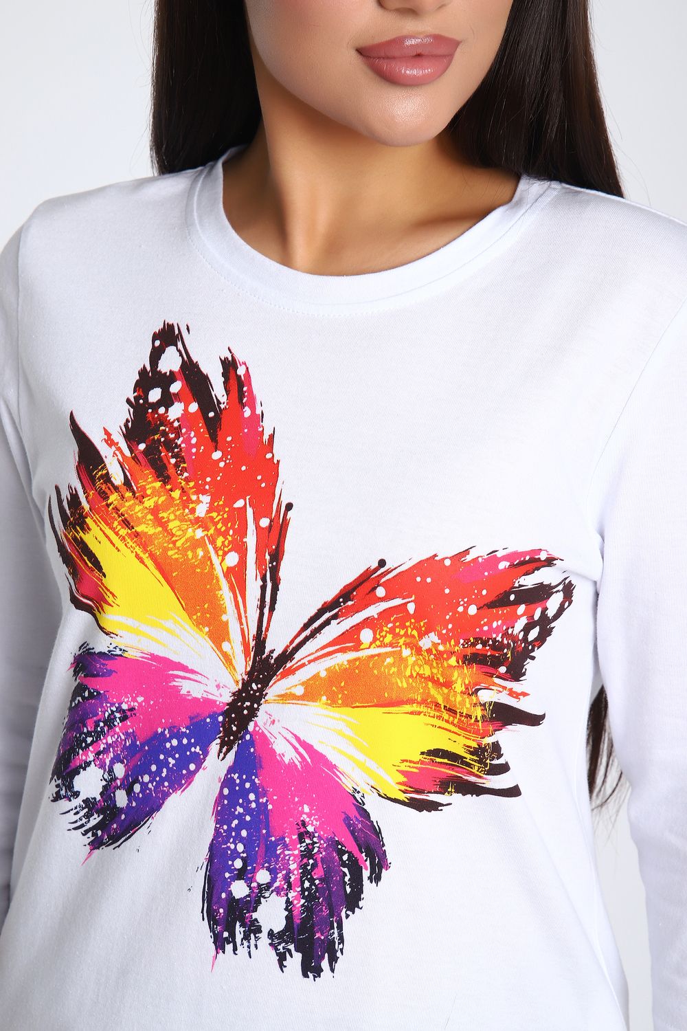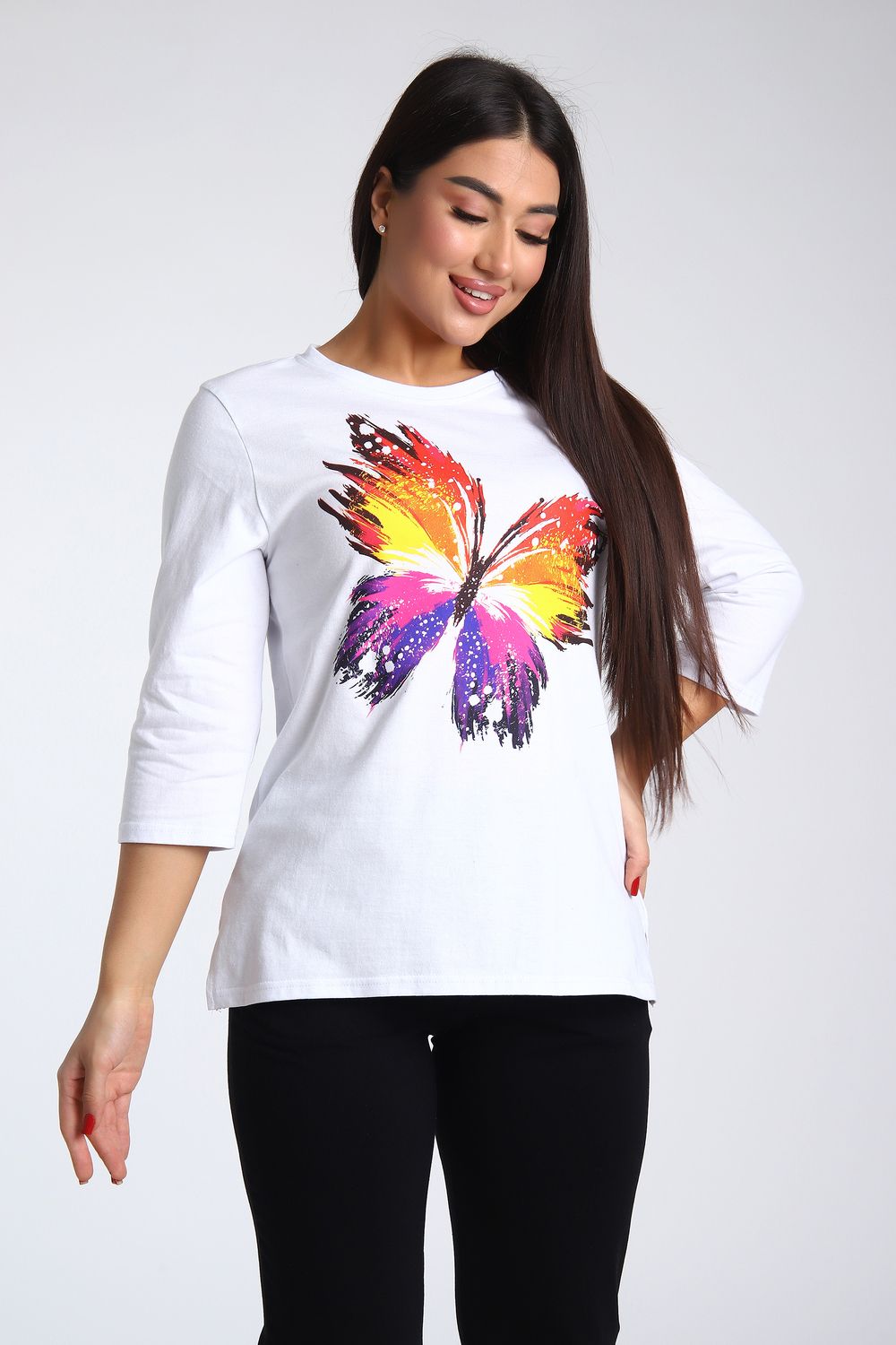 Женский костюм из двух видов ткани (хлопок-верх, с добавлением лайкры-низ). Комплект состоит из футболки с принтом и классических брюк с карманами. Подходит для повседневного использования.