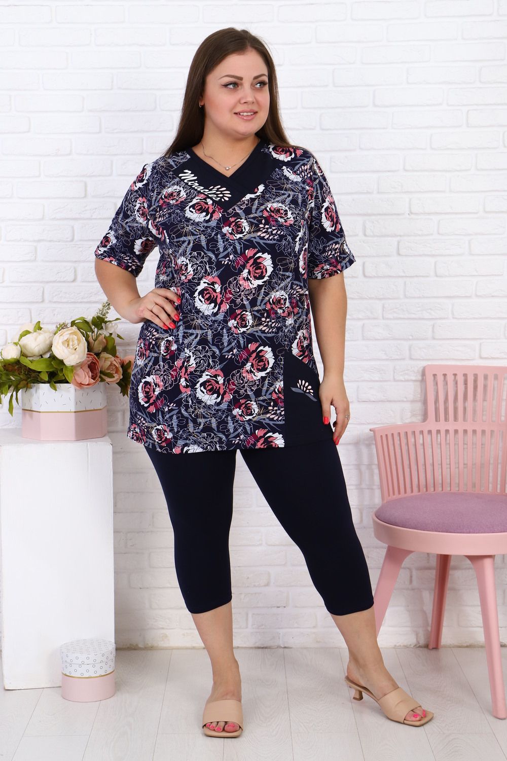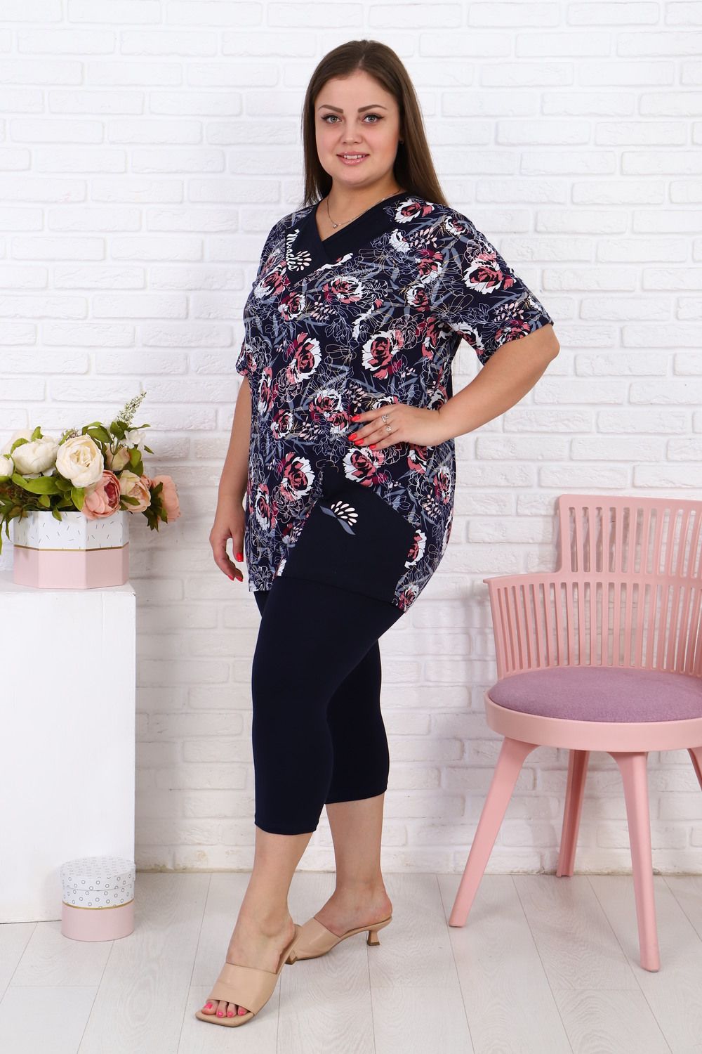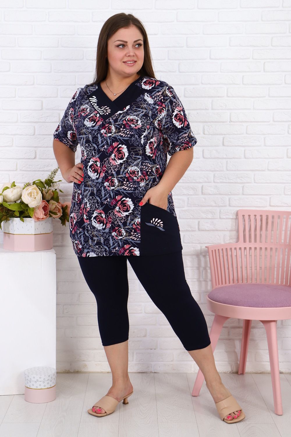 Женский дачный костюм с леггинсами темно-синего однотонного цвета и туникой с карманом темно-синего цвета с розовыми и белыми цветами, небольшие принты на кармане и планке у ворота