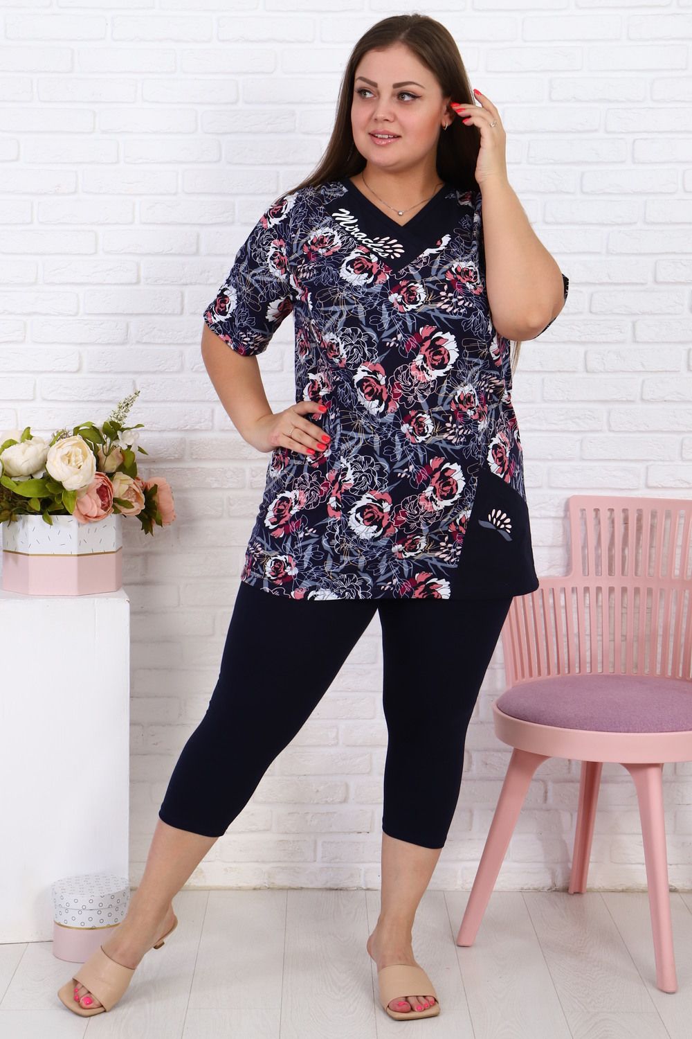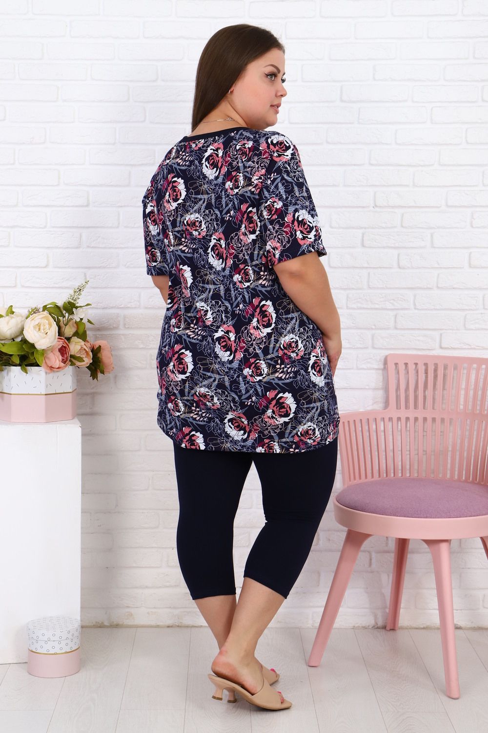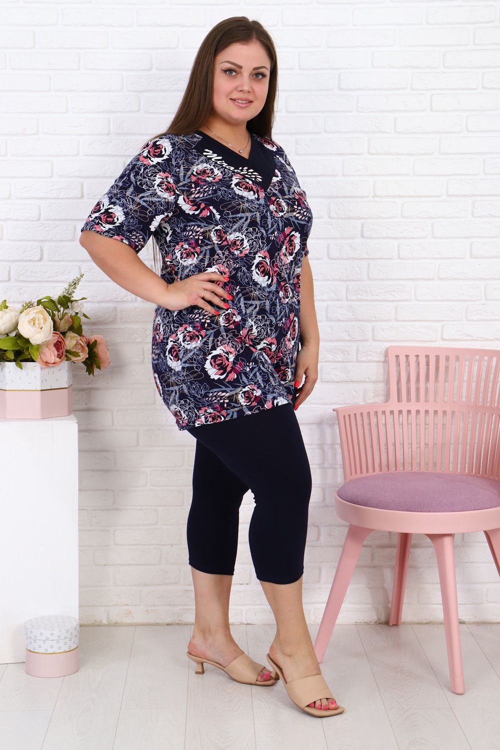 Женский дачный костюм с леггинсами темно-синего однотонного цвета и туникой с карманом темно-синего цвета с розовыми и белыми цветами, небольшие принты на кармане и планке у ворота
