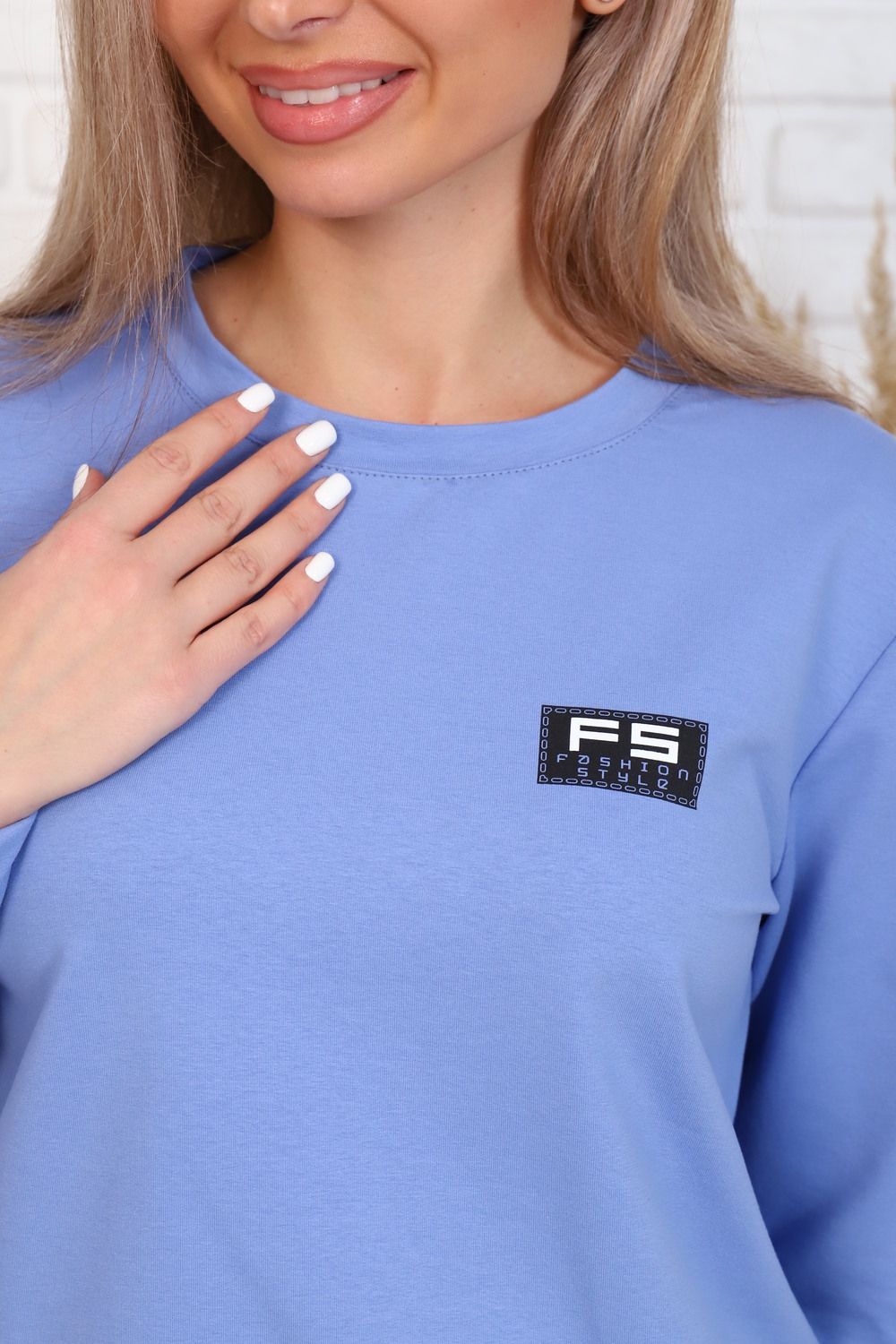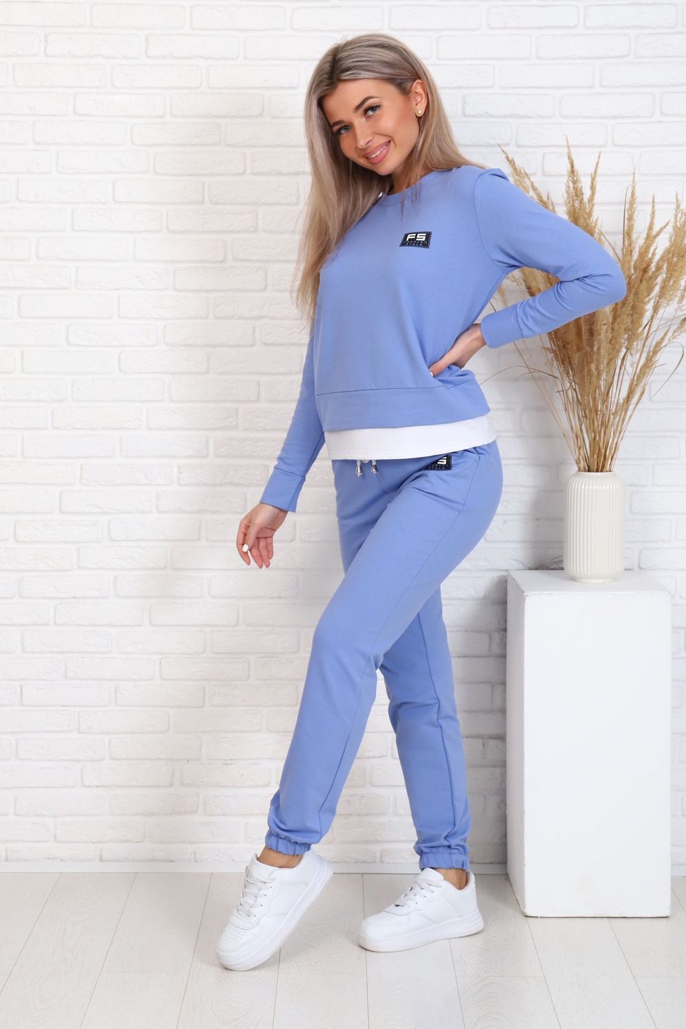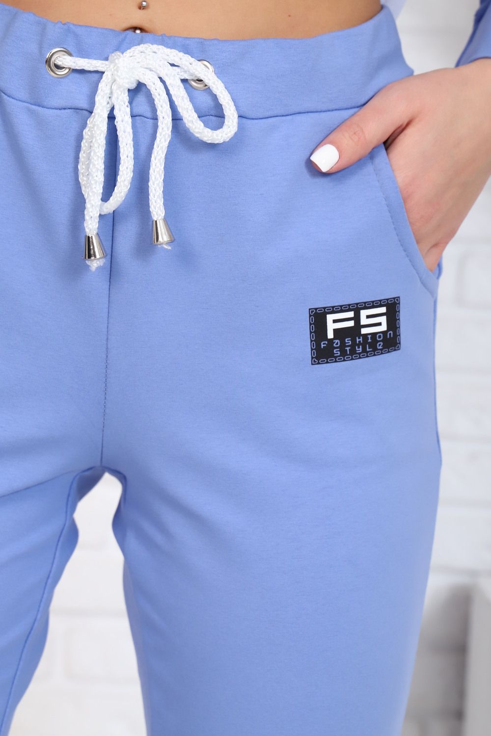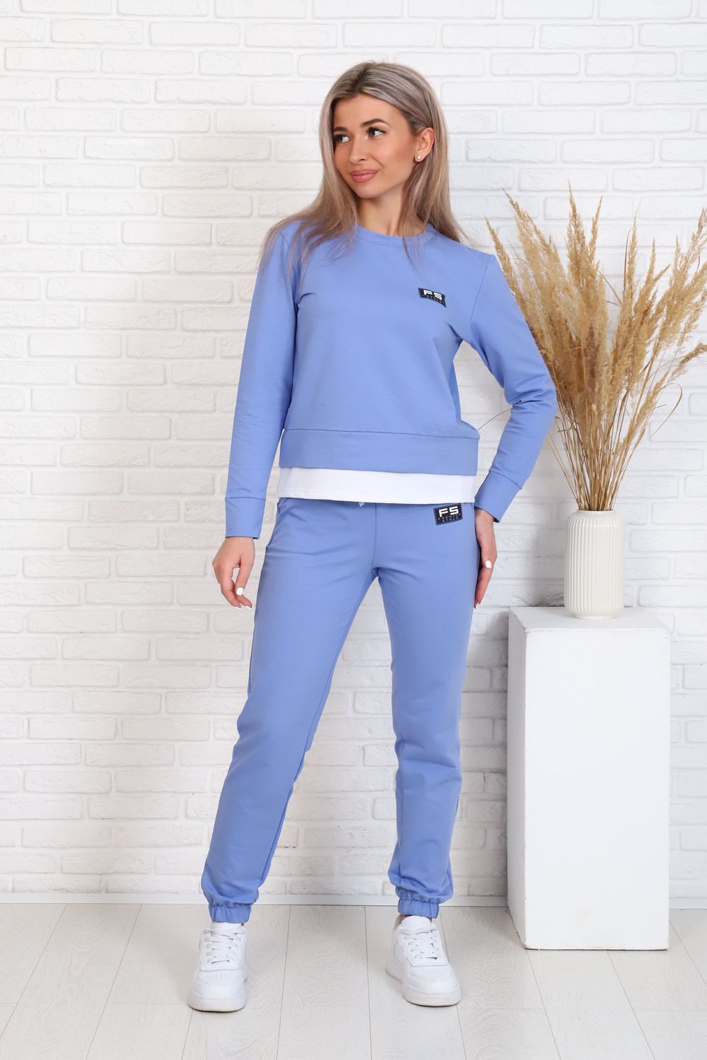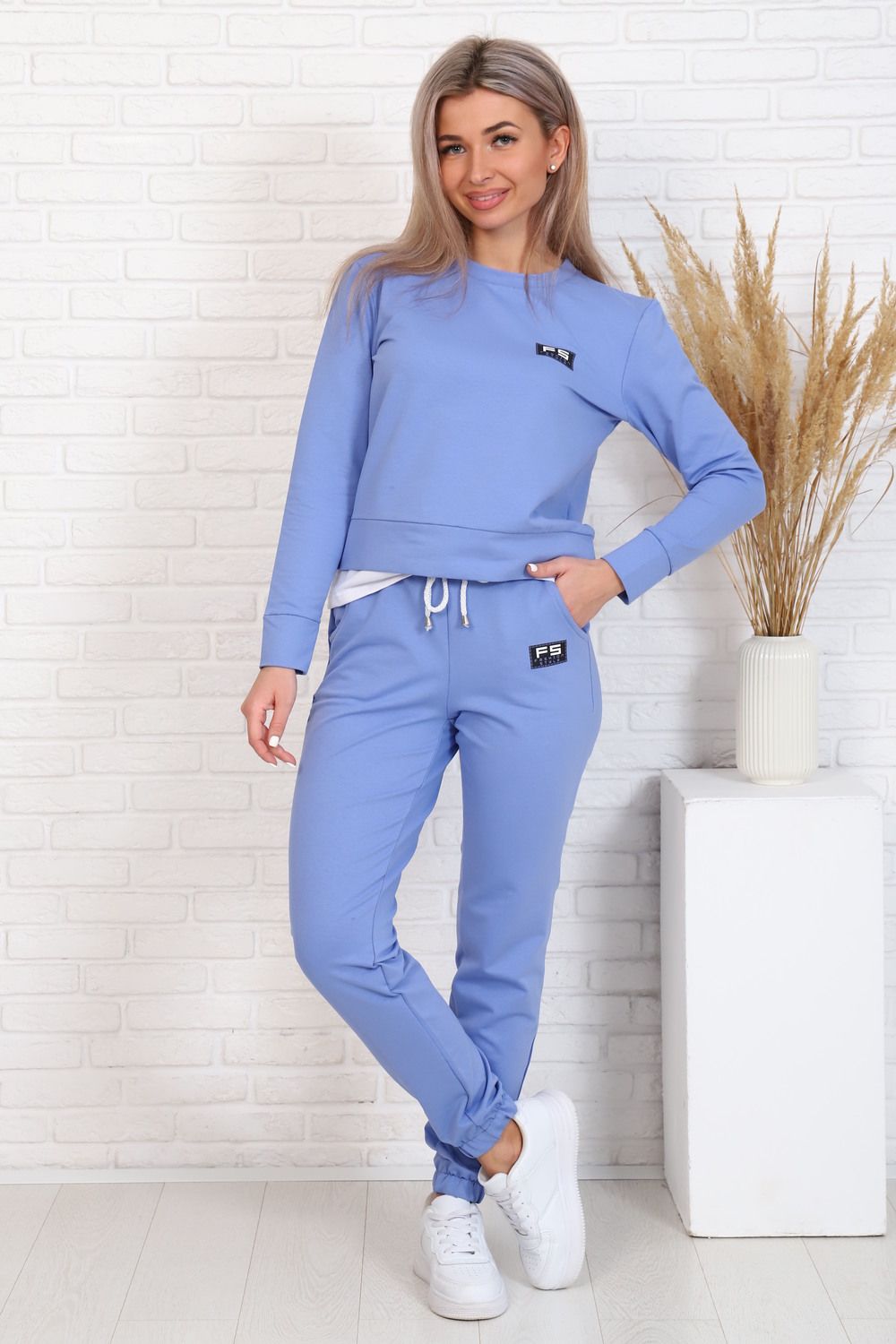 Костюм женский трикотажный - футболка и брюки. Футболка с длинным рукавом, с отделкой по низу контрастного цвета. Брюки с завязками и втачными боковыми карманами. На футболке и брюках небольшие отделочные печати