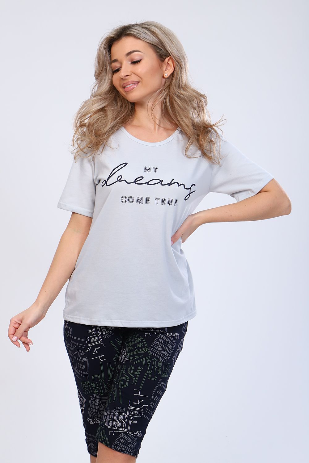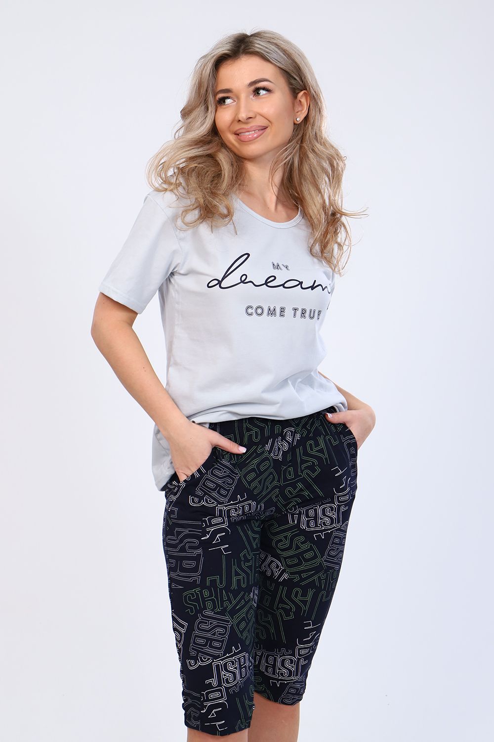 Костюм состоит из футболки и бридж. Футболка с короткими рукавами и принтом. Бриджи с карманами. Неотъемлемый элемент домашнего гардероба.