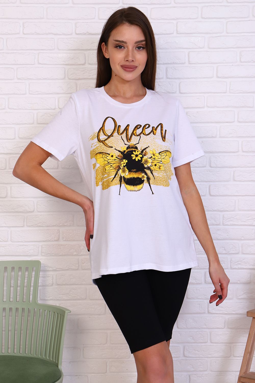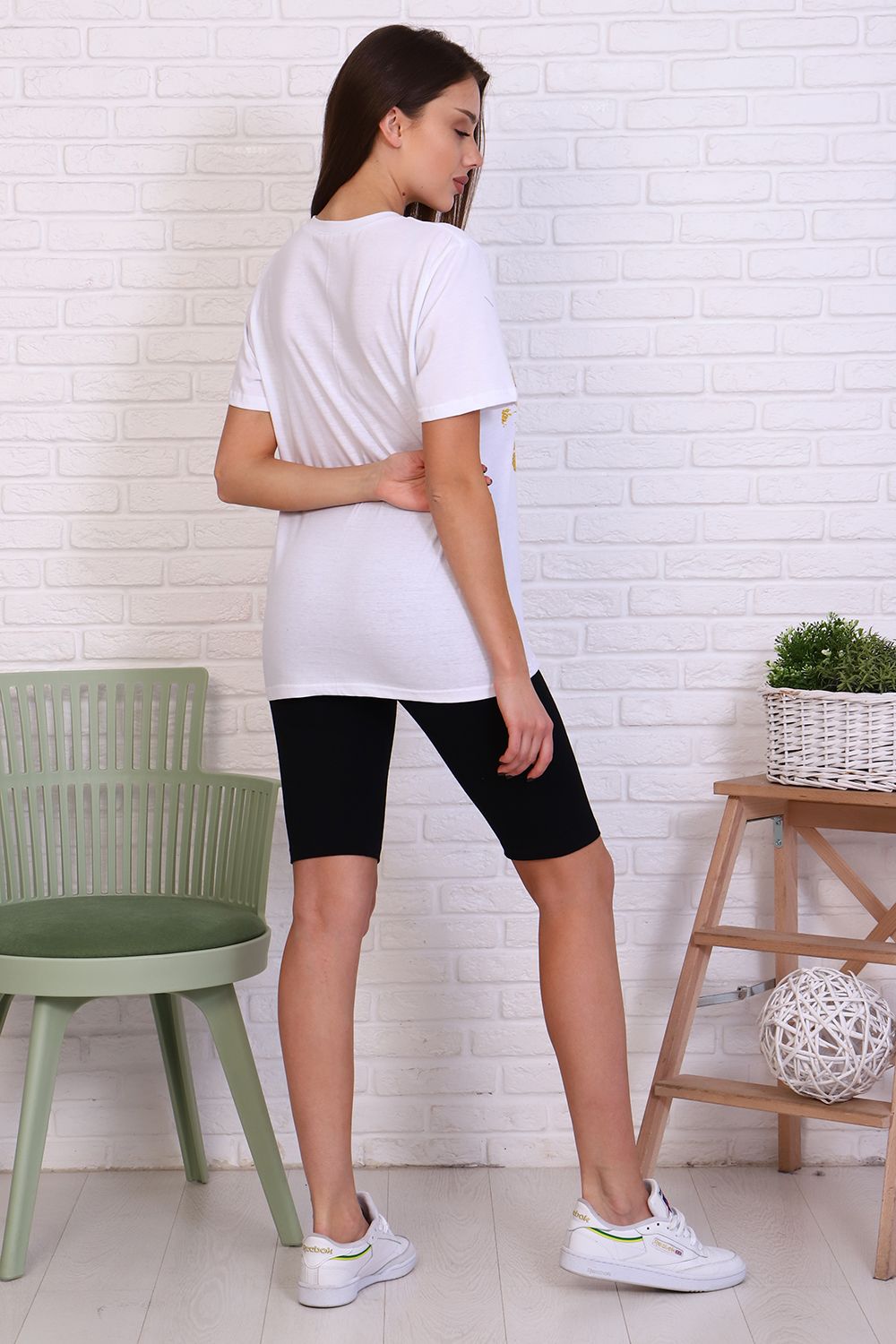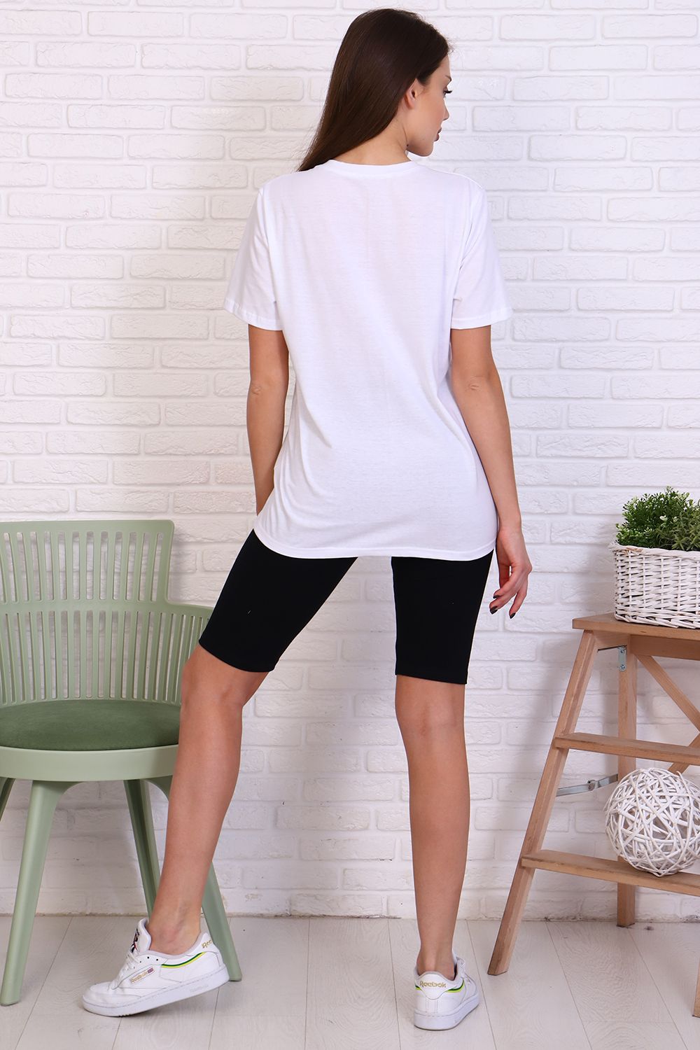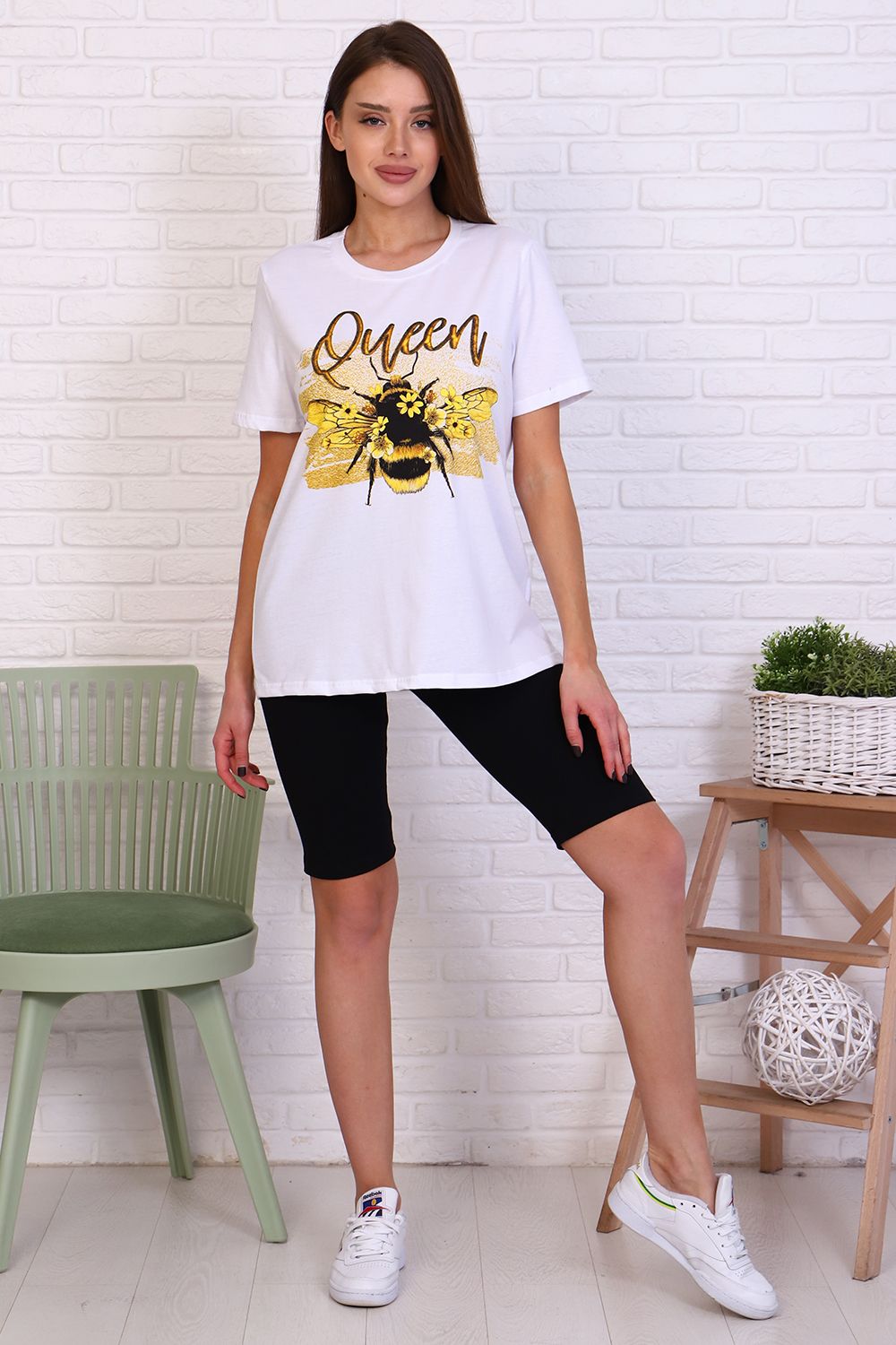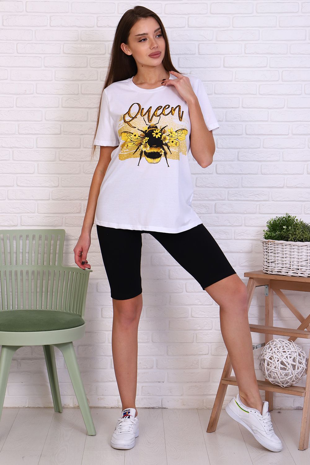 Молодежный костюм футболка и велосипедки. Футболка из кулирки 100% хлопок свободного кроя, стиль oversize, втачным коротким рукавом горловина округлой формы. На полочке изделия принт. Низ рукава и низ изделия подгибка. Велосипедки из кулирки с лайкрой облегающего силуэта без бокового шва. Низ изделия подгибка.