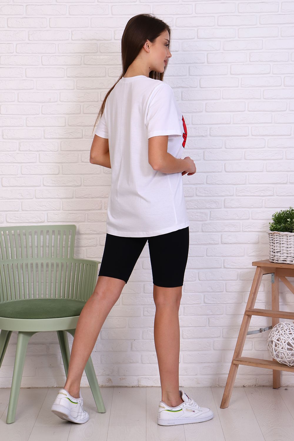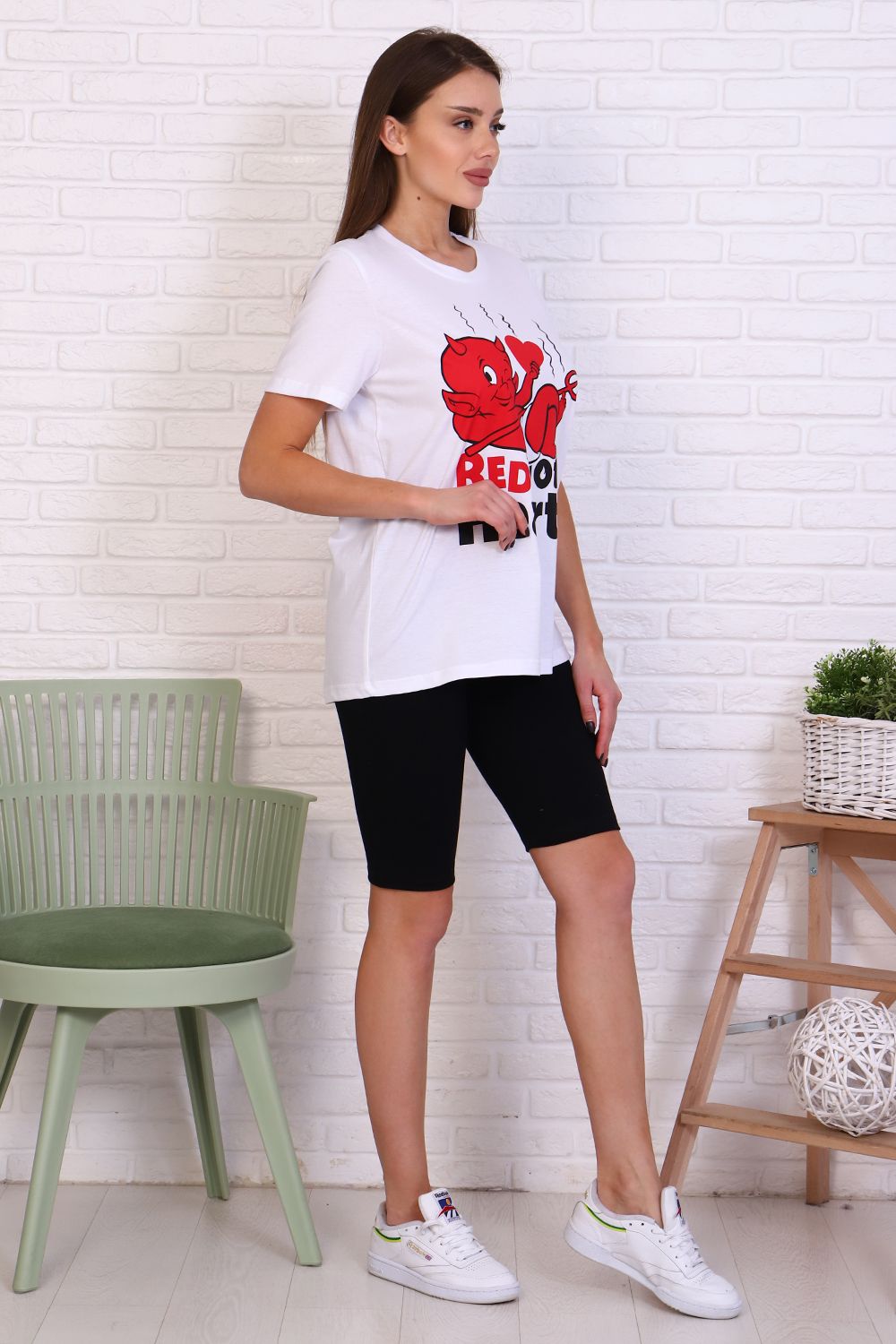Молодежный костюм футболка и велосипедки. Футболка из кулирки 100% хлопок свободного кроя, стиль oversize, втачным коротким рукавом горловина округлой формы. На полочке изделия принт. Низ рукава и низ изделия подгибка. Велосипедки из кулирки с лайкрой облегающего силуэта без бокового шва. Низ изделия подгибка.