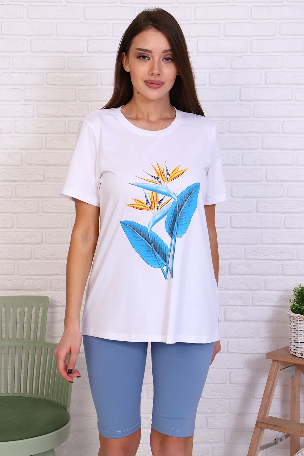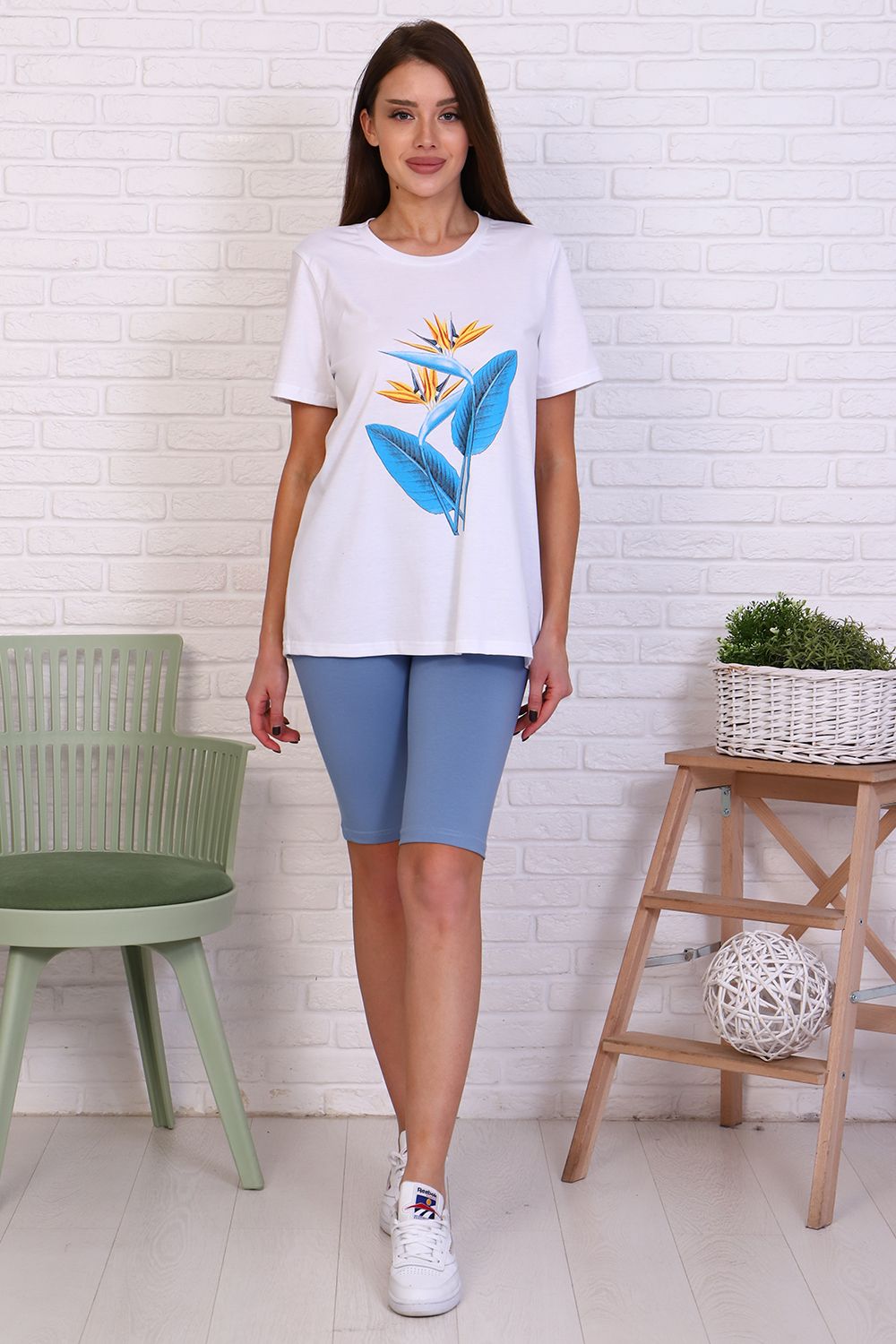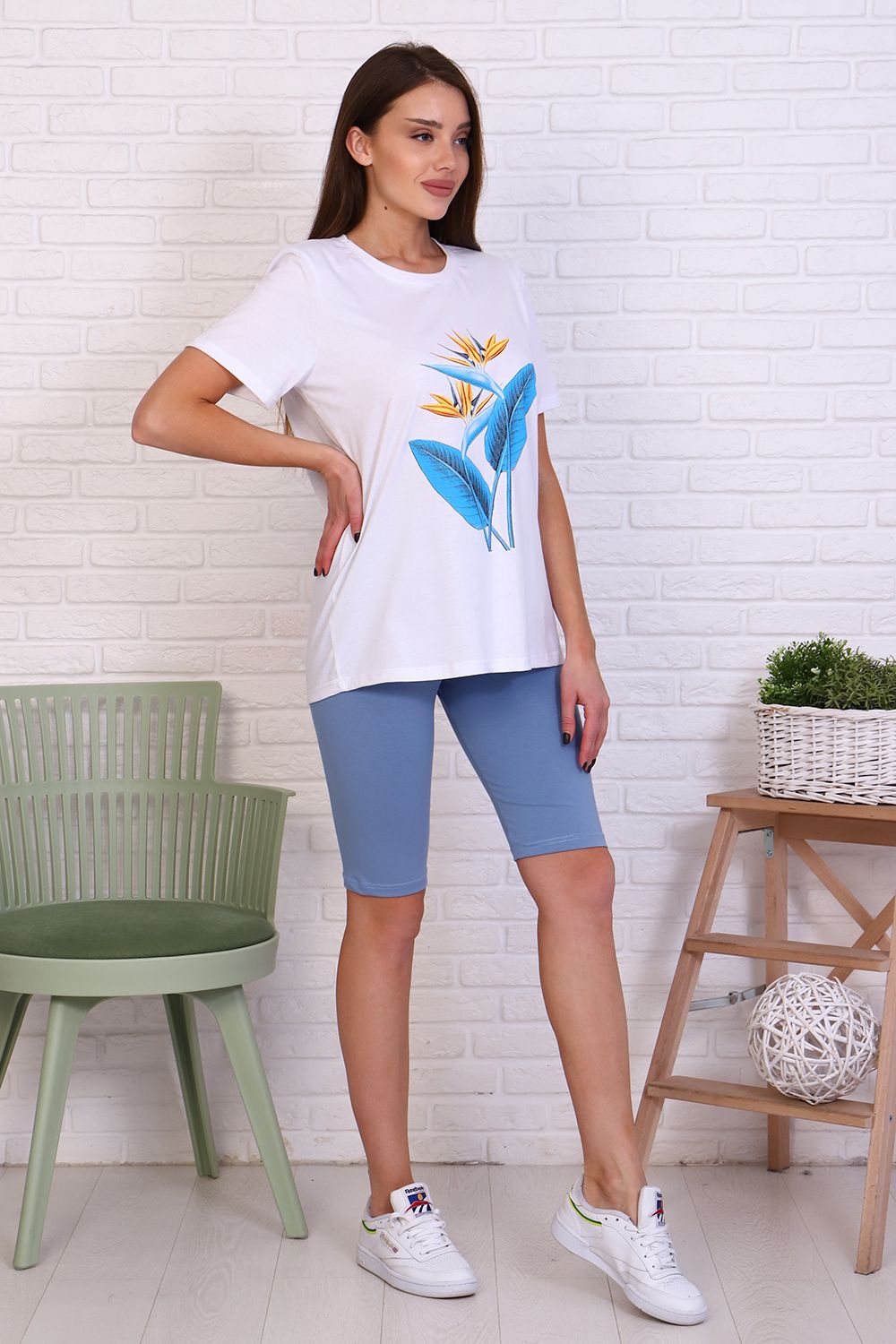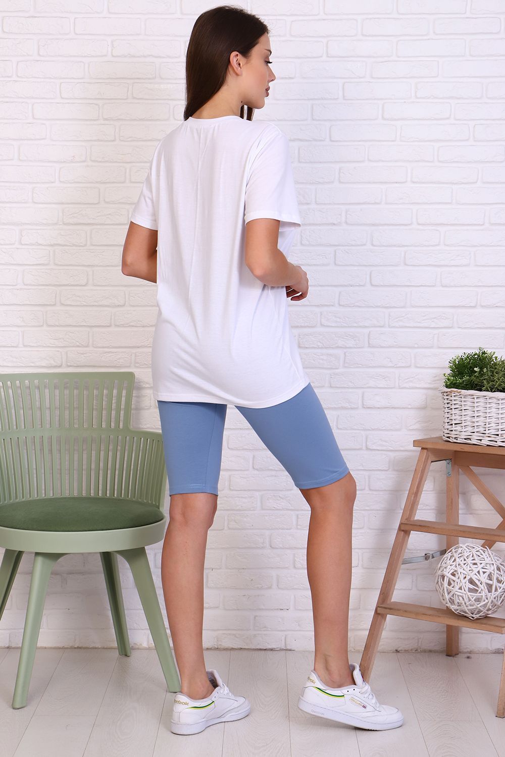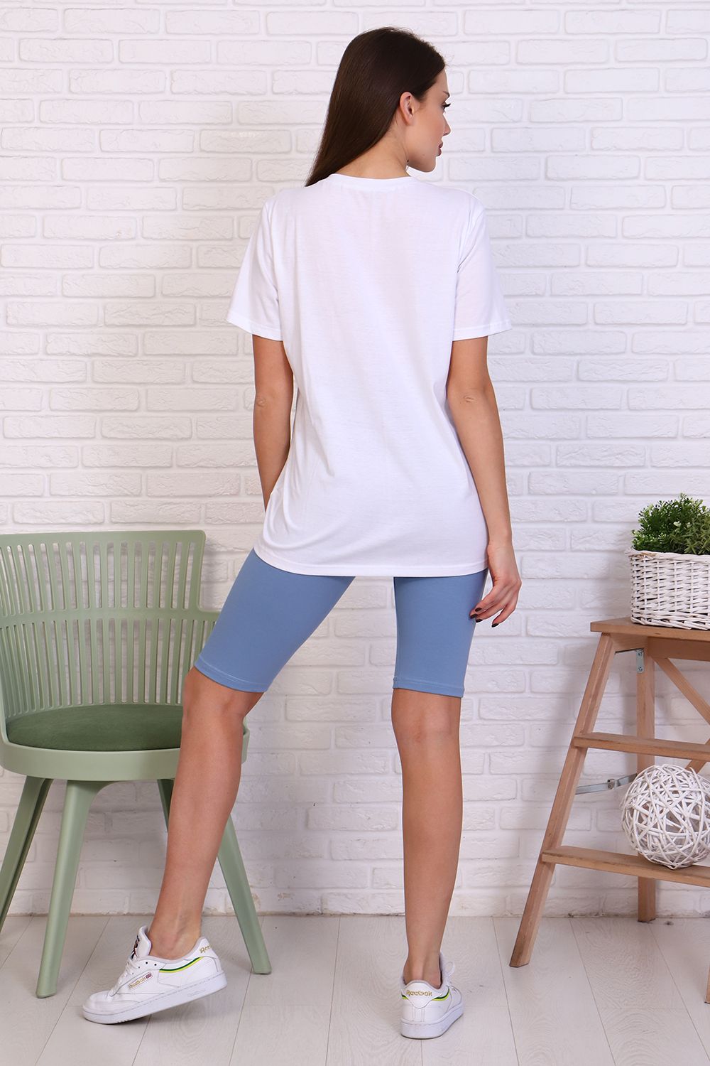 Молодежный костюм футболка и велосипедки. Футболка из кулирки 100% хлопок свободного кроя, стиль oversize, втачным коротким рукавом горловина округлой формы. На полочке изделия принт. Низ рукава и низ изделия подгибка. Велосипедки из кулирки с лайкрой облегающего силуэта без бокового шва. Низ изделия подгибка.