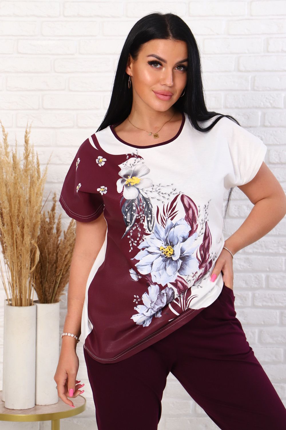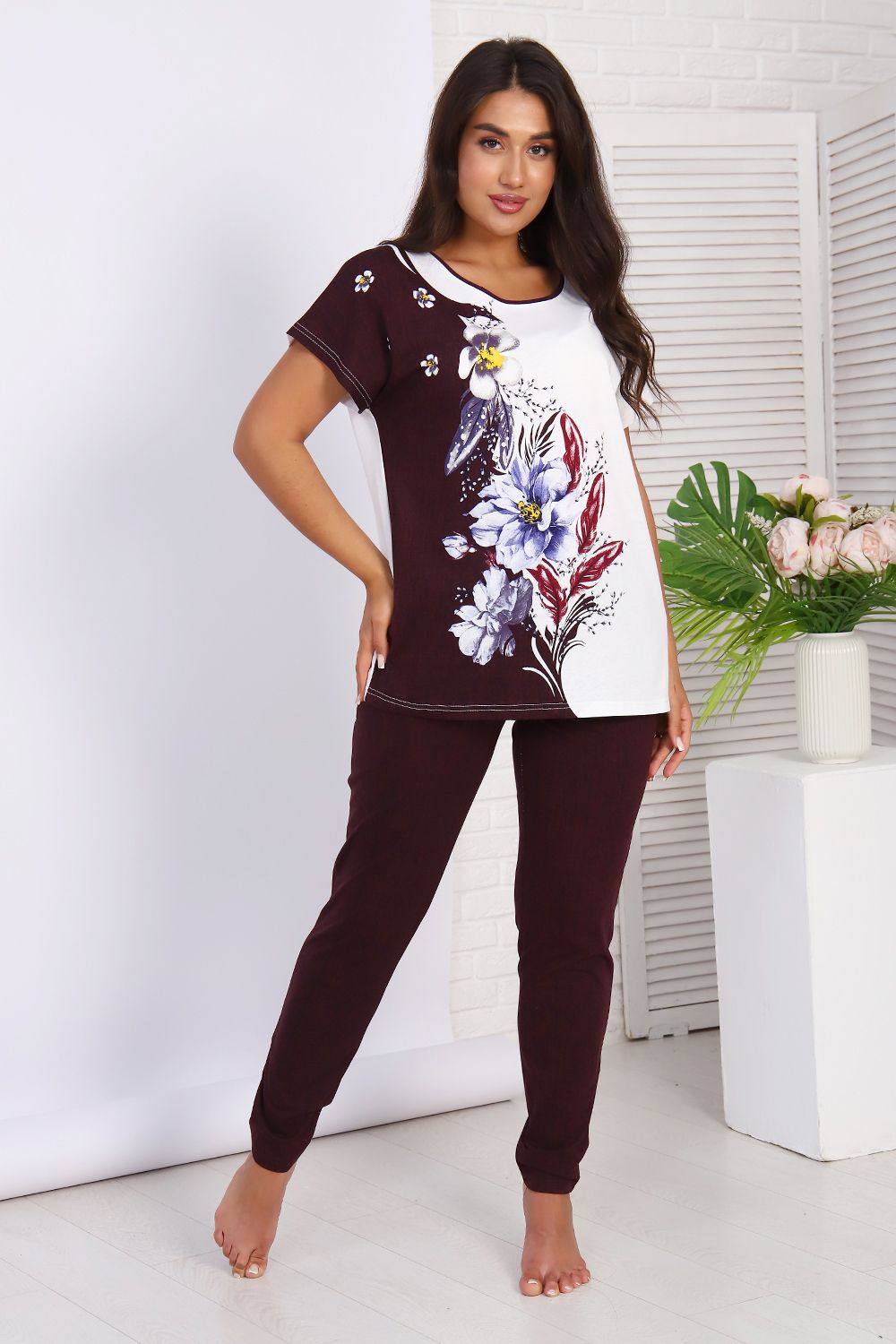 Женский костюм с брюками - идеальный вариант как домашней одежды, костюма для прогулок и путешествий, но так же и как пижама для сна. Для пошива используется ткань со 100% содержанием хлопка. Идеальное лекало костюма позволит подчеркнуть все достоинства фигуры, в то же время модель не сковывают движений и позволяет чувствовать себя комфортно в любых условиях. Особую изюминку изделию придает эффектный дизайн в виде сочетания двух контрастных друг к другу цветов, место стыка которых декорировано изображением прекрасного букета. Так приятно в конце рабочего дня сменить повседневный офисный костюм на такую мягкую и приятную трикотажную одежду!