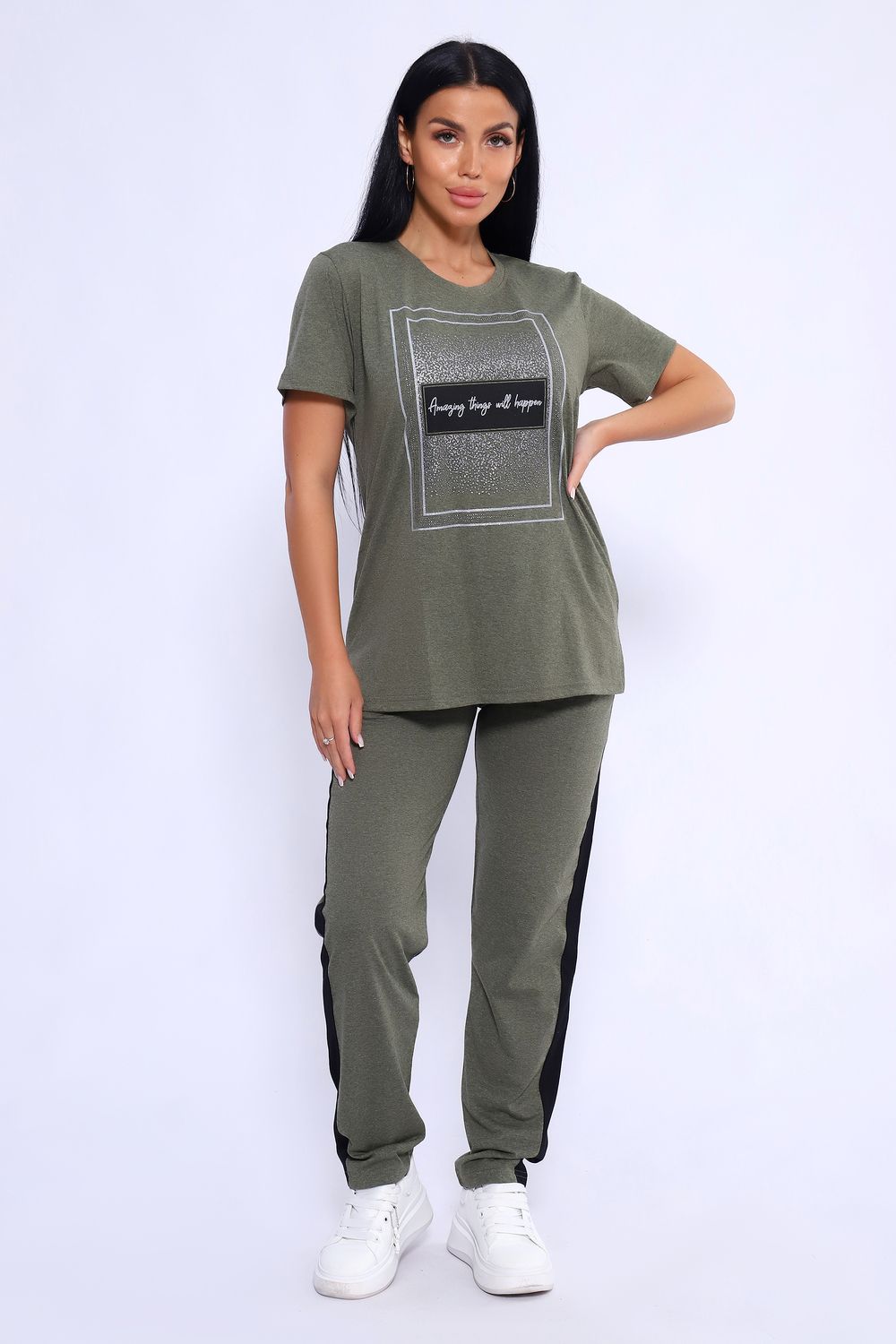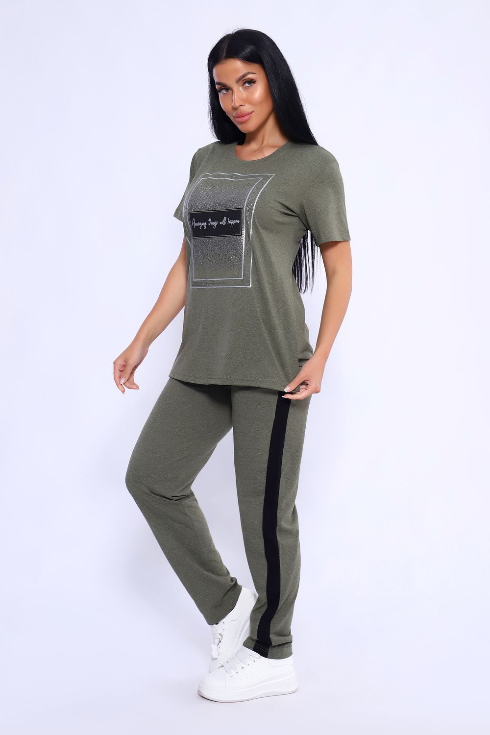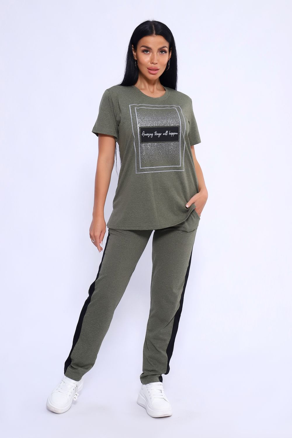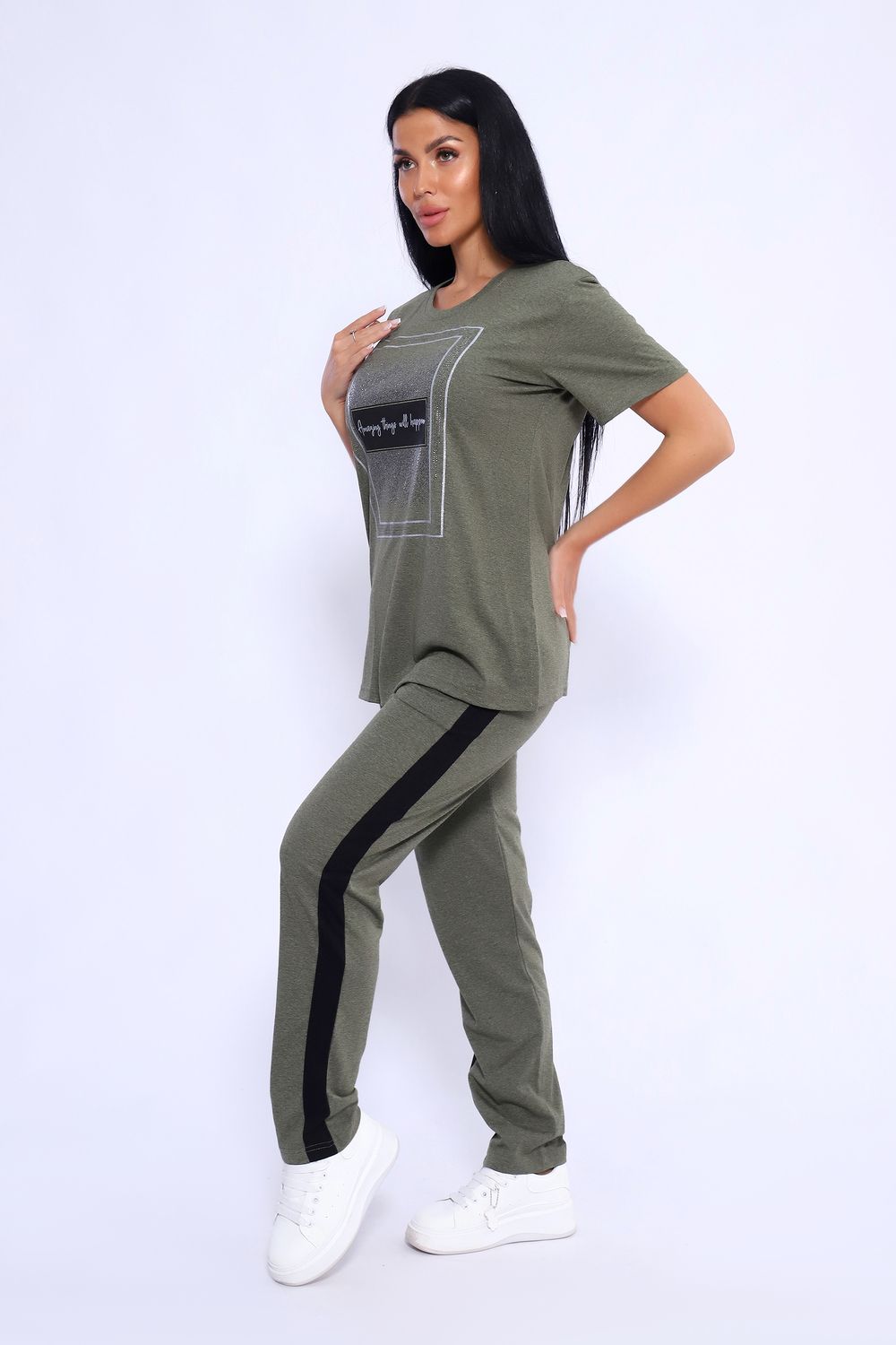 Классический и удобный трикотажный костюм с брюками из легкой хлопковой ткани! В комплекте костюма представлены кофта свободного кроя и брюки универсальной посадки с лампасами по бокам. Кофта украшена лаконичным принтом. Костюм - идеальный вариант домашней одежды для женщин, также прекрасно подойдет и для повседневной носки.