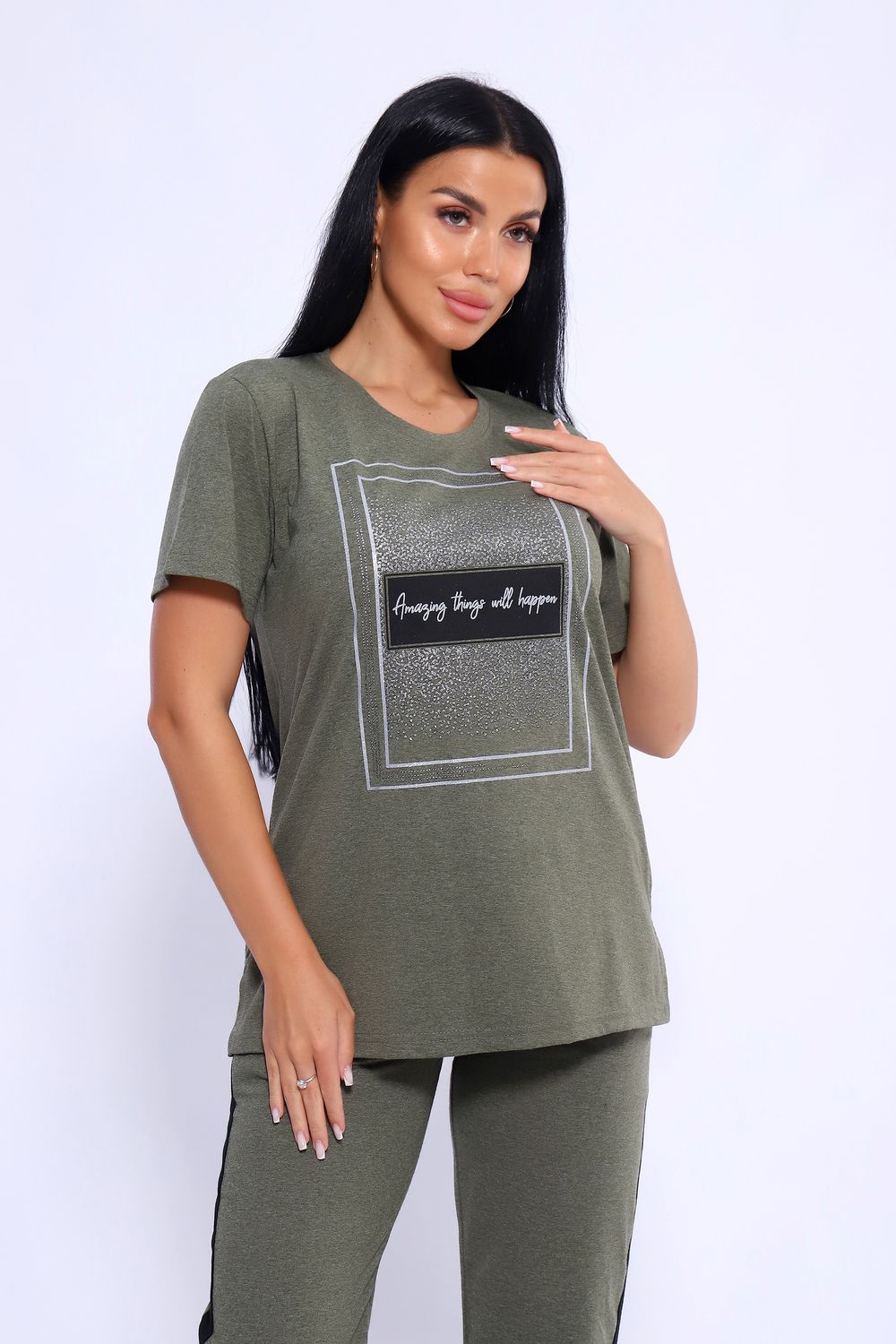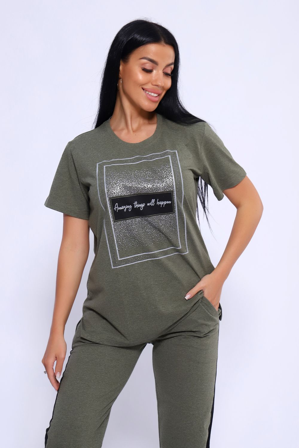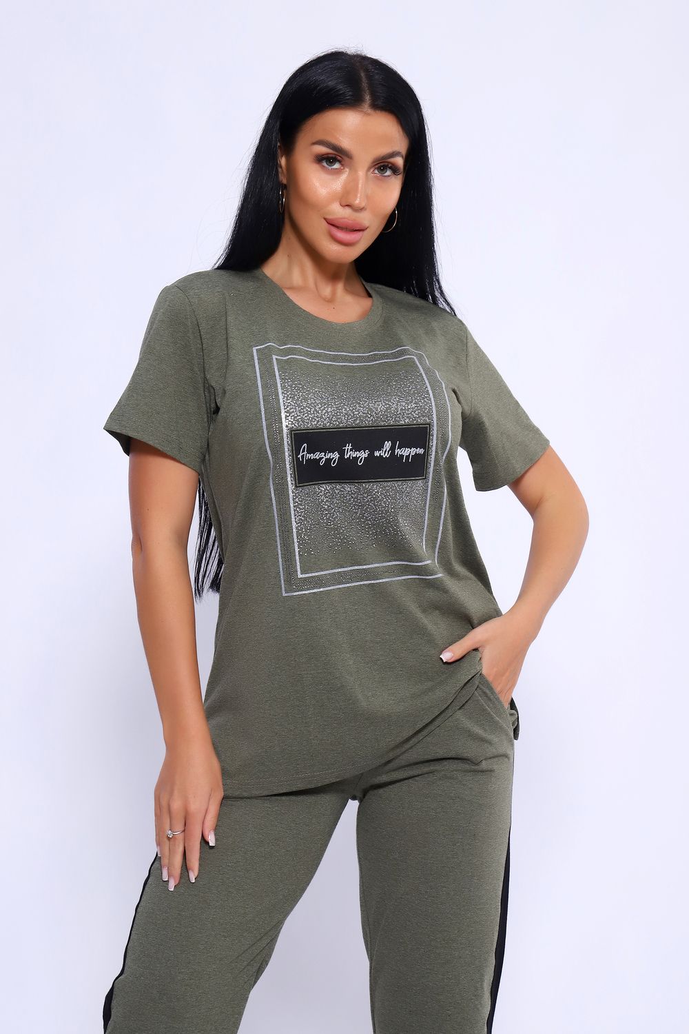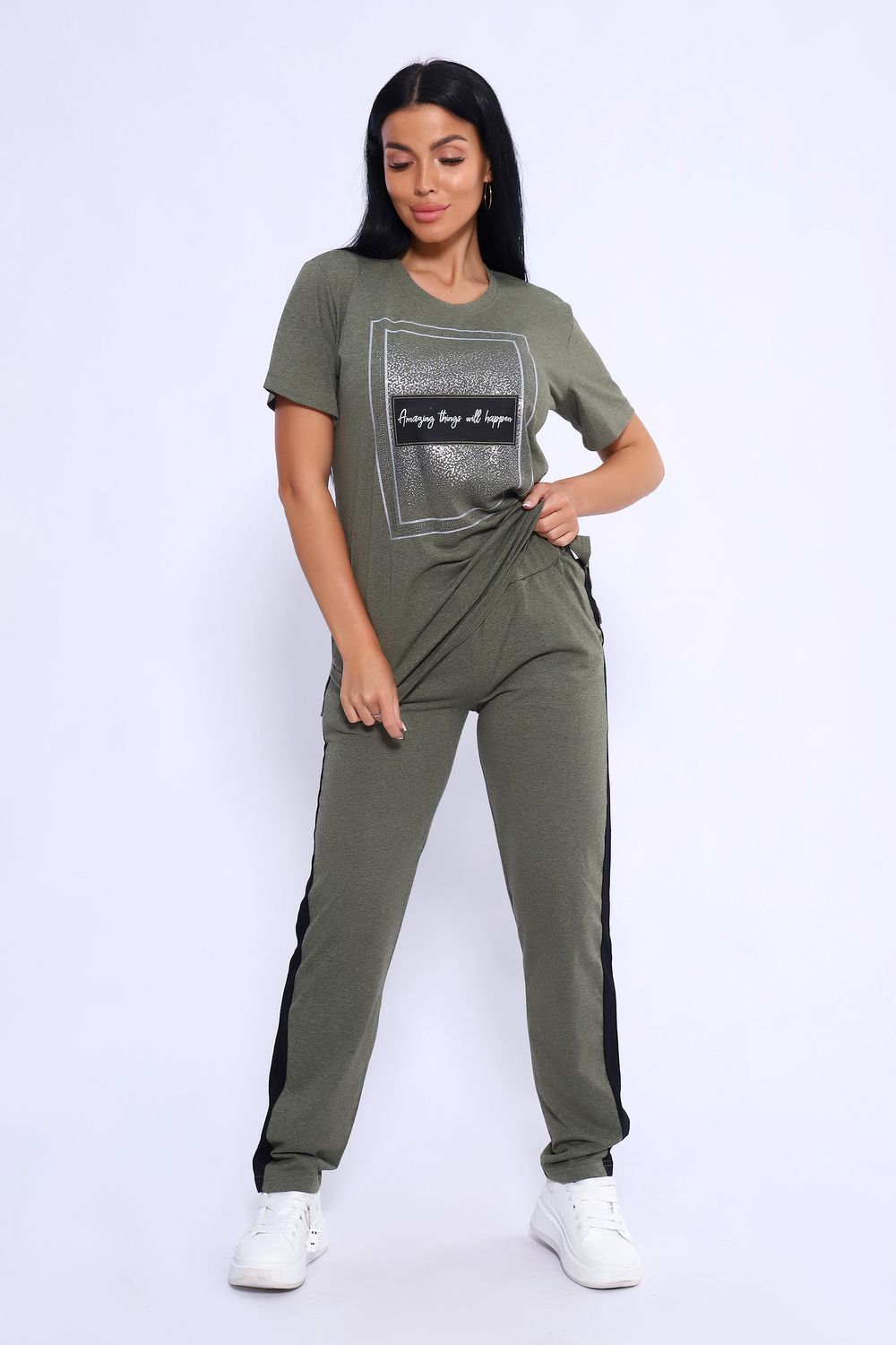 Классический и удобный трикотажный костюм с брюками из легкой хлопковой ткани! В комплекте костюма представлены кофта свободного кроя и брюки универсальной посадки с лампасами по бокам. Кофта украшена лаконичным принтом. Костюм - идеальный вариант домашней одежды для женщин, также прекрасно подойдет и для повседневной носки.