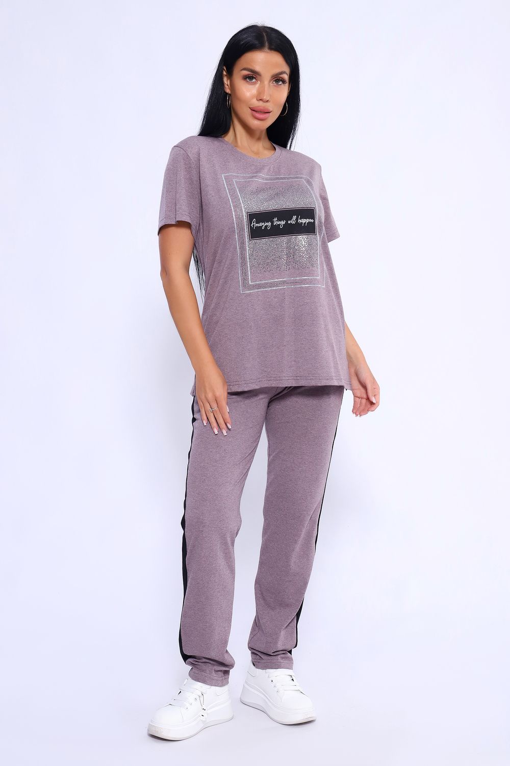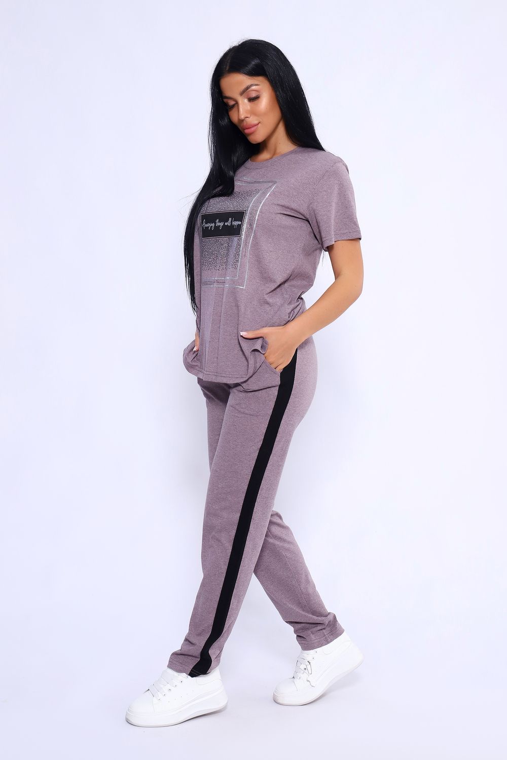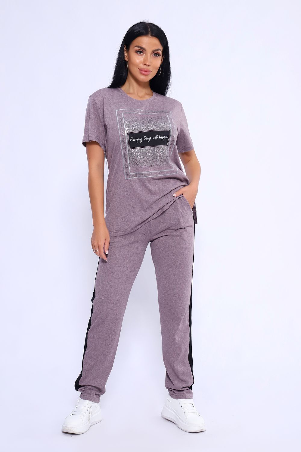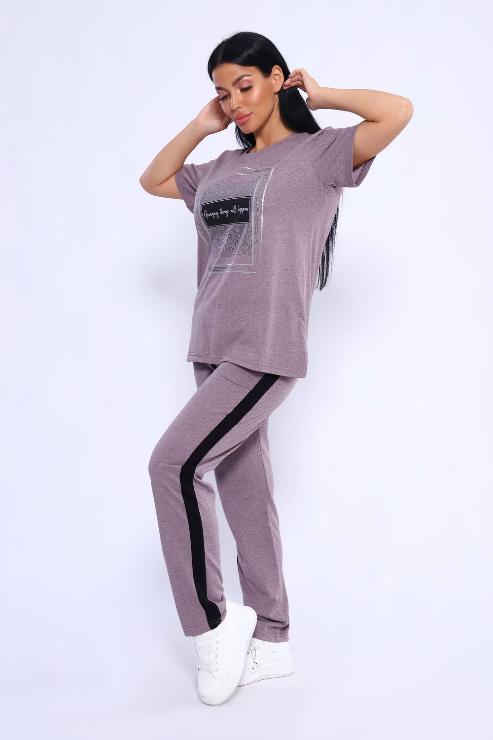 Классический и удобный трикотажный костюм с брюками из легкой хлопковой ткани! В комплекте костюма представлены кофта свободного кроя и брюки универсальной посадки с лампасами по бокам. Кофта украшена лаконичным принтом. Костюм - идеальный вариант домашней одежды для женщин, также прекрасно подойдет и для повседневной носки.
