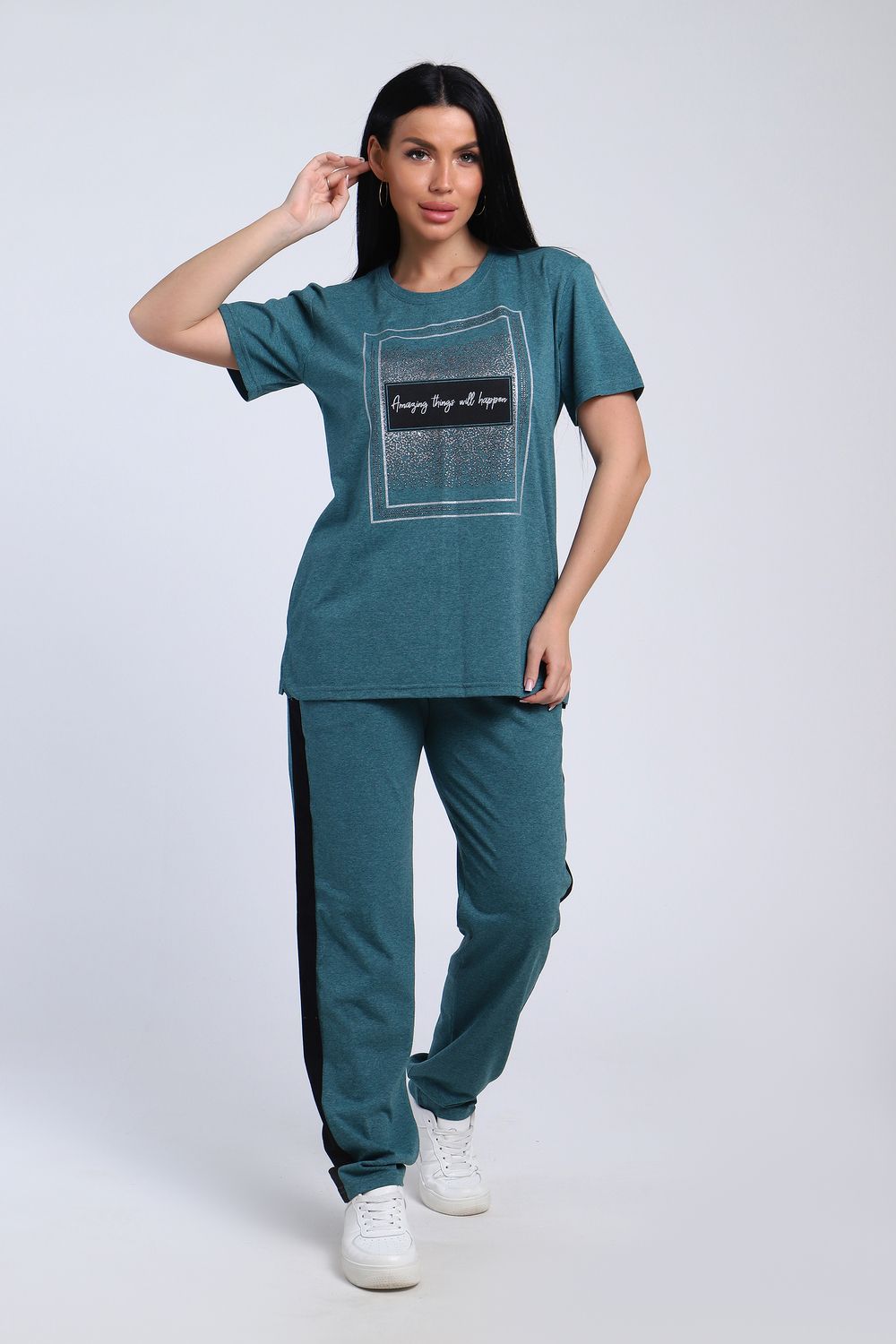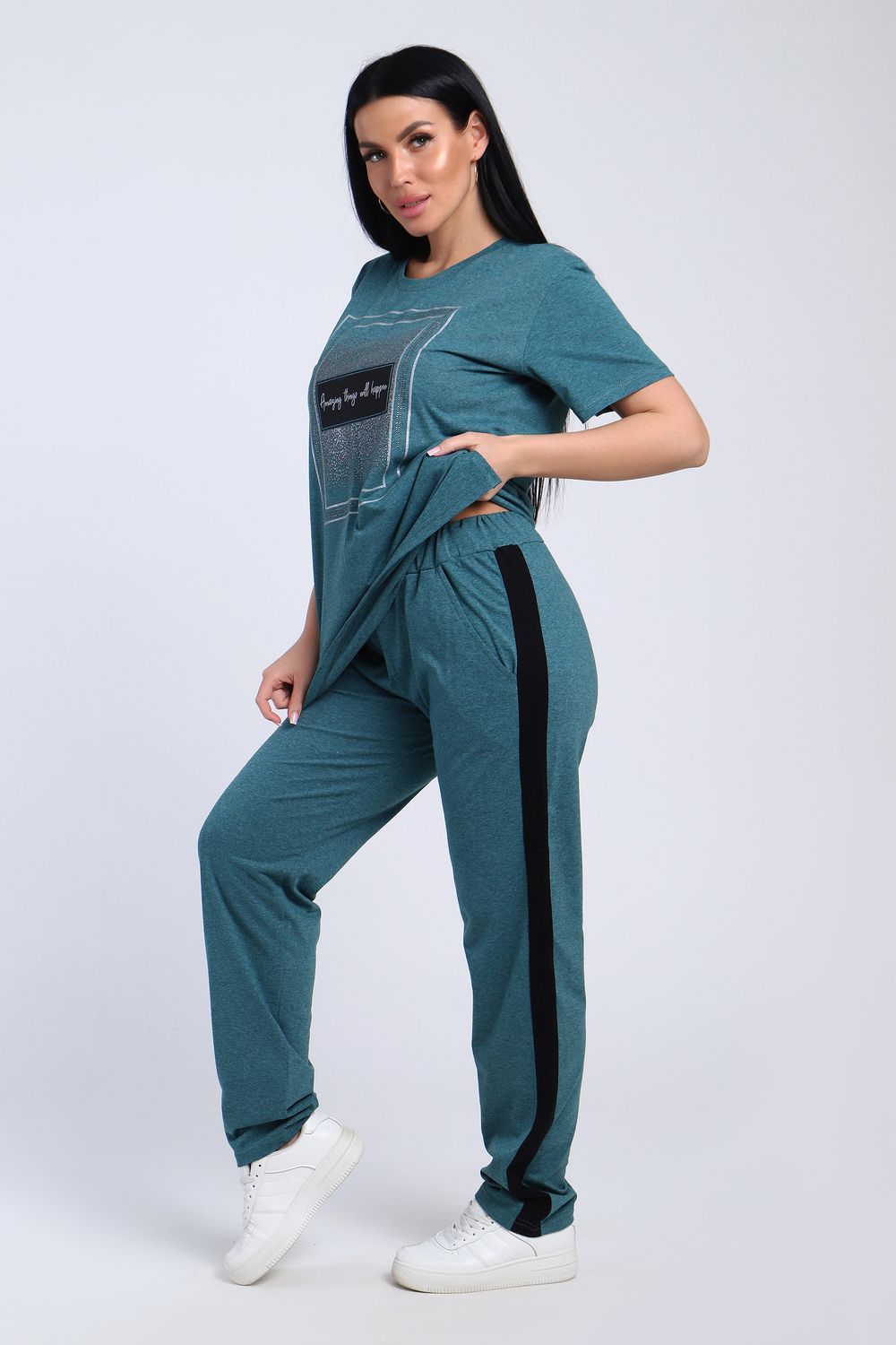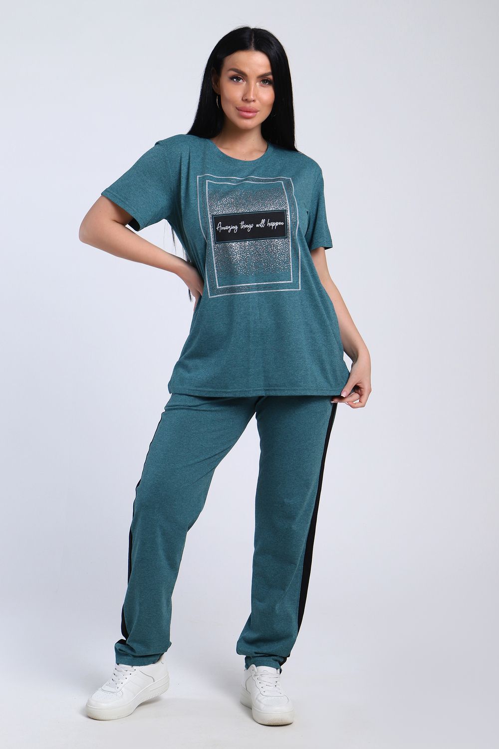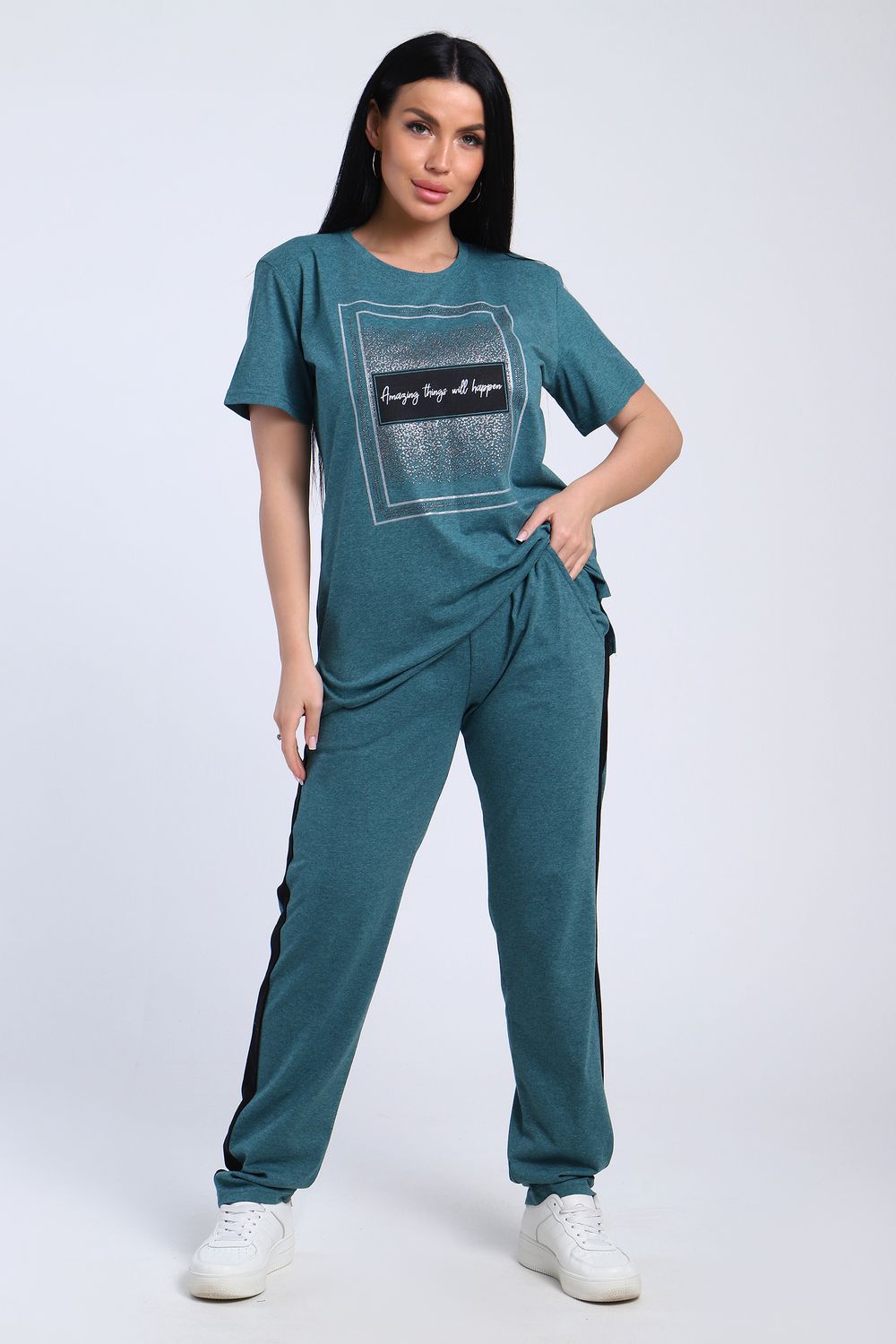Классический и удобный трикотажный костюм с брюками из легкой хлопковой ткани! В комплекте костюма представлены кофта свободного кроя и брюки универсальной посадки с лампасами по бокам. Кофта украшена лаконичным принтом. Костюм - идеальный вариант домашней одежды для женщин, также прекрасно подойдет и для повседневной носки.