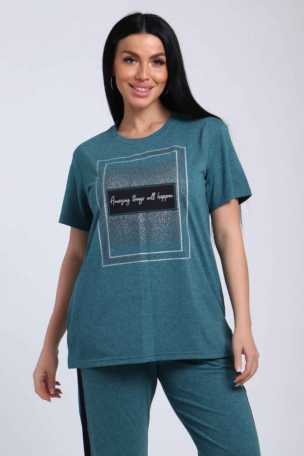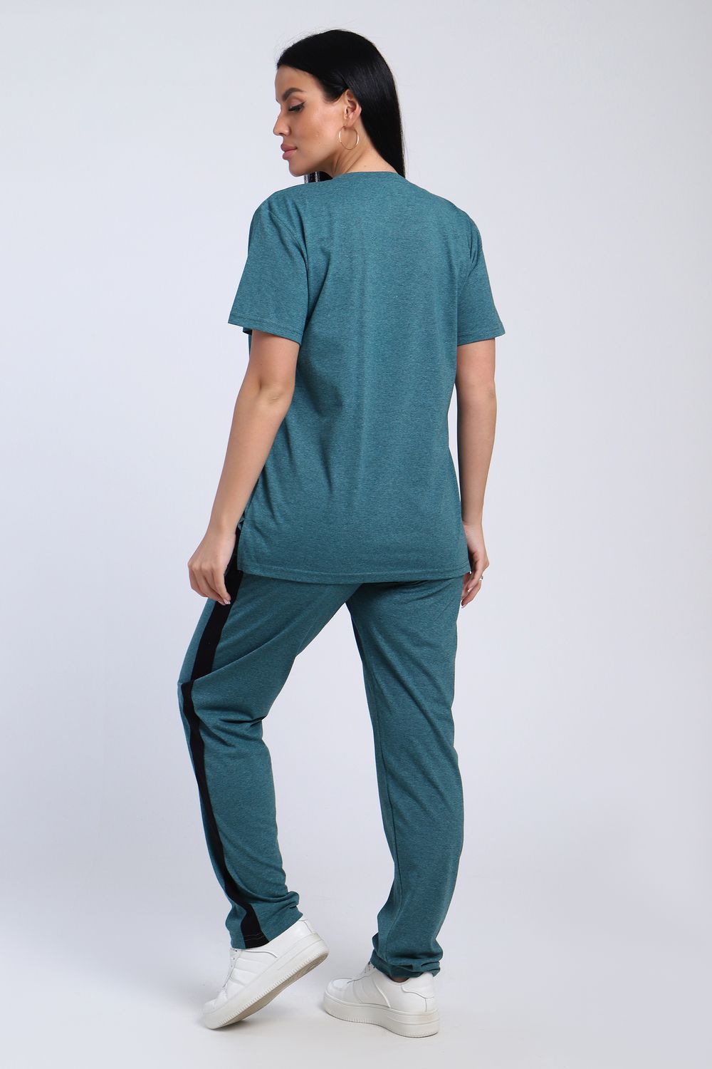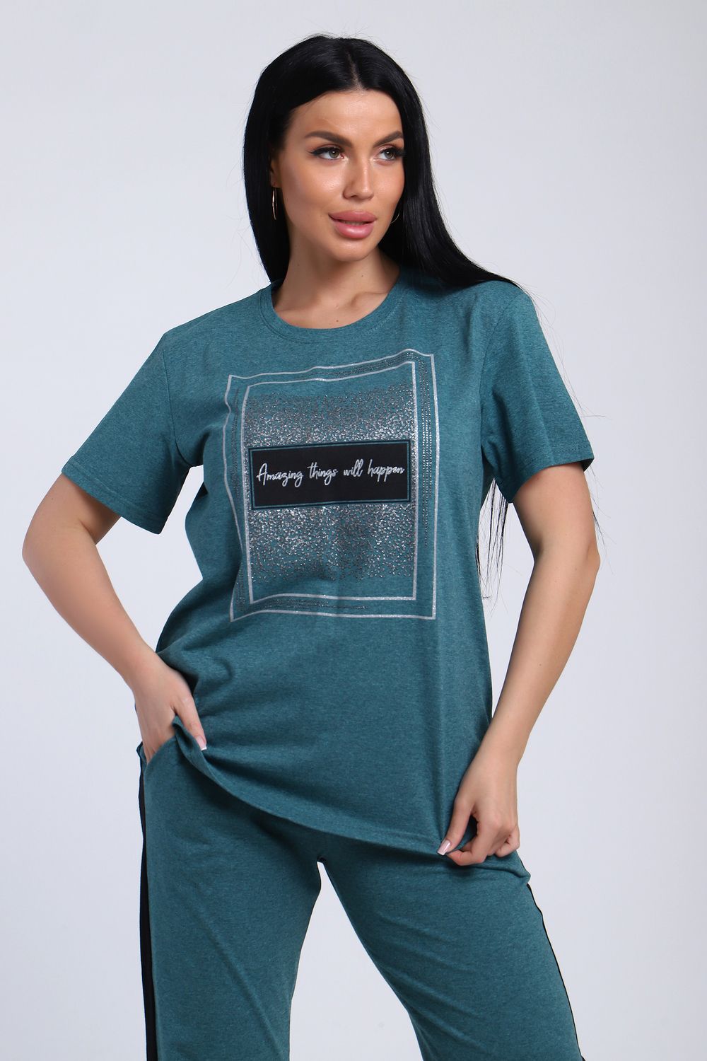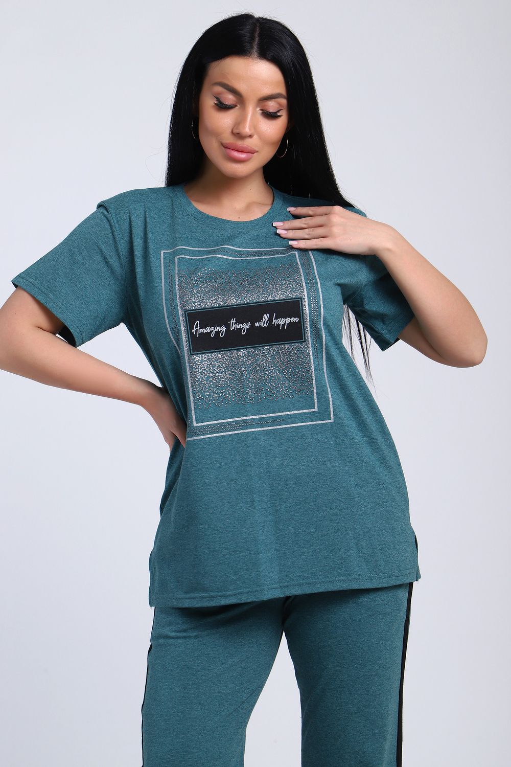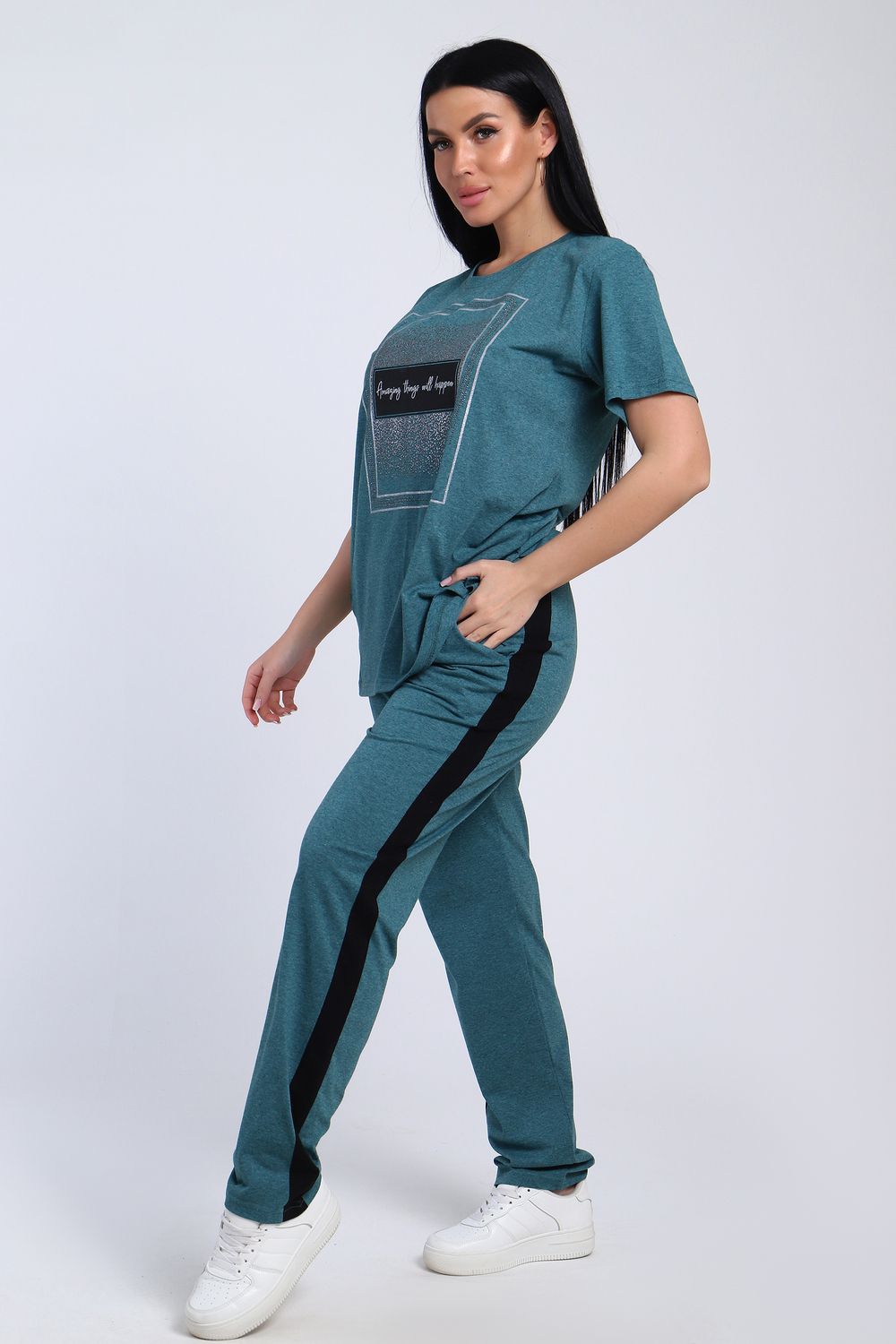 Классический и удобный трикотажный костюм с брюками из легкой хлопковой ткани! В комплекте костюма представлены кофта свободного кроя и брюки универсальной посадки с лампасами по бокам. Кофта украшена лаконичным принтом. Костюм - идеальный вариант домашней одежды для женщин, также прекрасно подойдет и для повседневной носки.