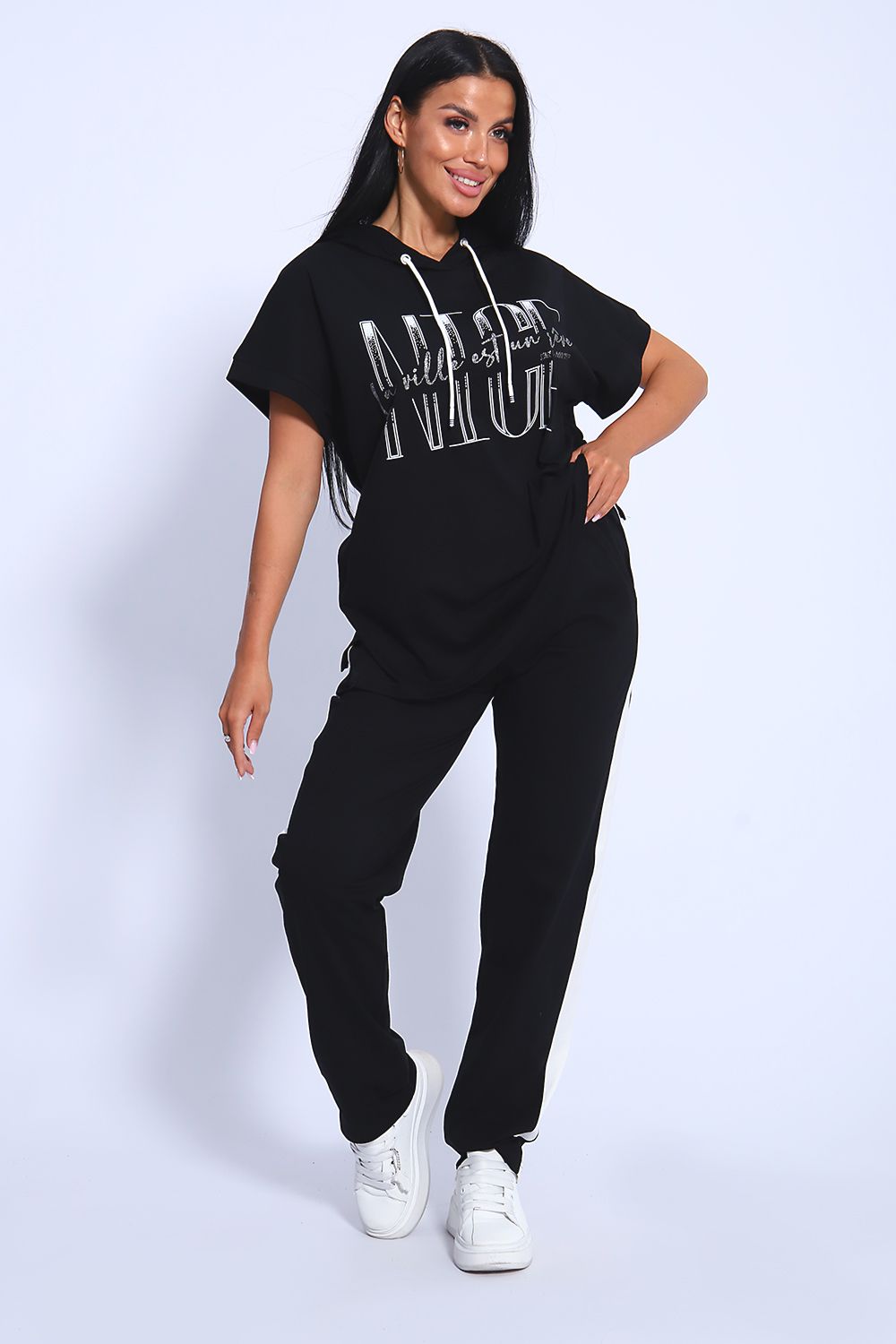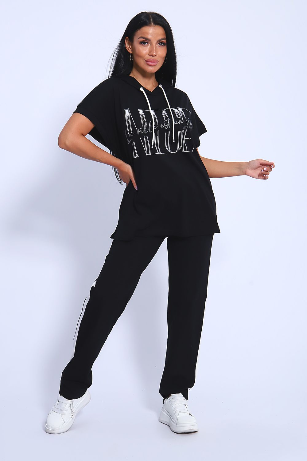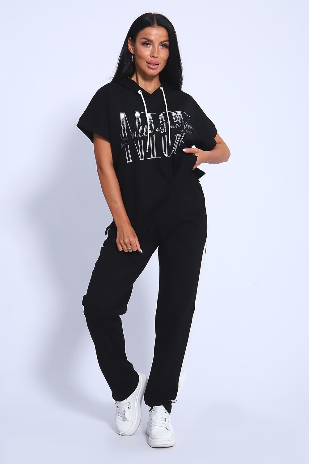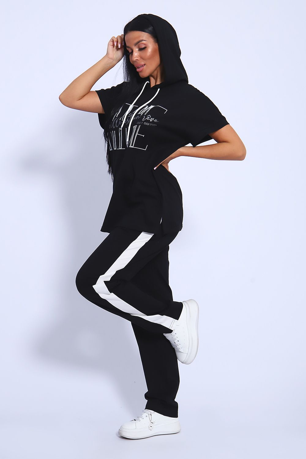 Классический и удобный трикотажный костюм с брюками из 100%-го хлопка! В комплекте костюма представлены кофта свободного кроя с капюшоном и брюки c тонкими лампасами универсальной посадки. Кофта украшена ярким принтом, состоящим из крупных латинских букв, контрастирующими с общим фоном изделия. Костюм - идеальный вариант домашней одежды для женщин, также прекрасно подойдет и для повседневной носки, прогулок и занятий спортом.