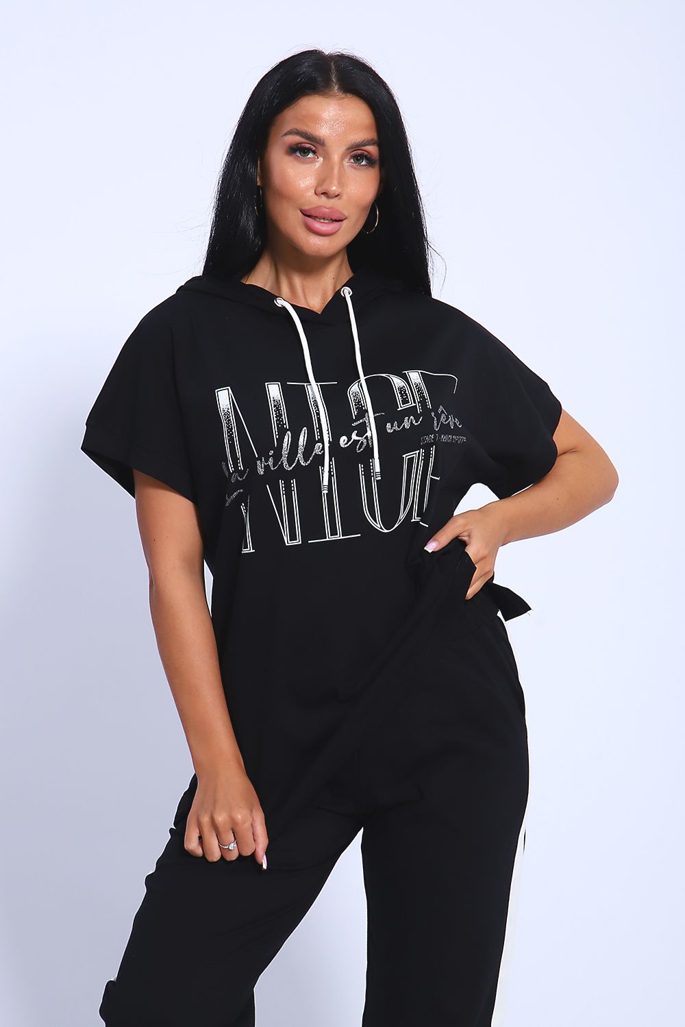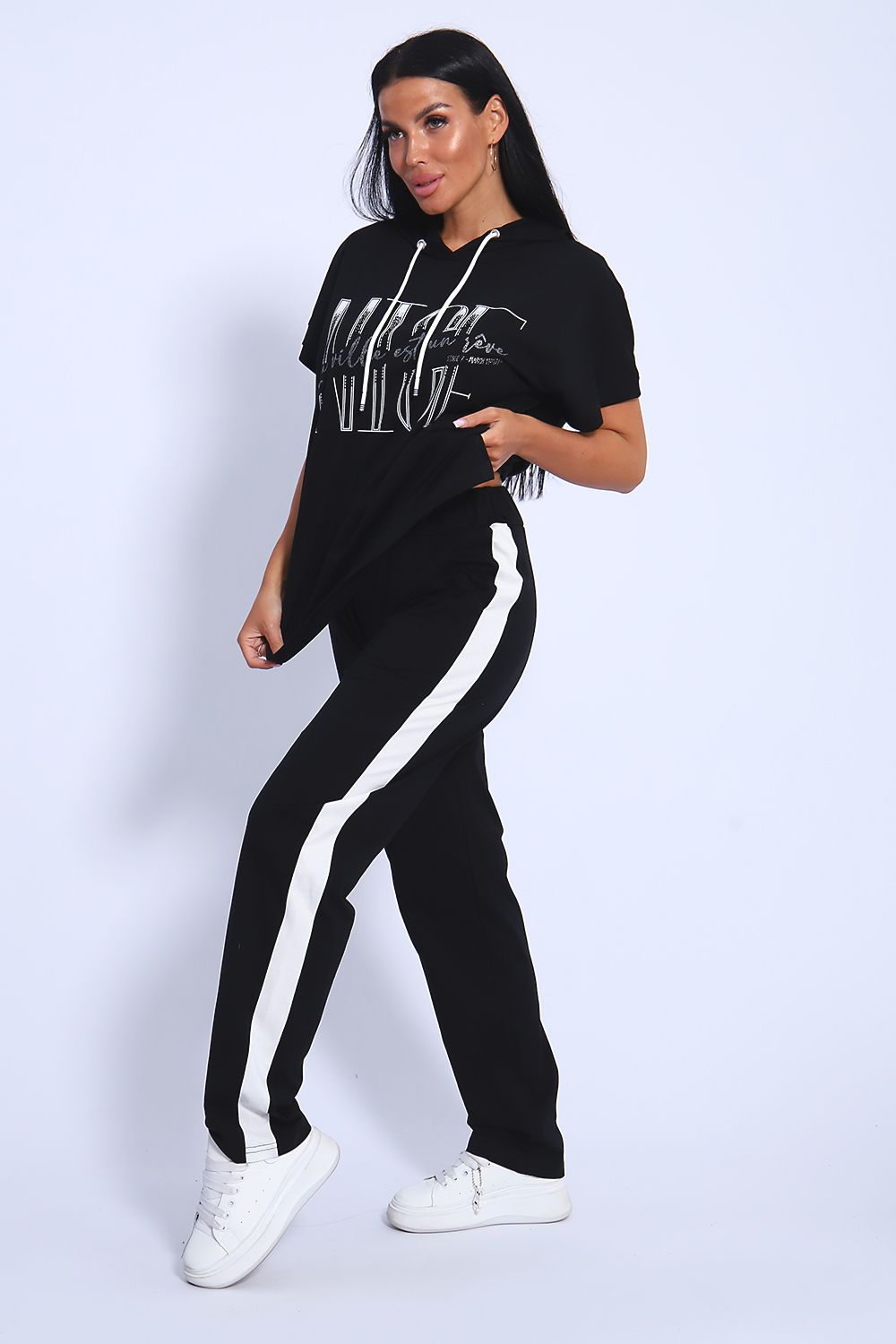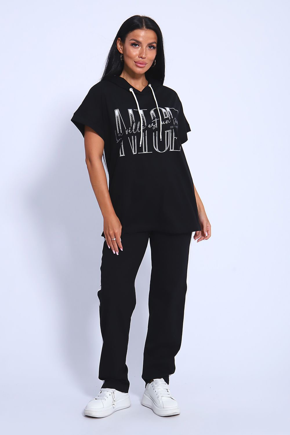 Классический и удобный трикотажный костюм с брюками из 100%-го хлопка! В комплекте костюма представлены кофта свободного кроя с капюшоном и брюки c тонкими лампасами универсальной посадки. Кофта украшена ярким принтом, состоящим из крупных латинских букв, контрастирующими с общим фоном изделия. Костюм - идеальный вариант домашней одежды для женщин, также прекрасно подойдет и для повседневной носки, прогулок и занятий спортом.
