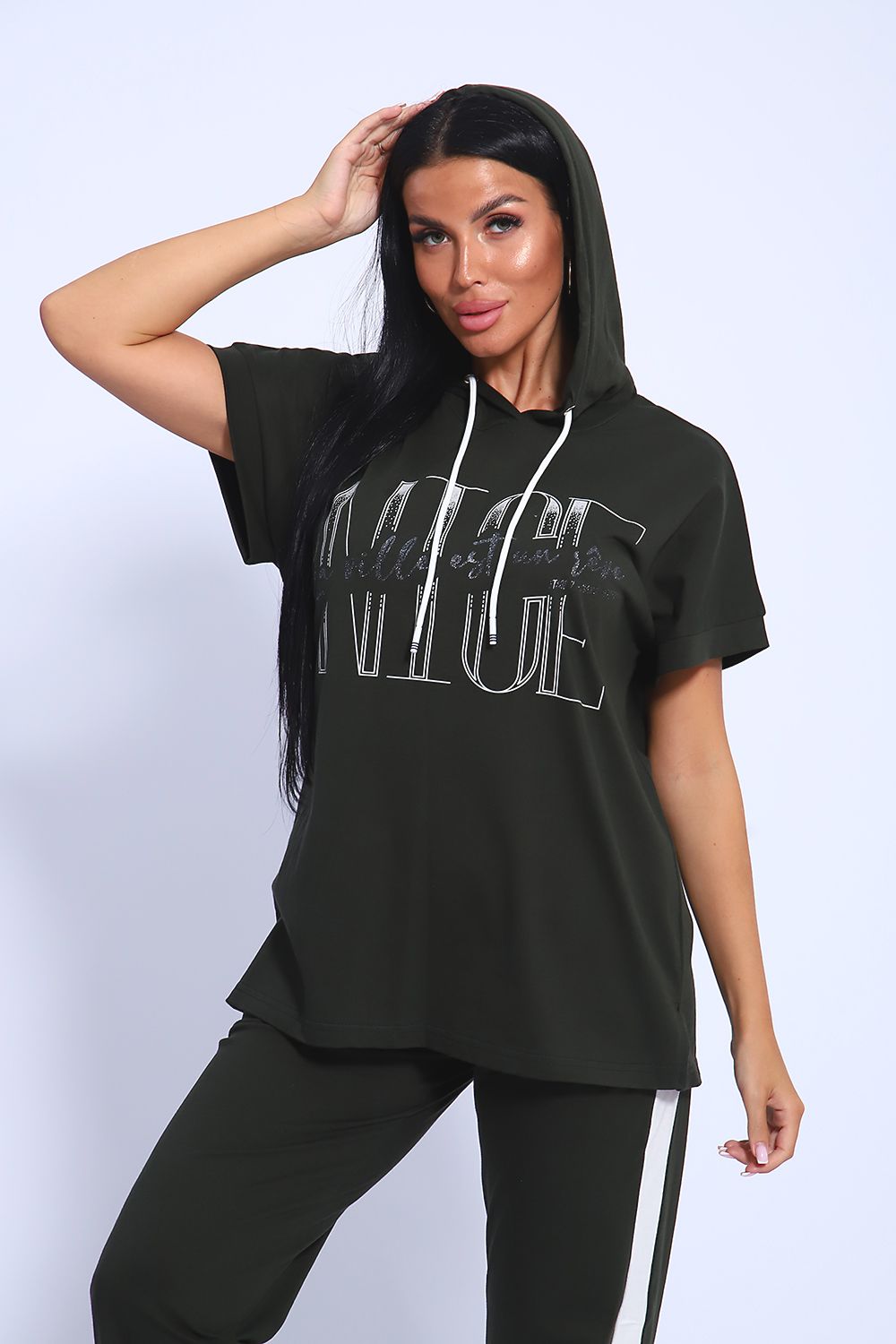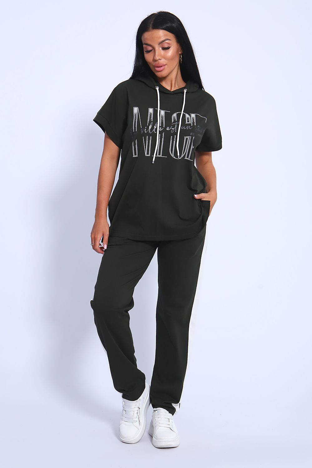 Классический и удобный трикотажный костюм с брюками из 100%-го хлопка! В комплекте костюма представлены кофта свободного кроя с капюшоном и брюки c тонкими лампасами универсальной посадки. Кофта украшена ярким принтом, состоящим из крупных латинских букв, контрастирующими с общим фоном изделия. Костюм - идеальный вариант домашней одежды для женщин, также прекрасно подойдет и для повседневной носки, прогулок и занятий спортом.