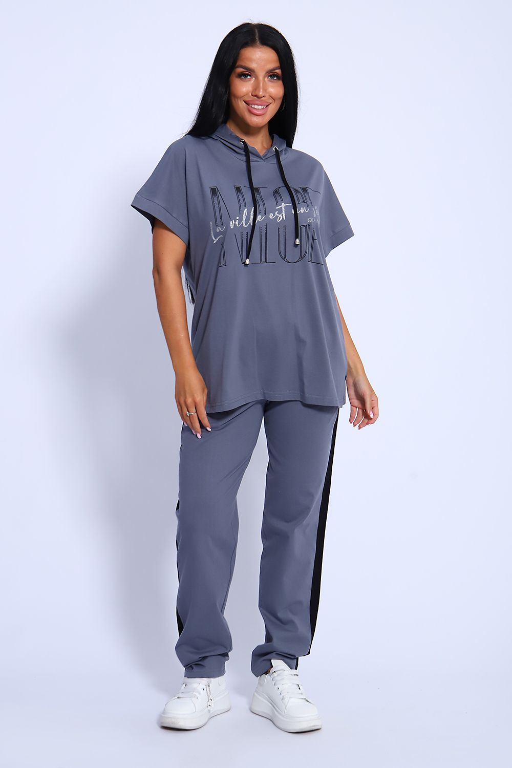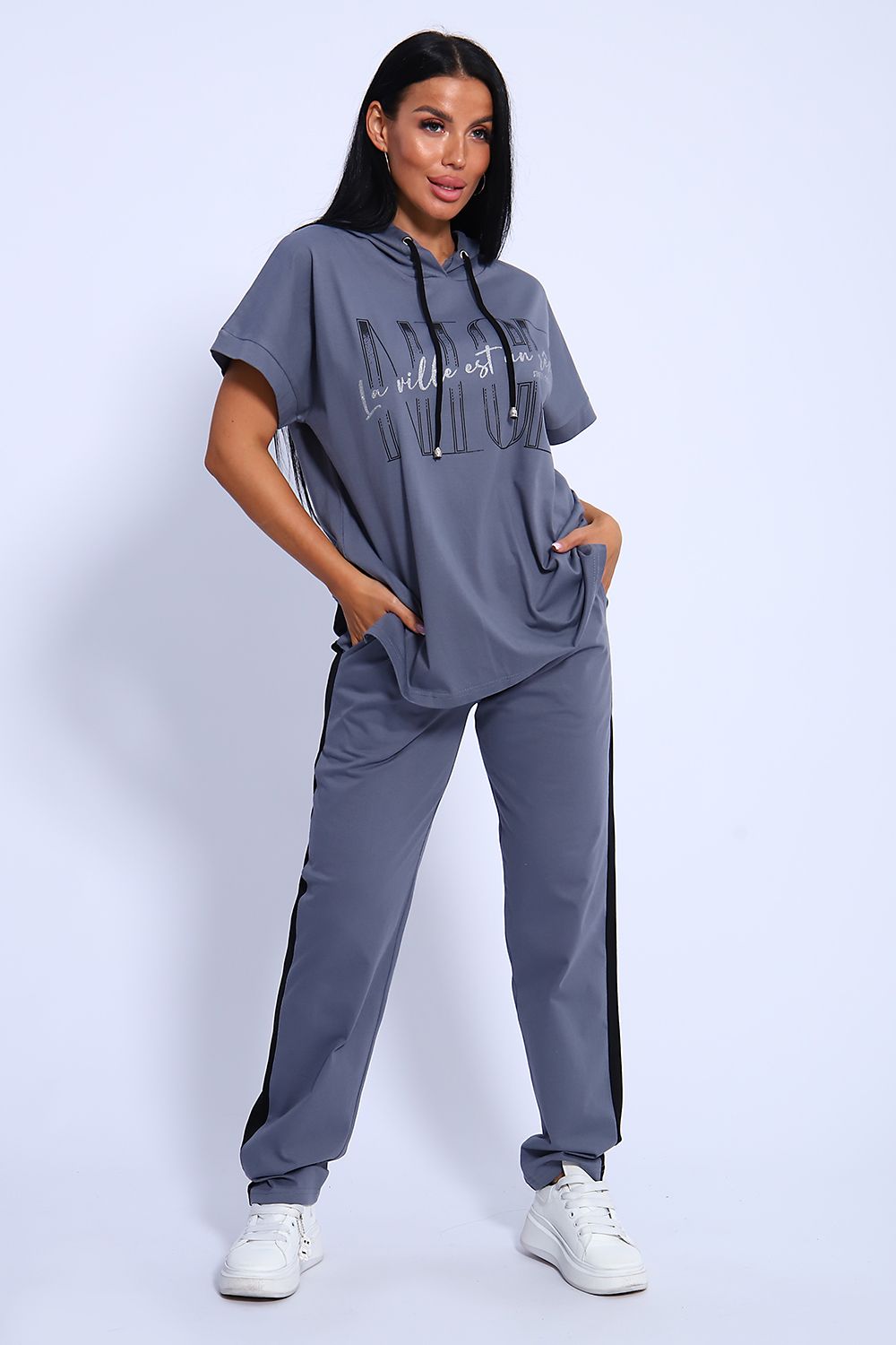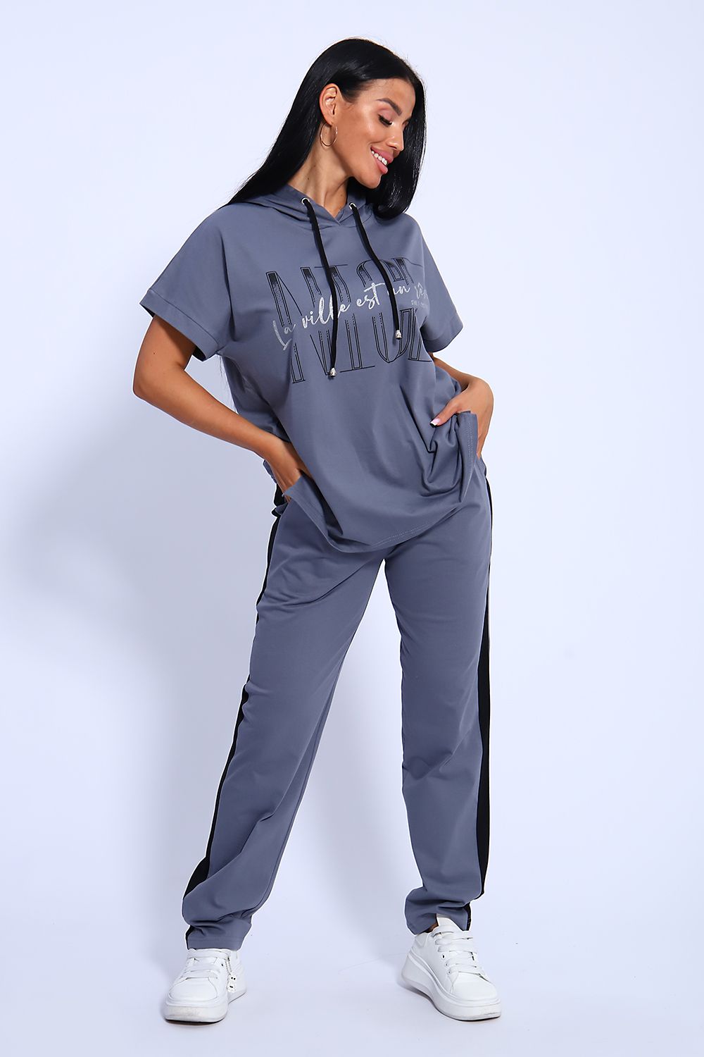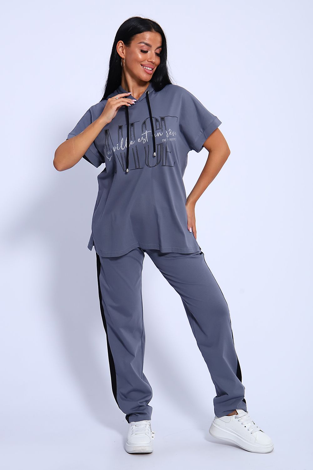 Классический и удобный трикотажный костюм с брюками из 100%-го хлопка! В комплекте костюма представлены кофта свободного кроя с капюшоном и брюки c тонкими лампасами универсальной посадки. Кофта украшена ярким принтом, состоящим из крупных латинских букв, контрастирующими с общим фоном изделия. Костюм - идеальный вариант домашней одежды для женщин, также прекрасно подойдет и для повседневной носки, прогулок и занятий спортом.