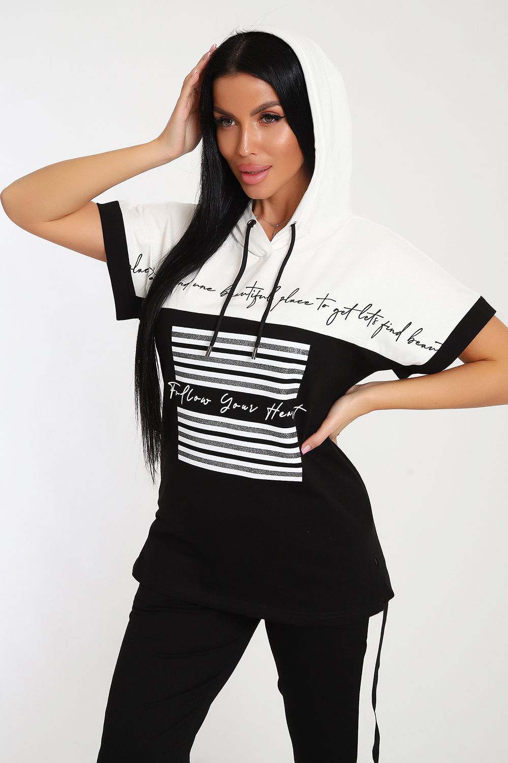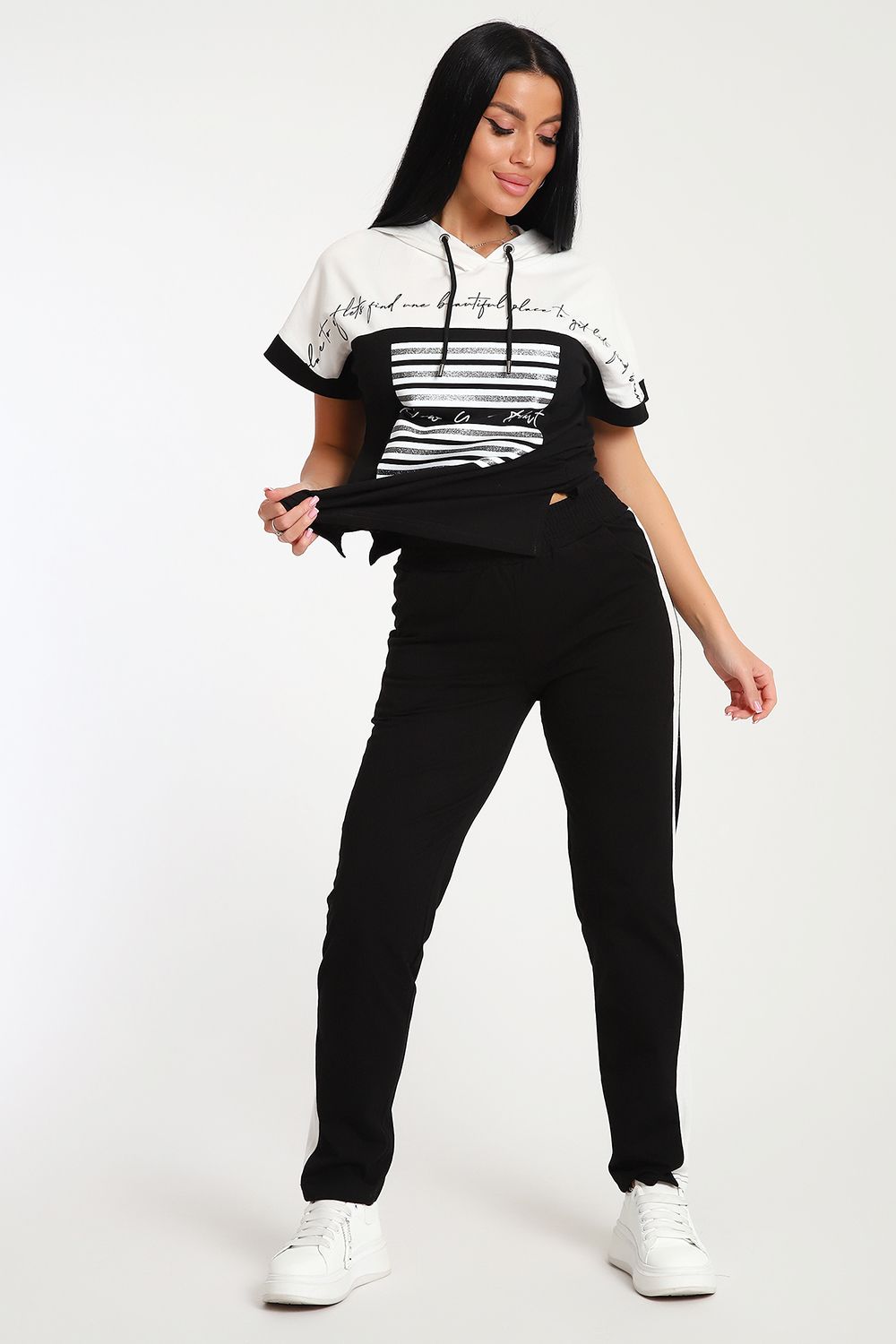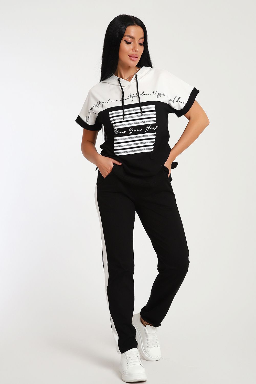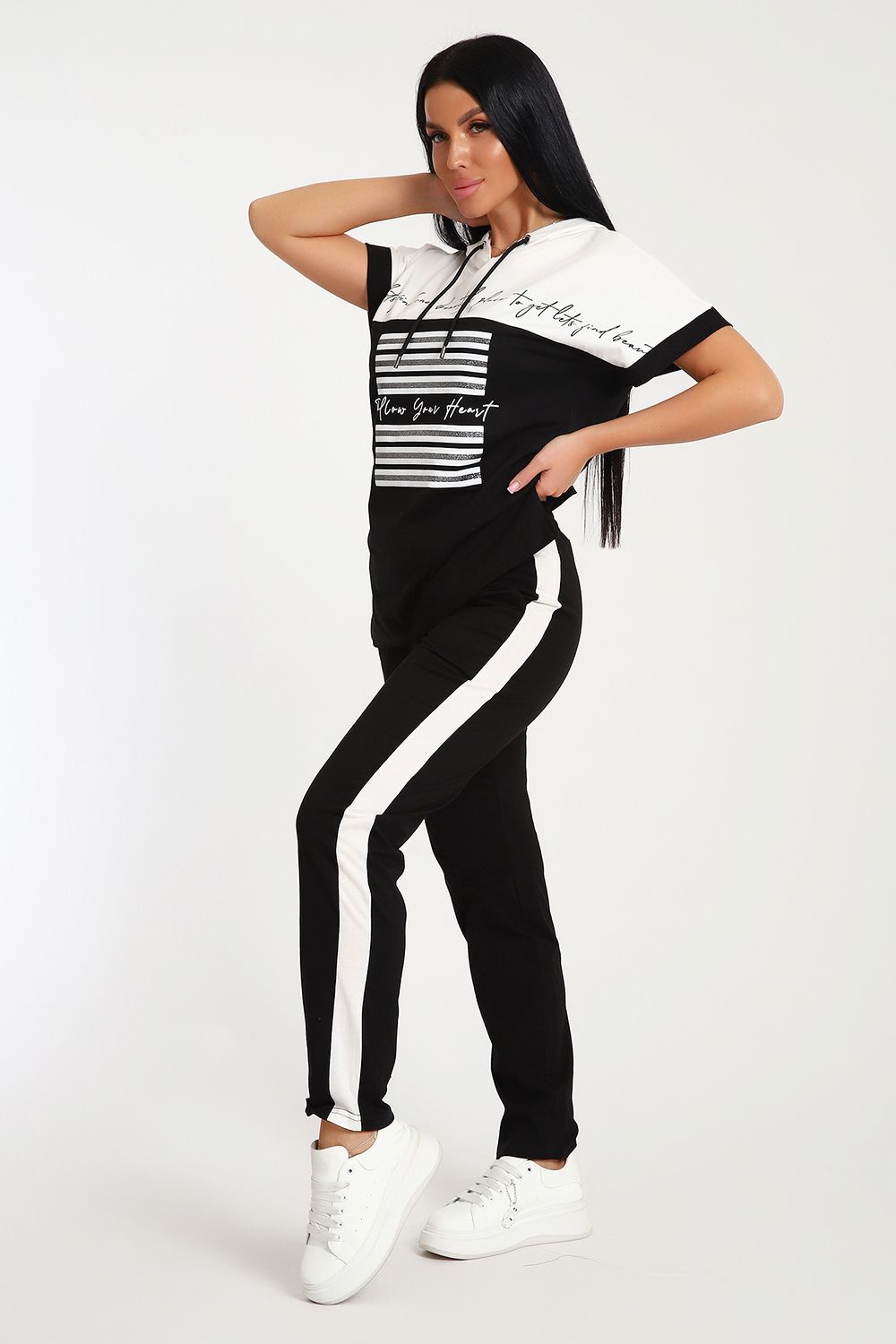 Невероятно женственный и стильный костюм из нежного хлопкового трикотажа, превосходно подходящий для повседневной носки, представляет собой гармонию элегантности и функциональности. Тщательный подход к деталям проявляется в каждой части этого комплекта- капюшон, декорированный изящными лентами контрастного цвета, придает дополнительное очарование, а аккуратно изготовленные швы подчеркивают премиальный уровень исполнения.