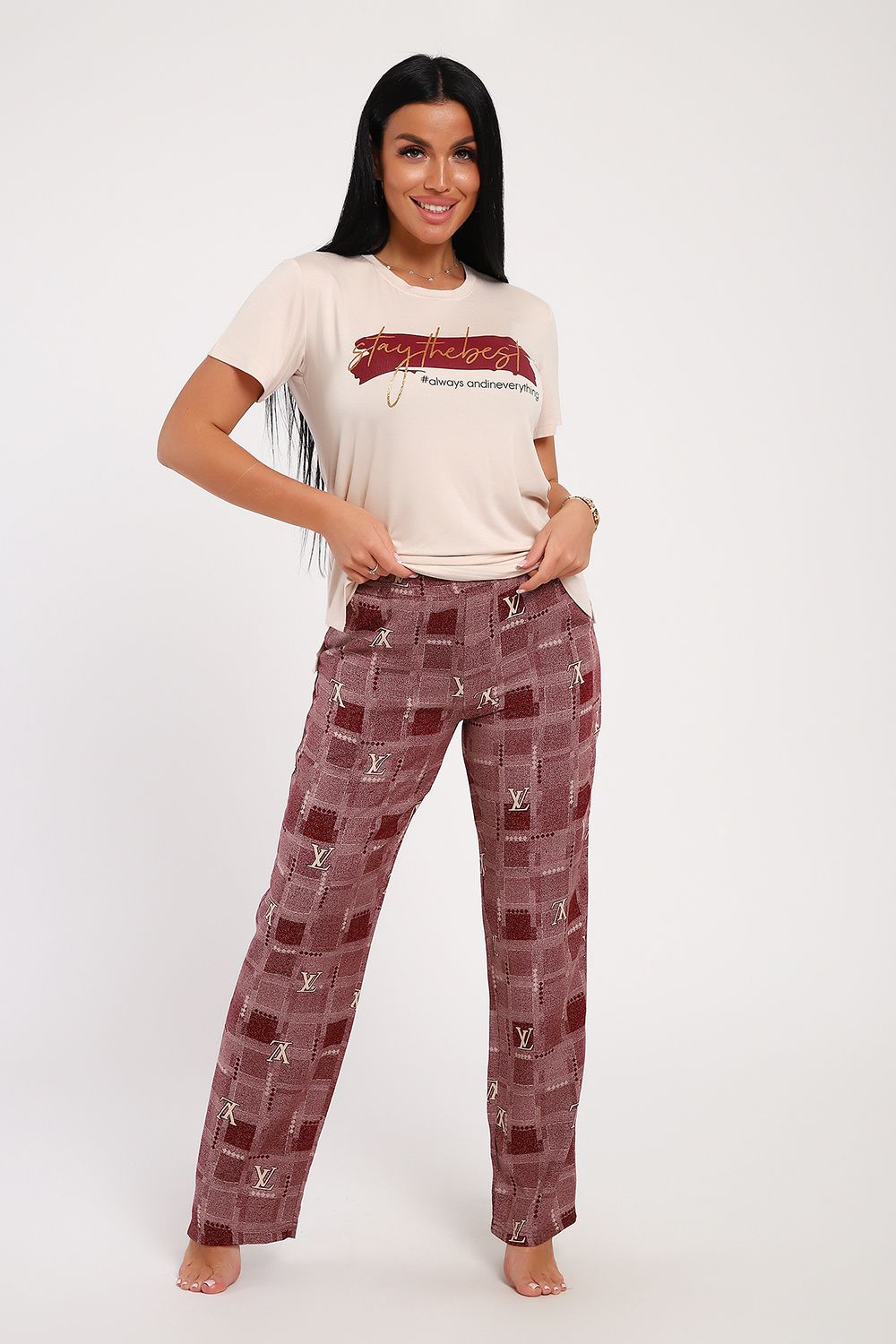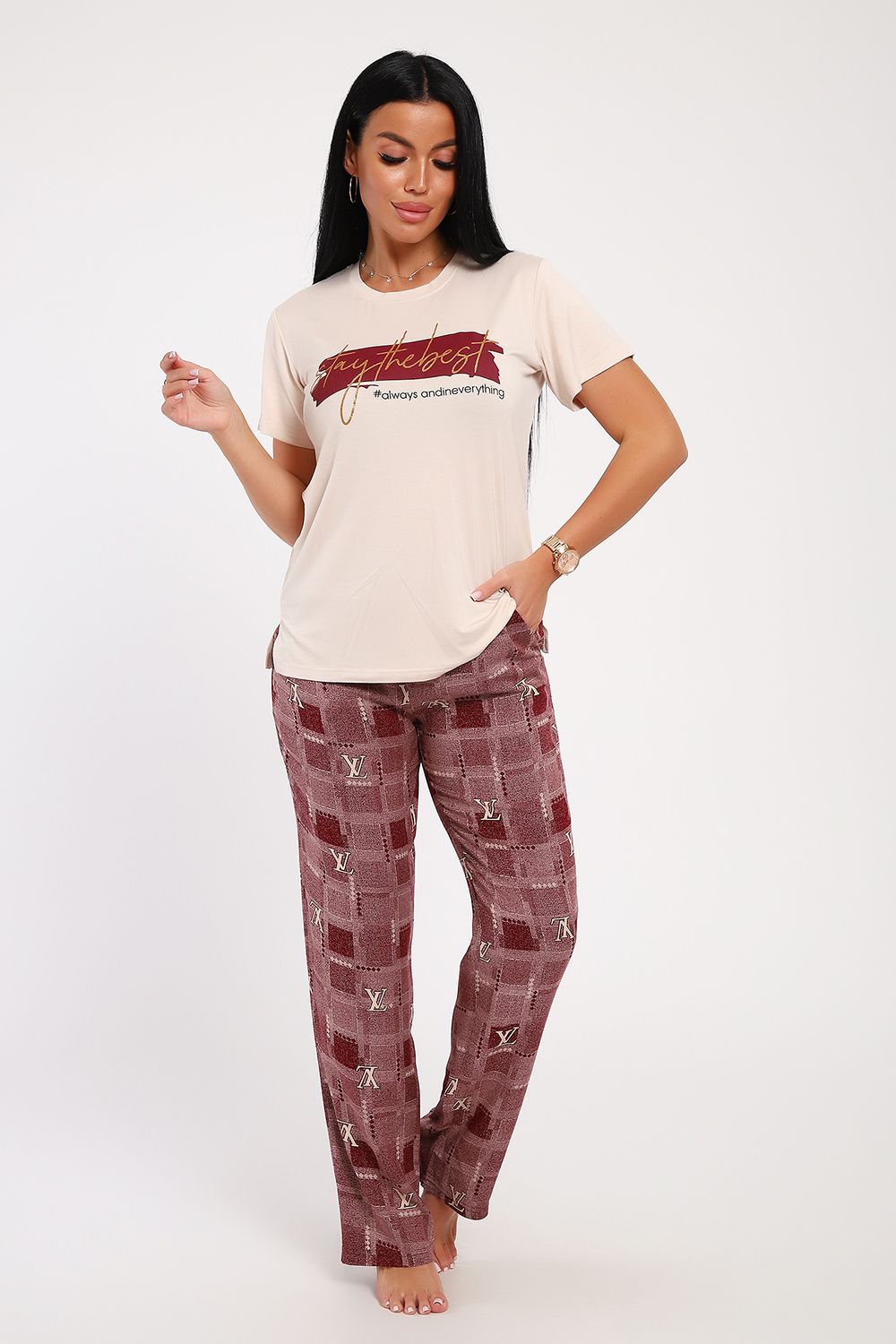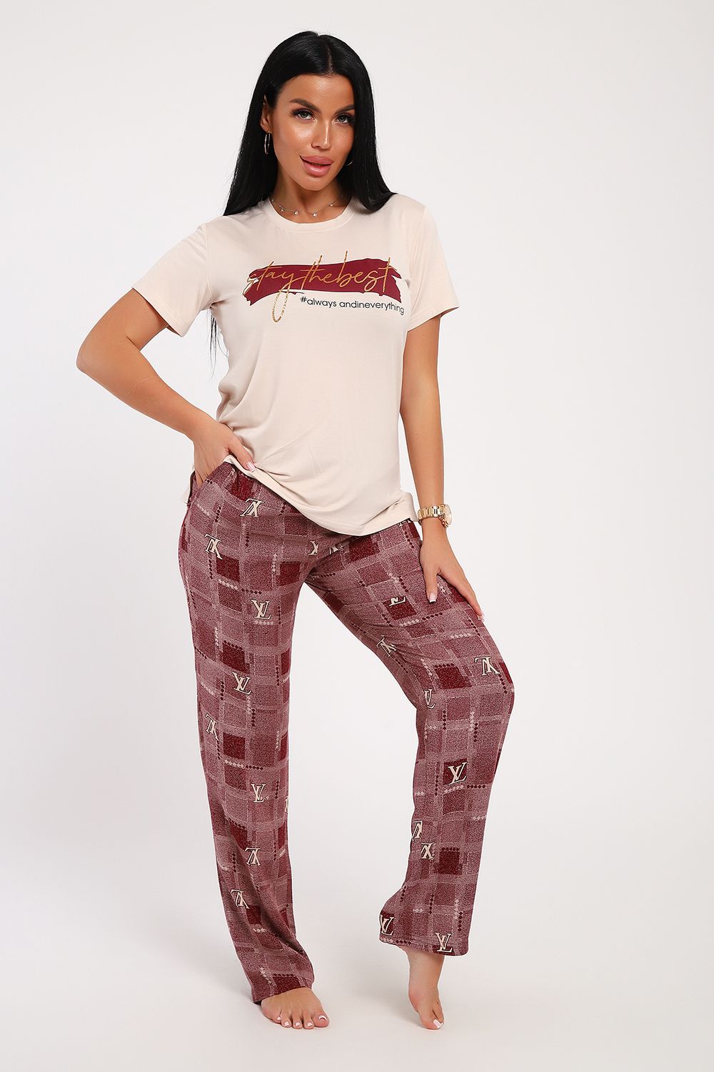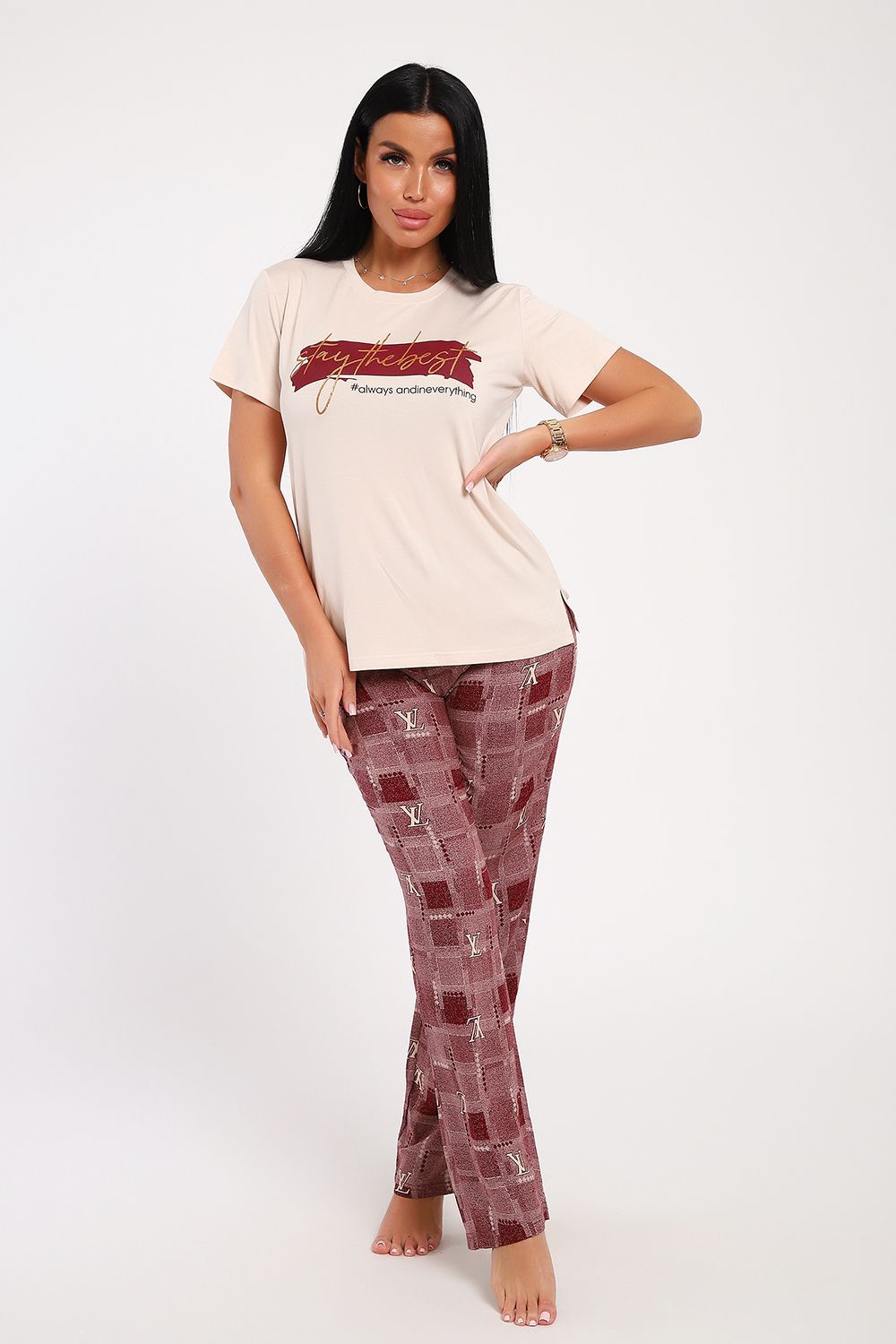 Классический и удобный трикотажный костюм с брюками из легкой хлопковой ткани динамичной расцветки! В комплекте костюма представлены кофта свободного кроя и брюки универсальной посадки Изюминкой костюма служит контраст верхи и низа -кофта нежного кремового оттенка и украшена лаконичным принтом, в тон расцветки брюк, которые сшиты из яркой, многоцветной ткани. универсальность костюма в том, что это идеальный вариант как домашней одежды для женщин, так и прекрасно подойдет для повседневной носки или одежды для сна.